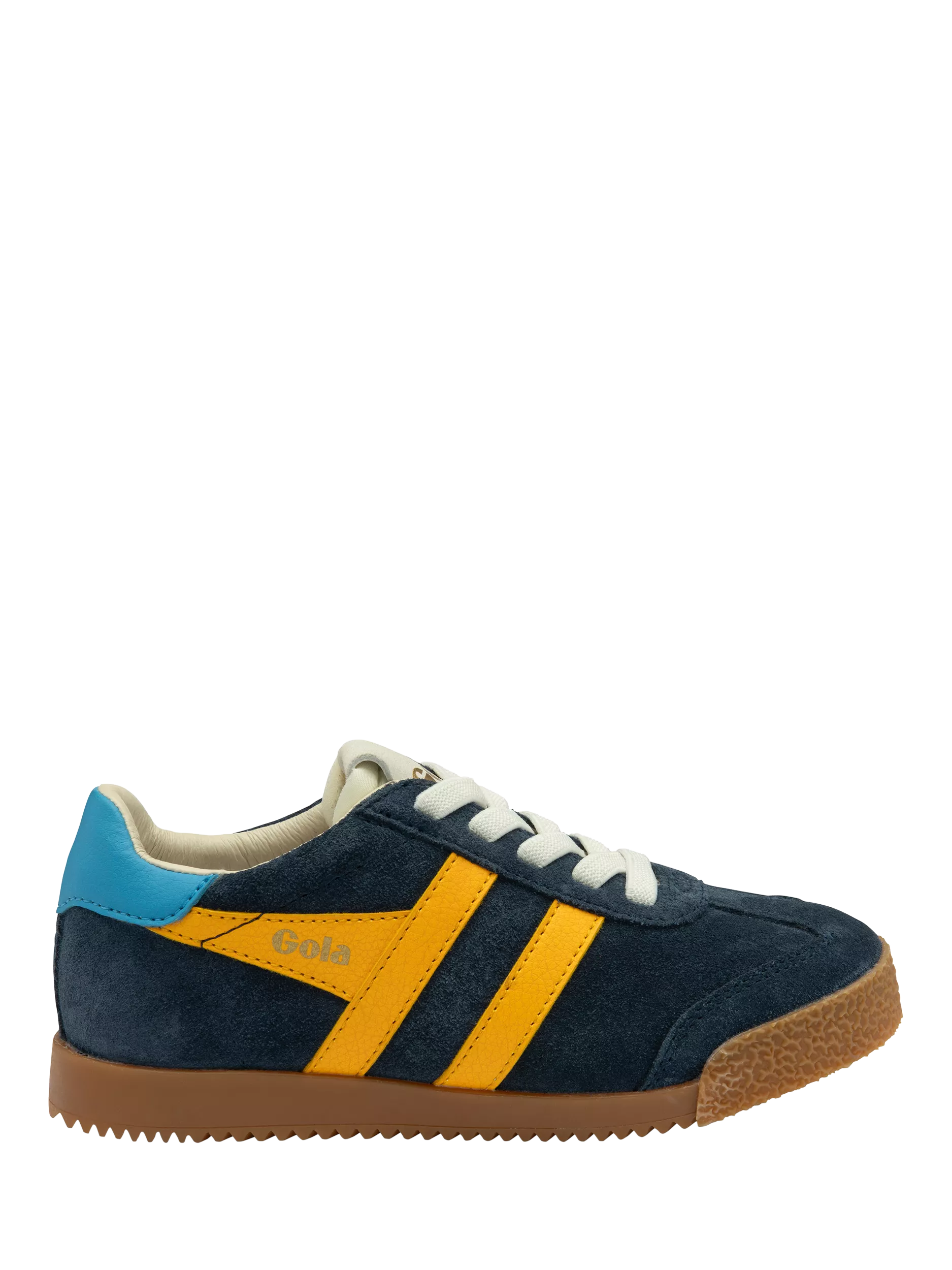 Today, it features modern, vibrant colour combinations. Gola Elan boasts a suede upper with a contrasting wingflash and heel tab. A fun, retro look for youngsters. Additional features include a gum sole unit, elasticated laces for easy on/off and iconic Gola wingflash branding.