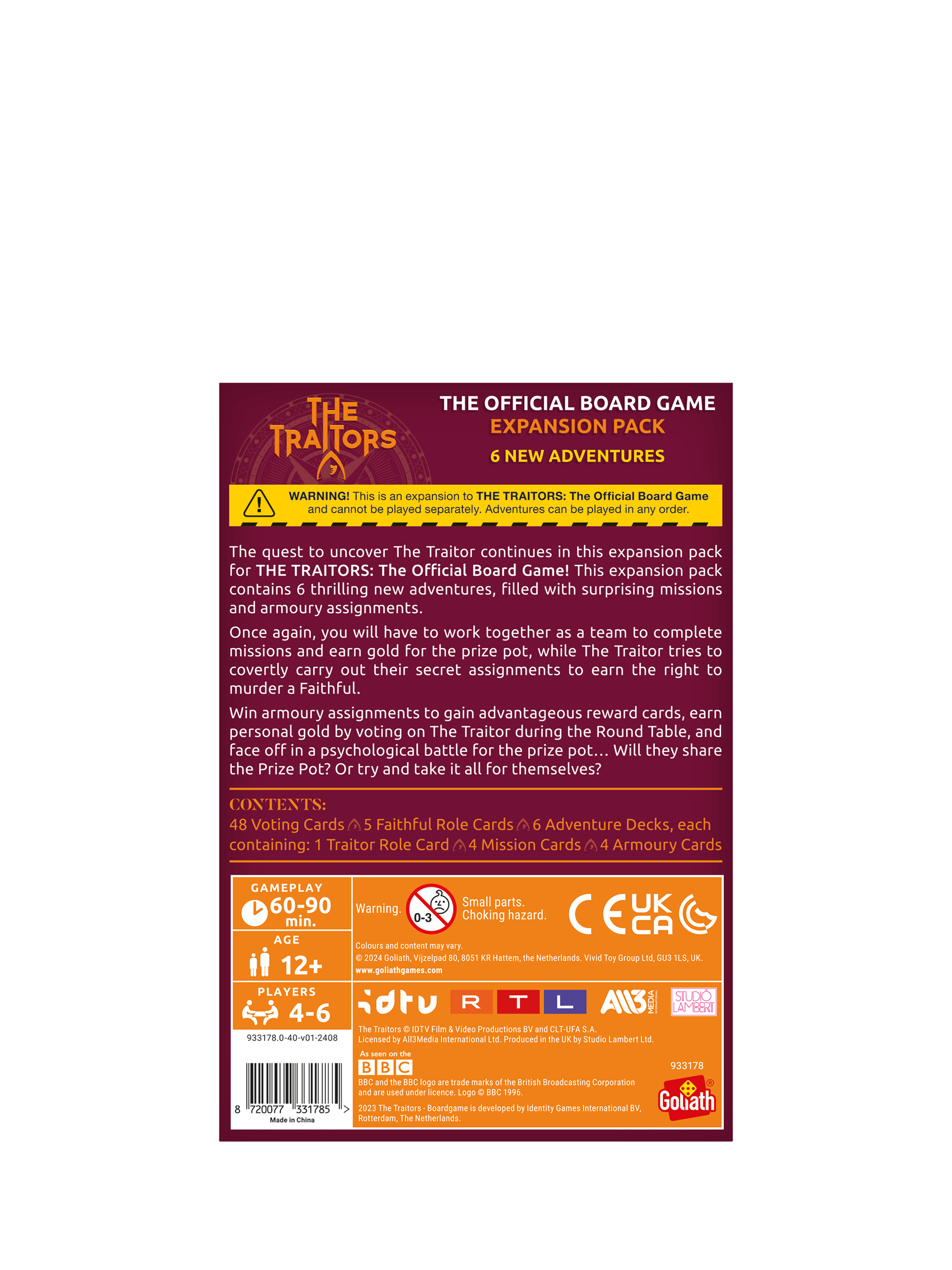 The quest to uncover The Traitors continues in this expansion pack for The Traitors: The Official Board Game! This expansion pack contains 6 thrilling new adventures, filled with surprising missions and armoury assignments. Once again, you will have to work together as a team to complete missions and earn gold for the prize pit, while The Traitors try to covertly carry out their secret assignments to earn the right to murder a Faithful. With armoury assignments to gain advantageous reward cards, earn personal gold by voting on The Traitor during the Round Table, and face off in a psychological battle for the prize pot. Will they share the prize pot? Or try and take it all for themselves?
