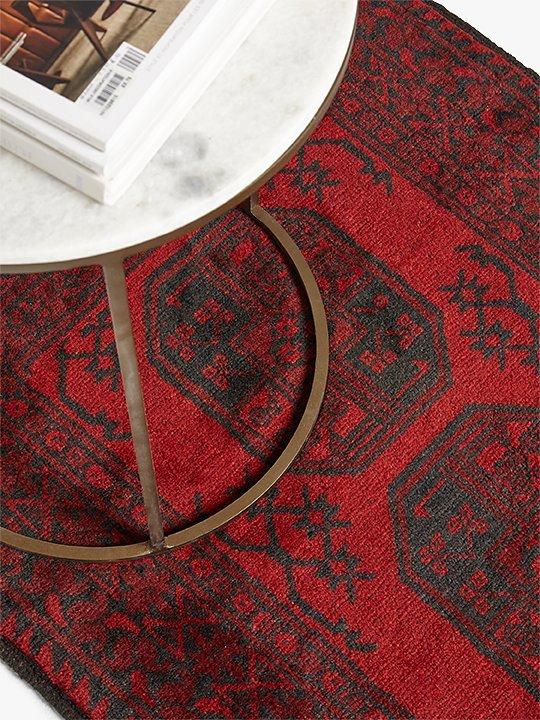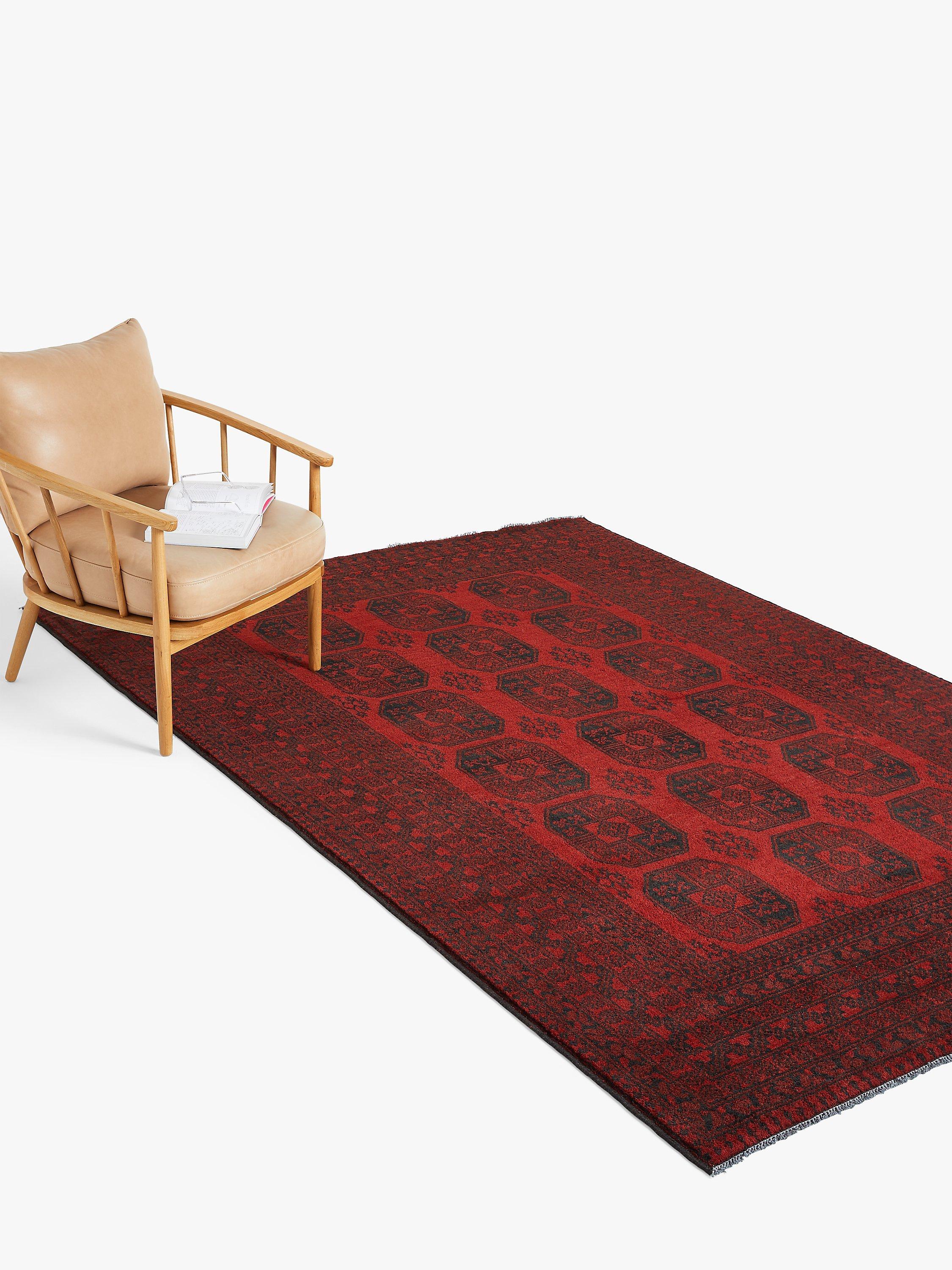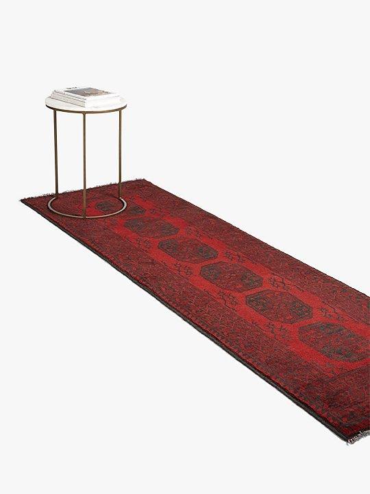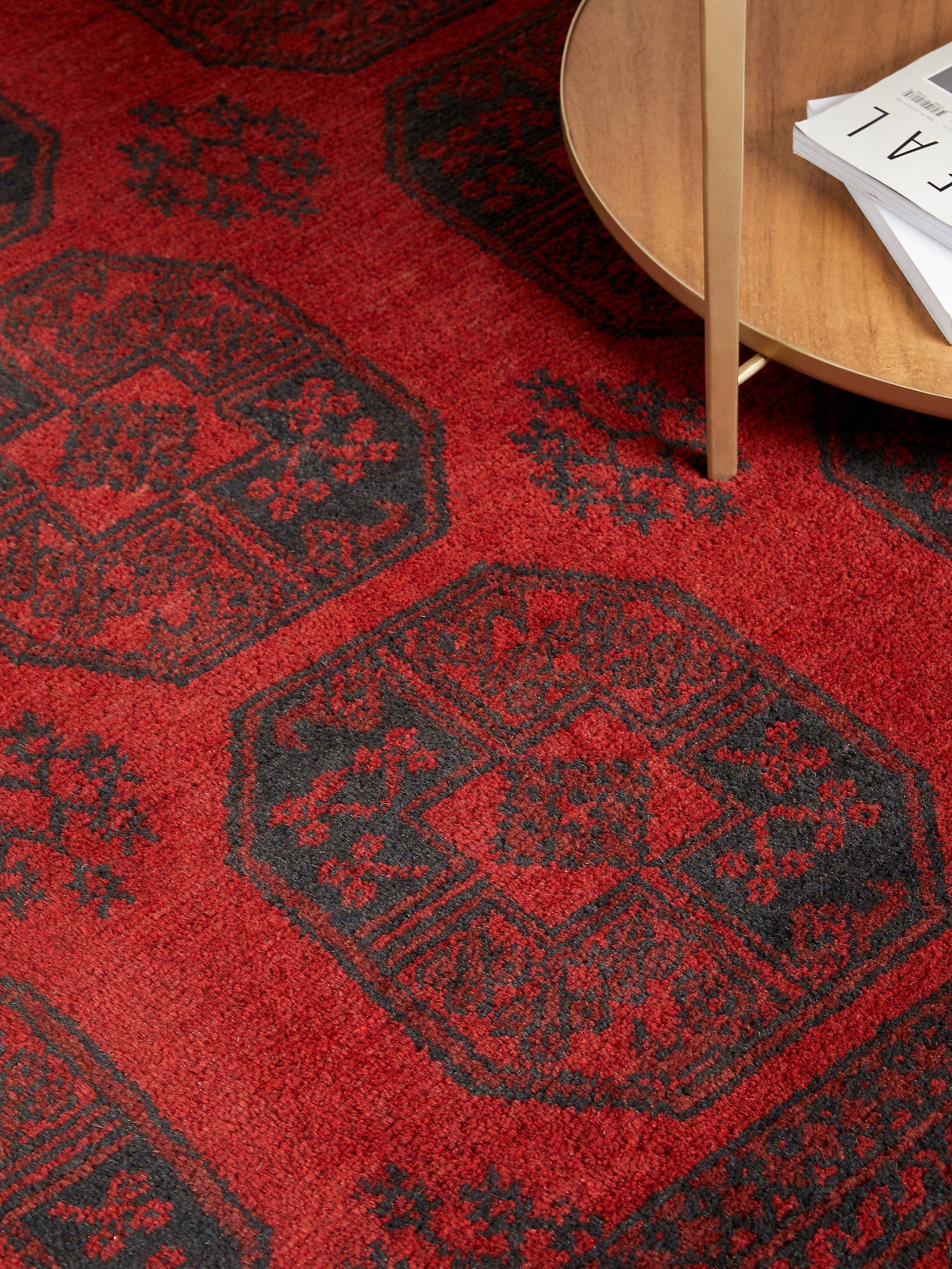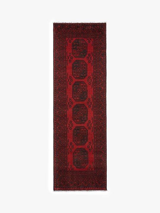 The Red Afghan rugs, also known as Aqchae are made in the classic Afghan-style using two shades of red with a black or very dark blue pattern.