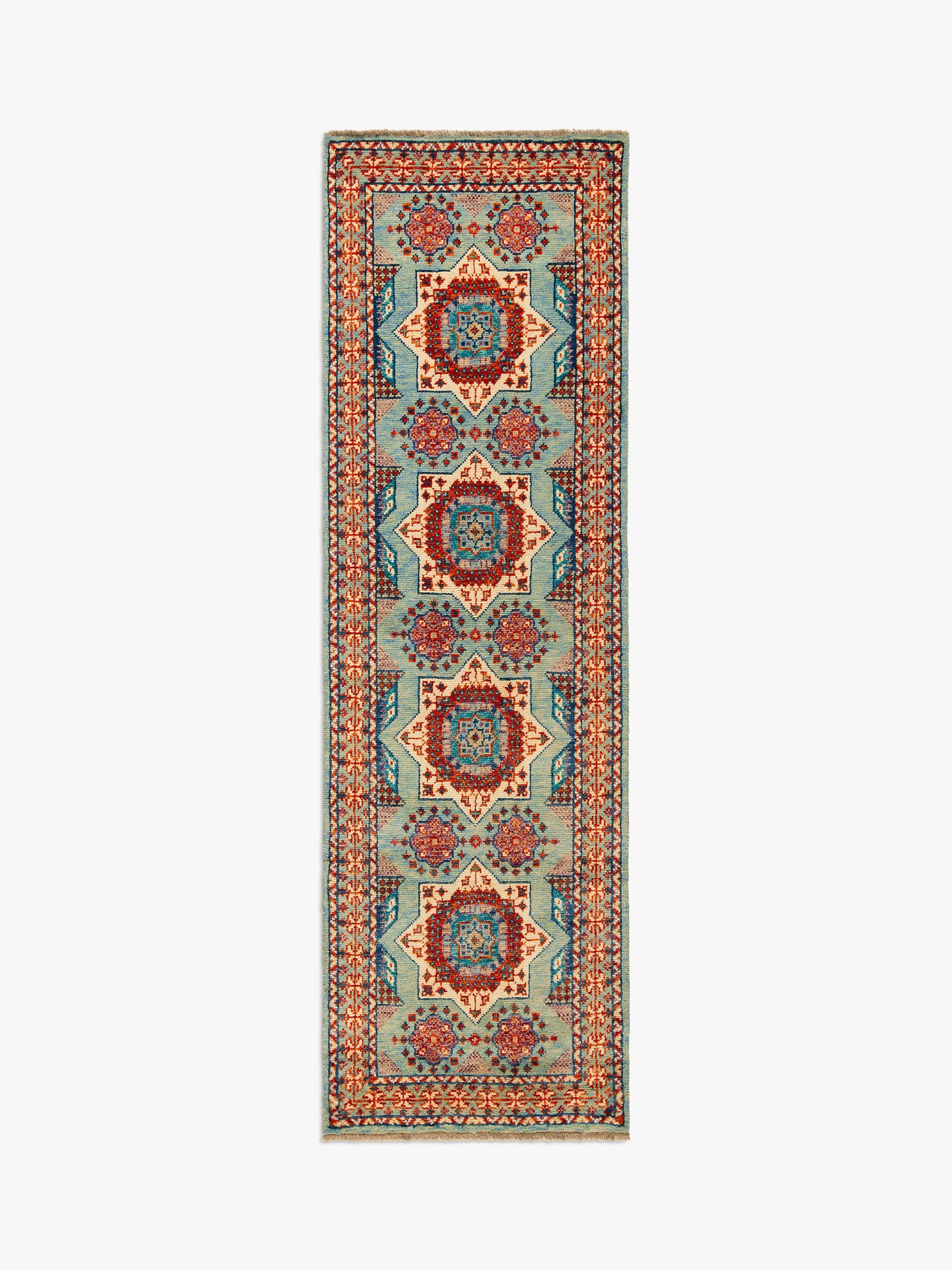 Inspired by Afghan rug design, this floor covering comes in a entrancing pattern with smart border and relaxed tasselling at either end.