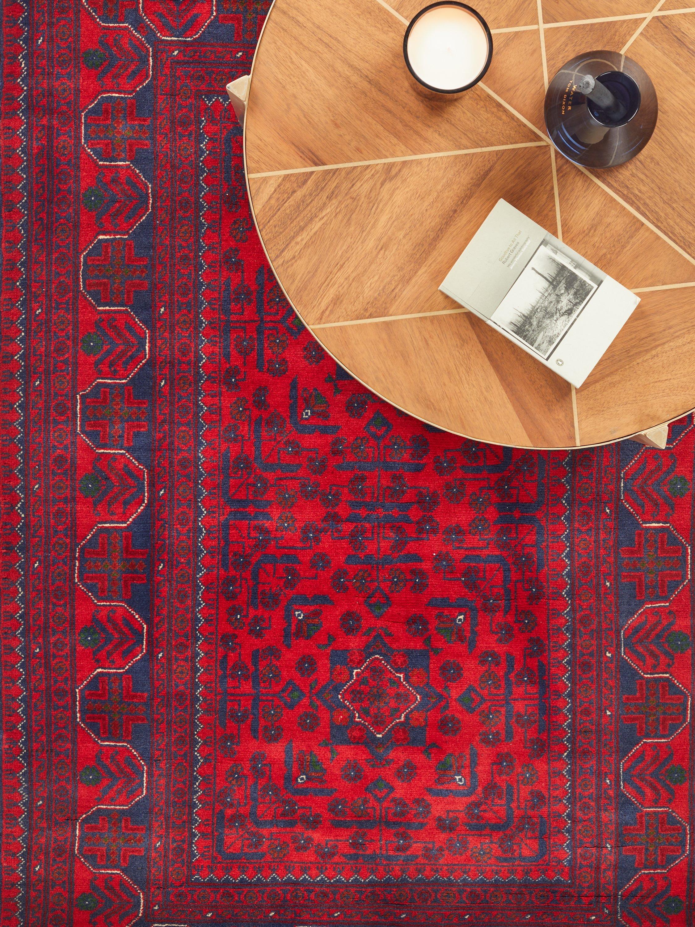 The Kundos quality is made uniquely famous due to the specific type of wool, dye and knots used. The wool used to make these rugs is sourced locally which gives a velvet soft feel on each piece and is very durable. The dying method carried out is also unique to this type of rug using a traditional method specific to the Andkhoy area. These unique methods delivers a very distinct and solid, bold colour. The rugs are then taken to a region in Pakistan where final bespoke touches are added to ensure the rug is finished to the highest standard. This rug has been finished at each end with an additional kelim flatweave decorative trim.