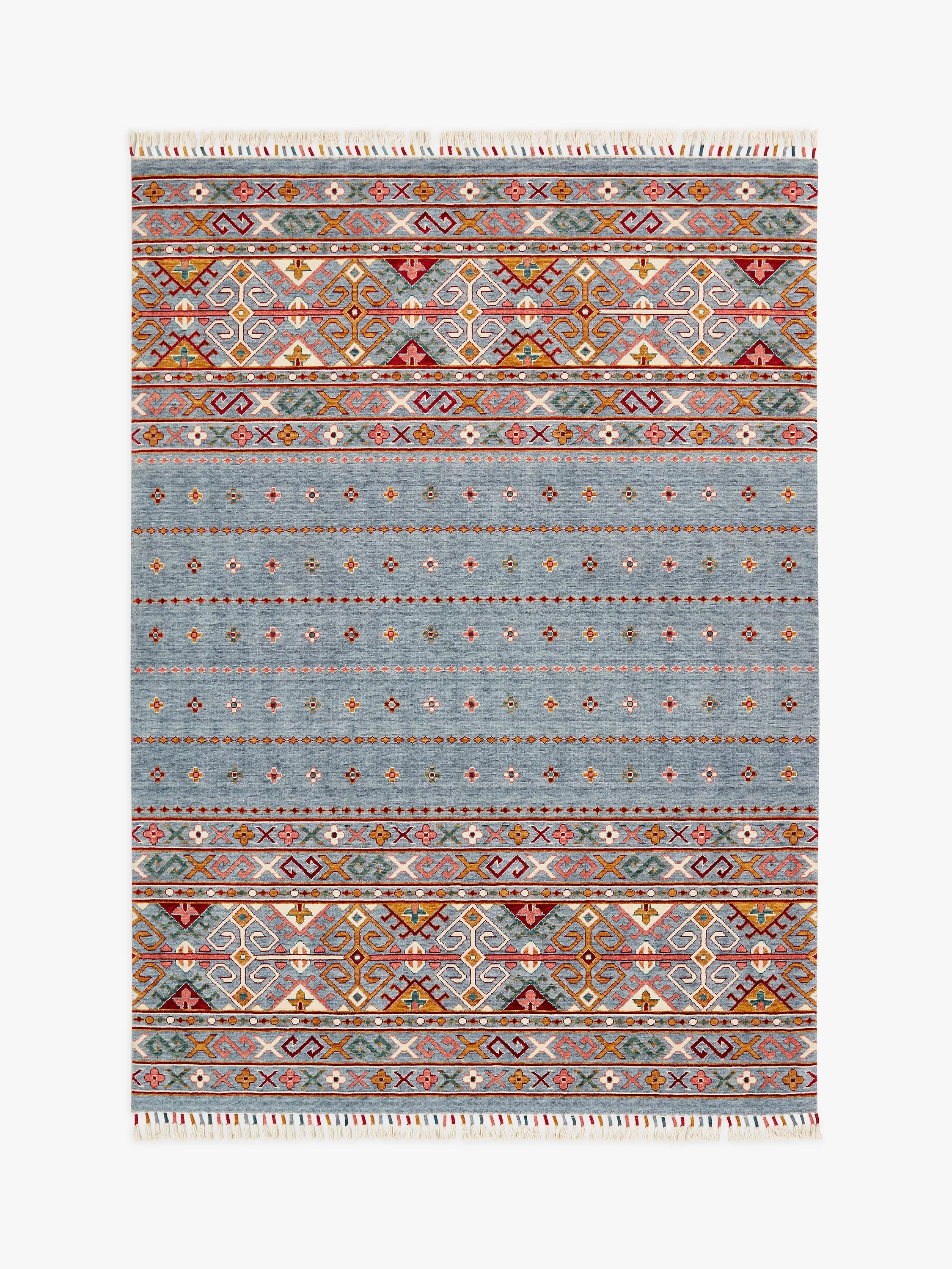 Inspired by the timeless majesty of traditional rug design but in a more modern, bright style, this rug boasts an intricate, geometric style pattern throughout and is finished with classic tassels at either end.