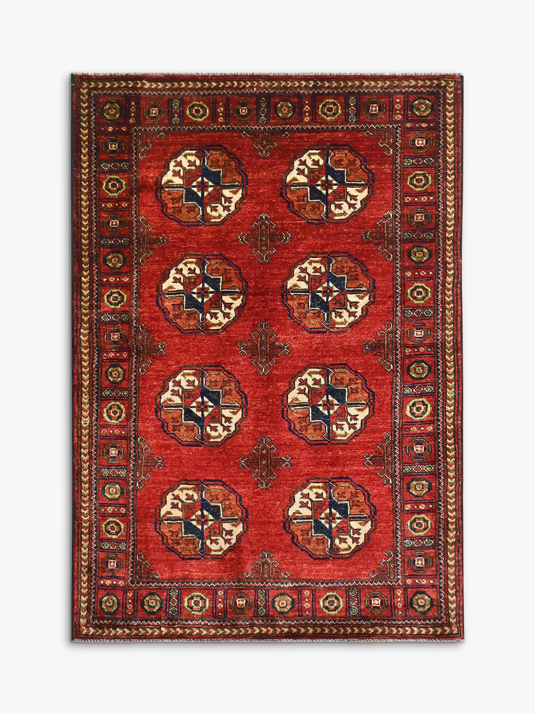Afghan Khan or Khal Mohammadi (as the design is mainly known) rugs are only woven in the Andkhoy region of Afghanistan. The yarns are dyed and then hand knotted by the Uzbek and Turkoman people using 100% local wool. These are then transported over to Pakistan where they are expertly finished including washing and trimming.