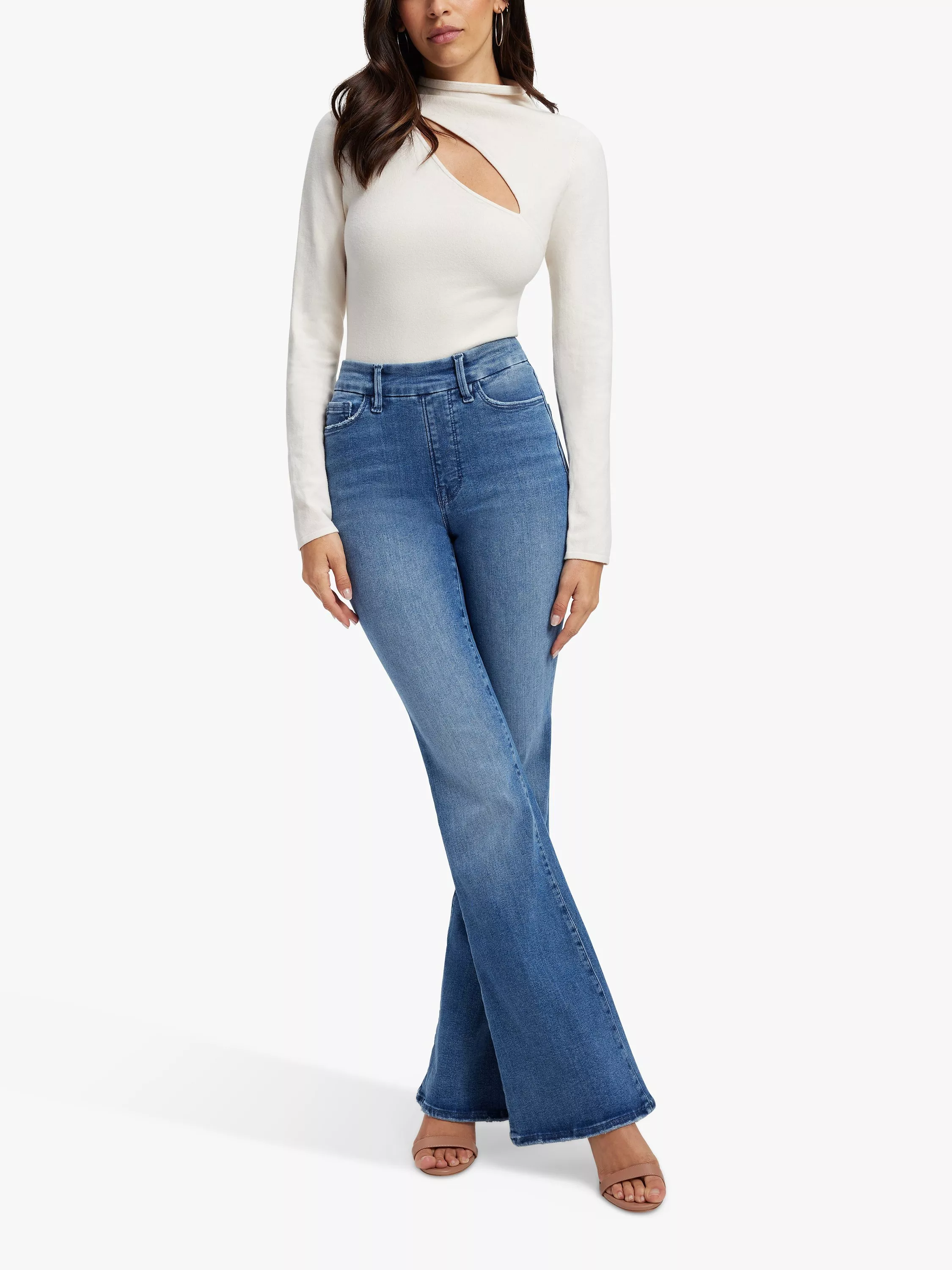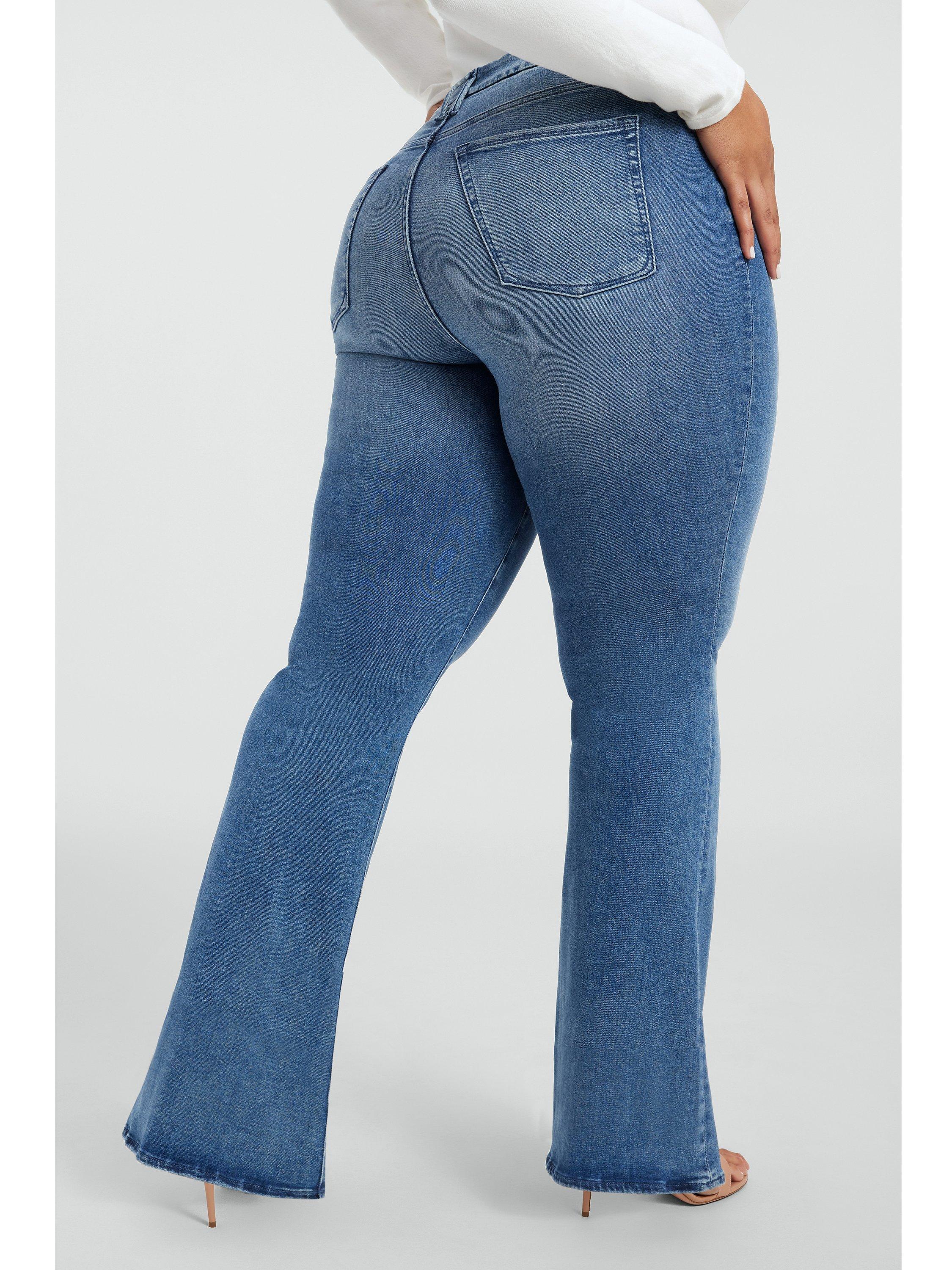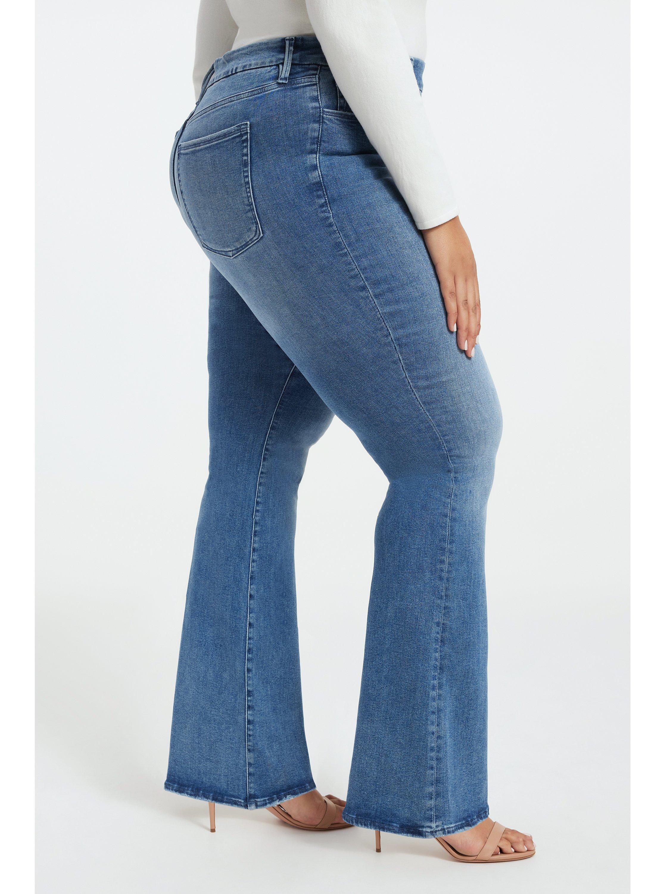 With a bohemian edge, these flared mid rise jeans from Good American are made from a powerstretch fabric for a sculpted silhouette and fall beyond the ankle to lengthen the silhouette.