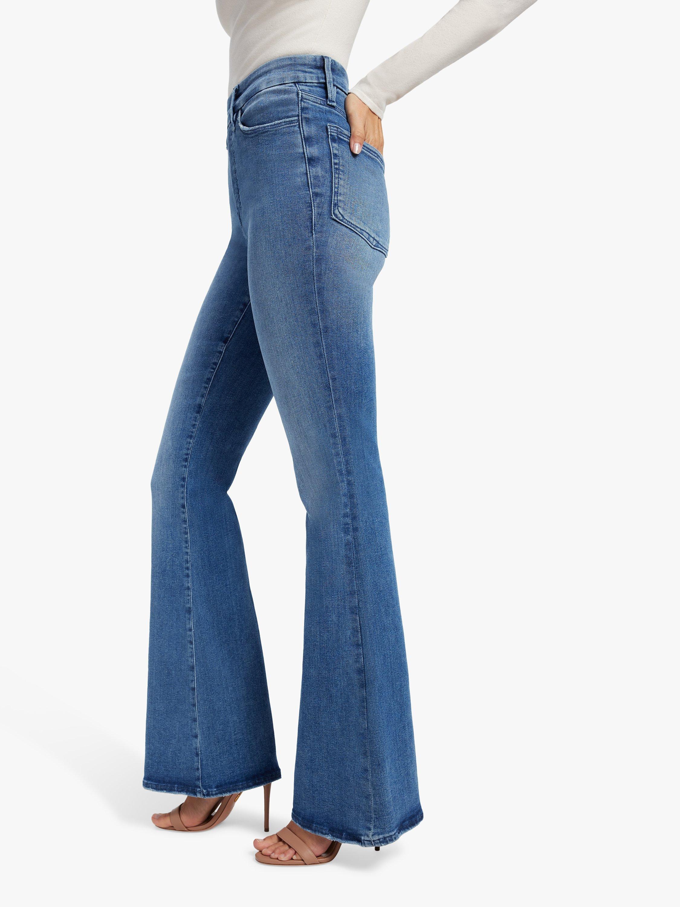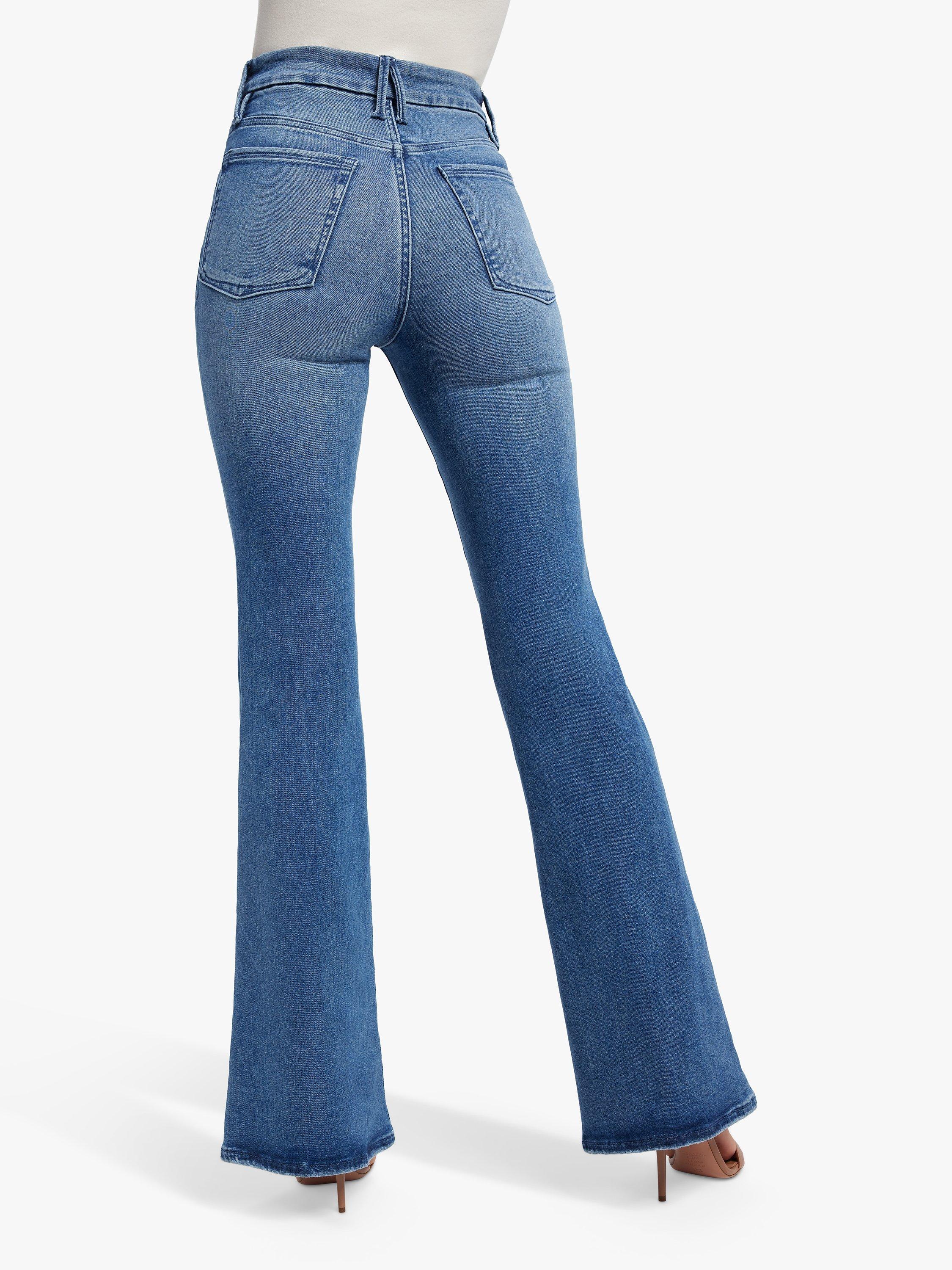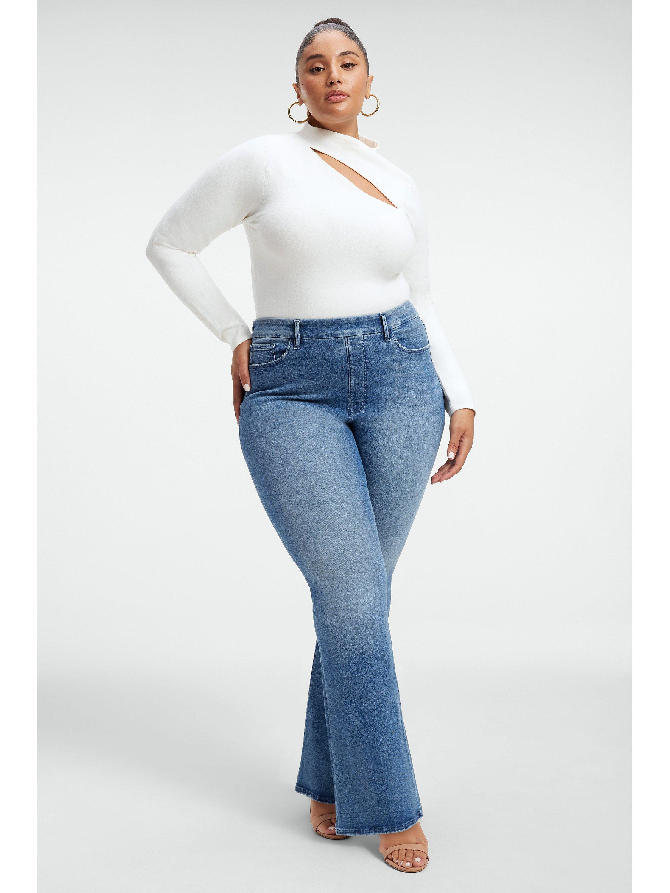 With a bohemian edge, these flared mid rise jeans from Good American are made from a powerstretch fabric for a sculpted silhouette and fall beyond the ankle to lengthen the silhouette.