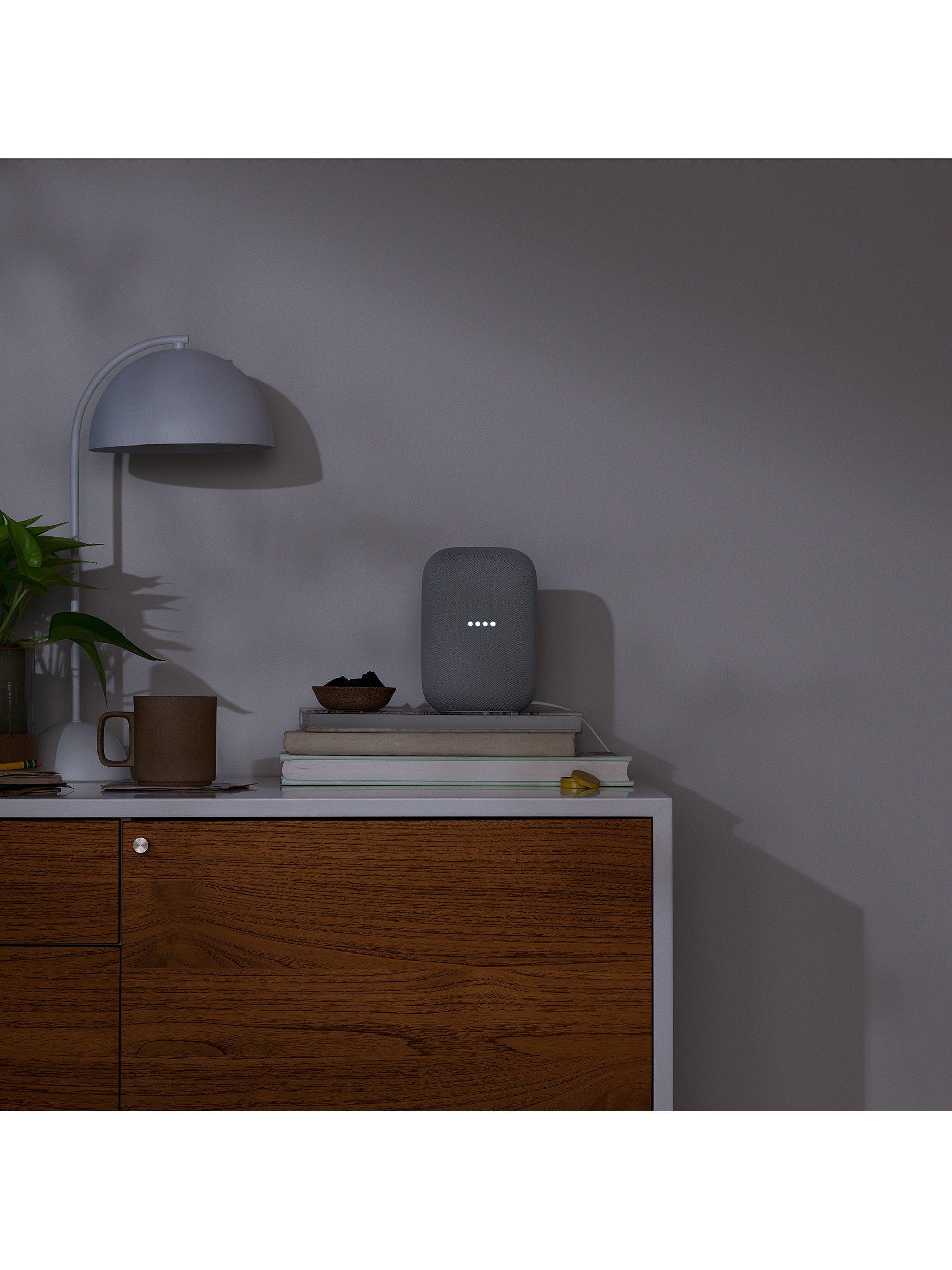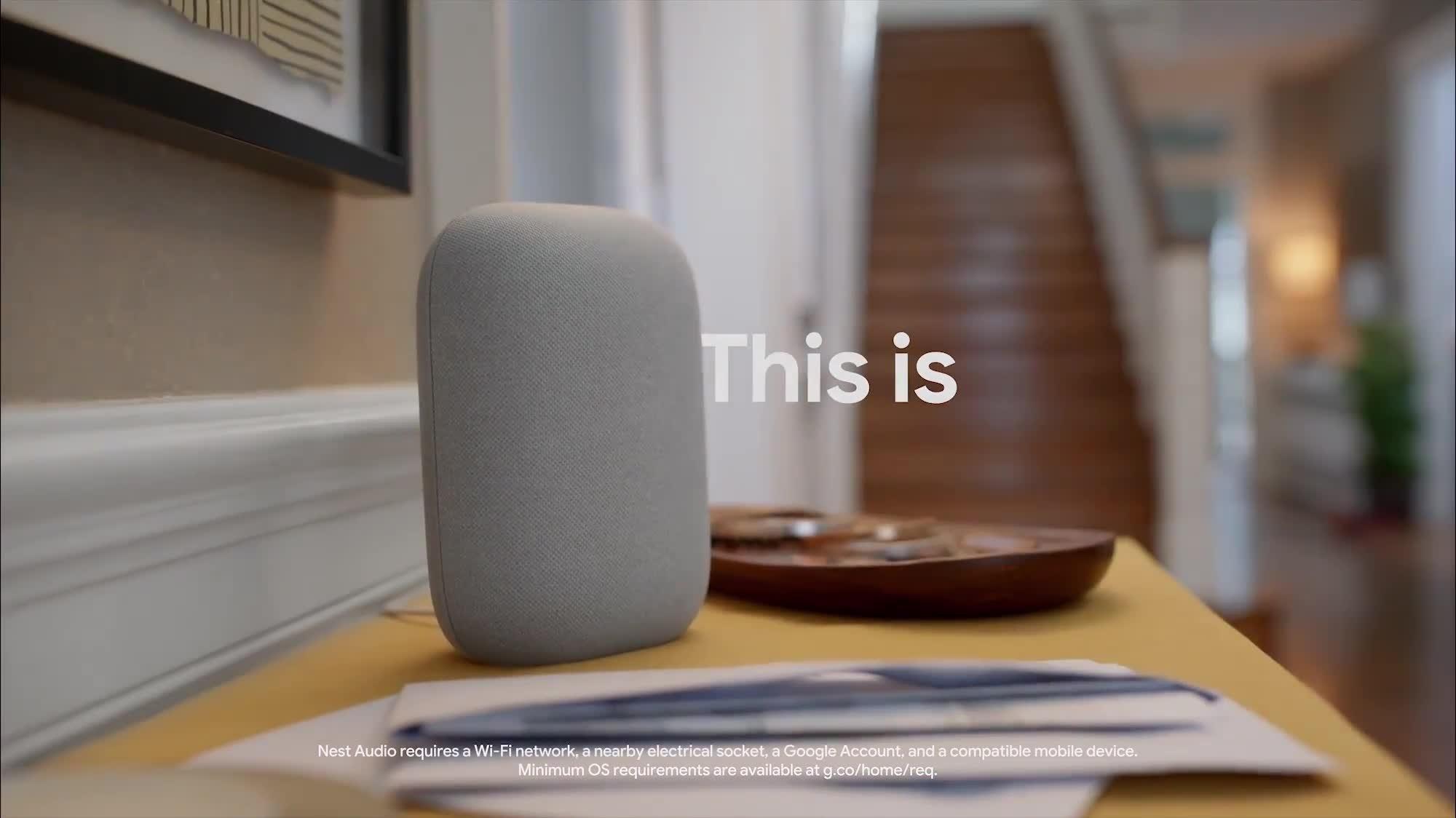 Nest Audio requires Wi-Fi, a nearby electrical socket, a Google Account and a compatible mobile device. Minimum OS requirements are available at g.co/home/req.