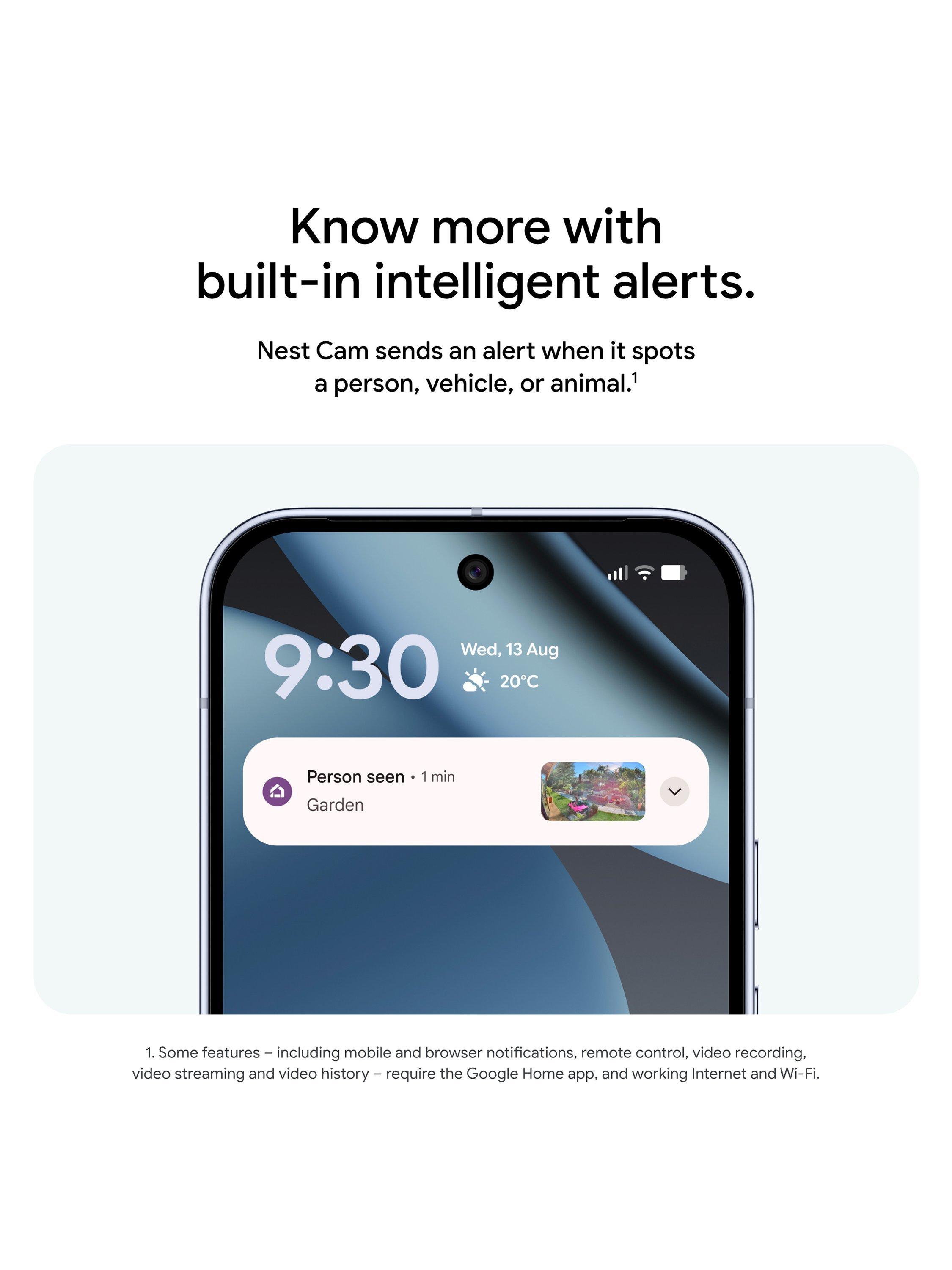 Video is crisp and clear in 2K, Nest Cam’s highest resolution yet. See rich colour and details, even in low light, and see in the dark with night vision. With wider and taller field of view, almost nothing’s out of frame – even in a long driveway or big yard.