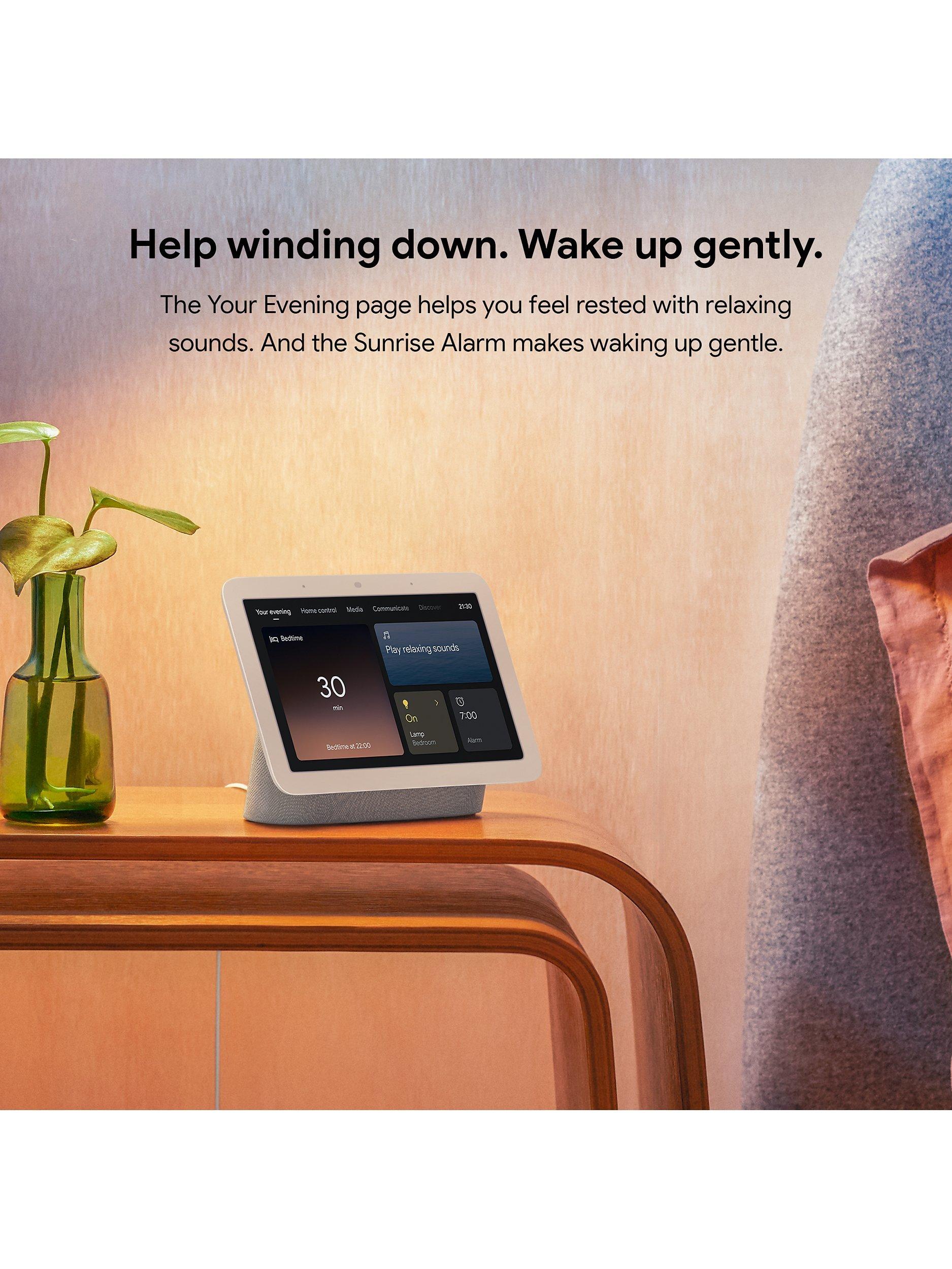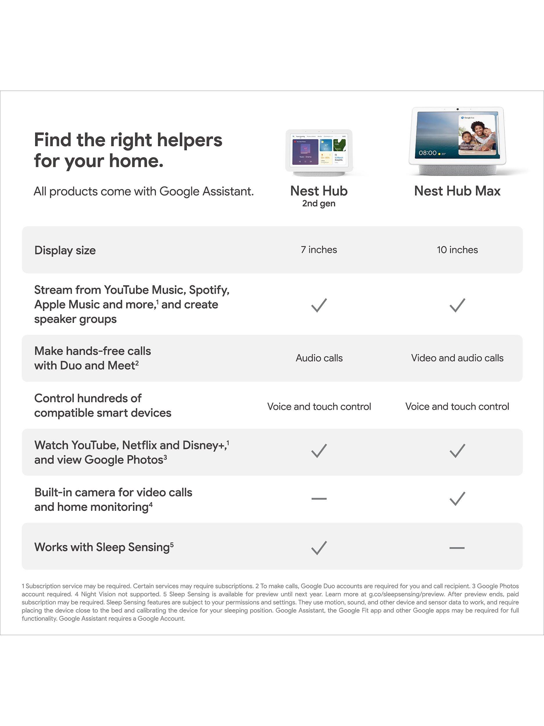 *** Sleep Sensing requires a subscription service. Sleep Sensing features are subject to your permissions and settings. They use motion, sound and other device and sensor data to work. They also require placing the device close to the bed and calibrating for your sleeping position. Google Assistant, the Google Fit app and other Google apps may be required for full functionality. Nest Hub with Sleep Sensing is not intended to diagnose, cure, mitigate, prevent or treat any disease or condition and should not be used as an alternative to seeking appropriate medical advice or treatment where needed. Device placement and nearby people, pets or noises can cause inaccurate readings.