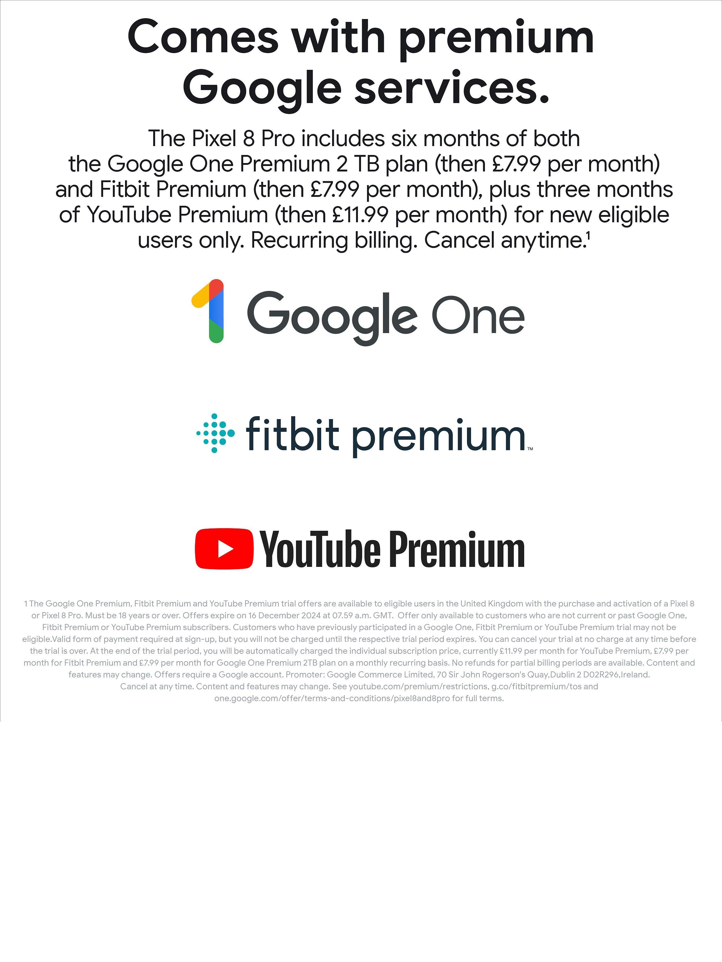 Introducing Pixel 8 Pro, the all-pro phone engineered by Google. It's sleek, sophisticated, powerful and secure. With Google AI, you can do more, even faster (than previous Pixel phones). The triple camera system includes a dedicated 5x telephoto lens, improved auto-focus and full-resolution photography with Pro controls. And the all-day battery charges faster than previous models.
