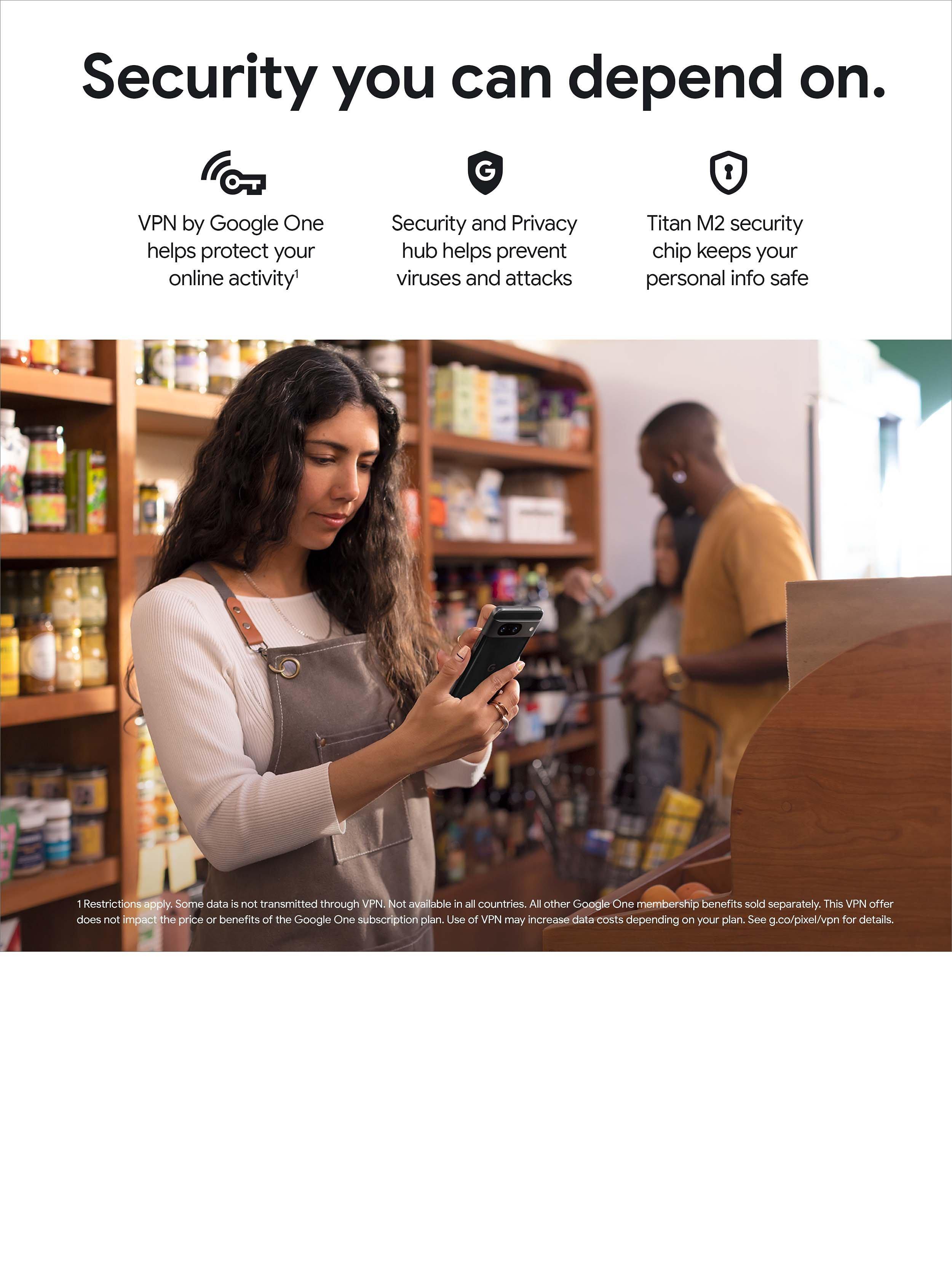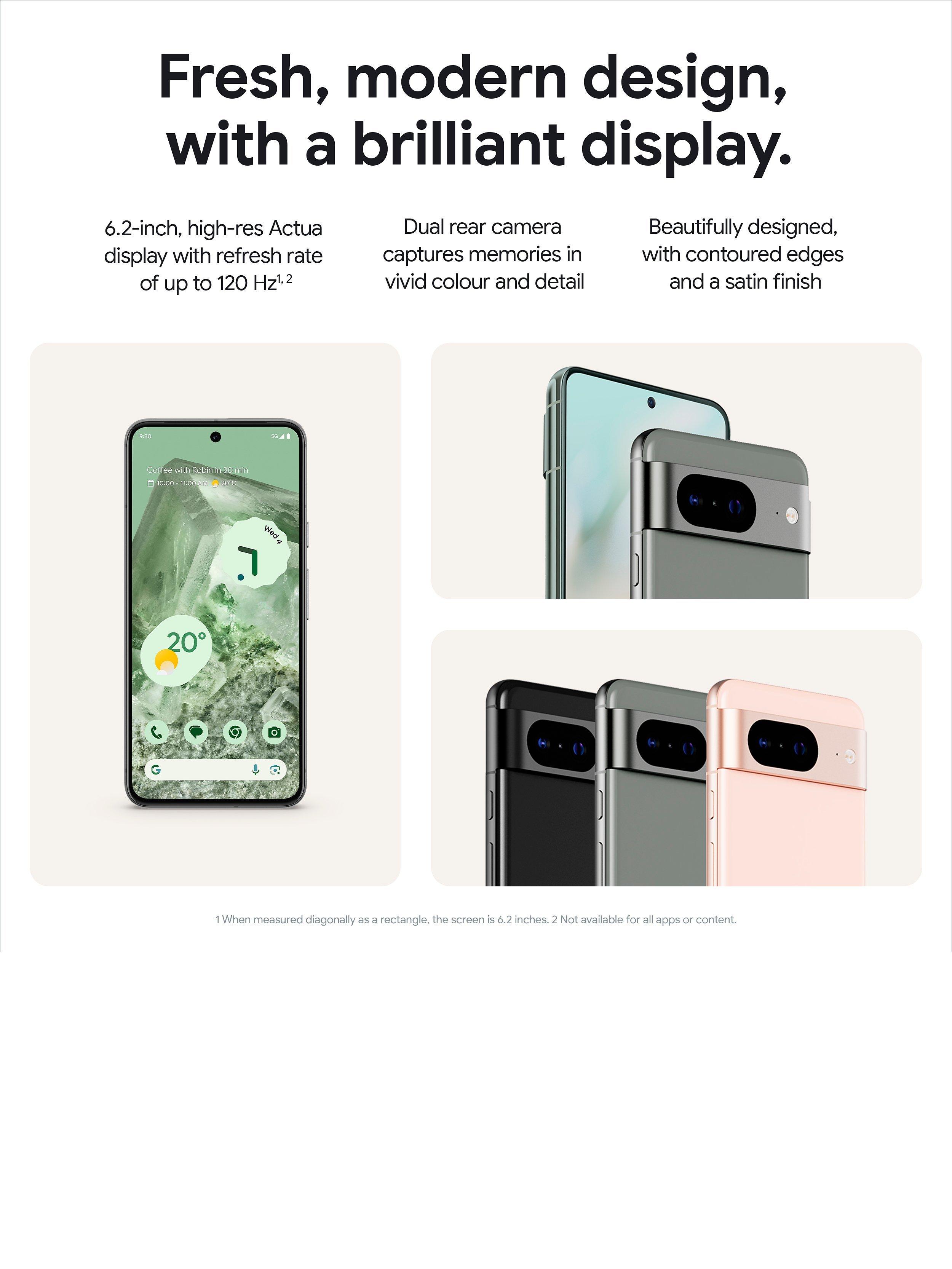 Meet Pixel 8. The helpful phone engineered by Google, with an amazing camera, powerful security and an all-day battery. With Google AI, you can do more, even faster - like fix photos, screen calls and get answers. And Pixel 8 has personal safety features for added peace of mind.