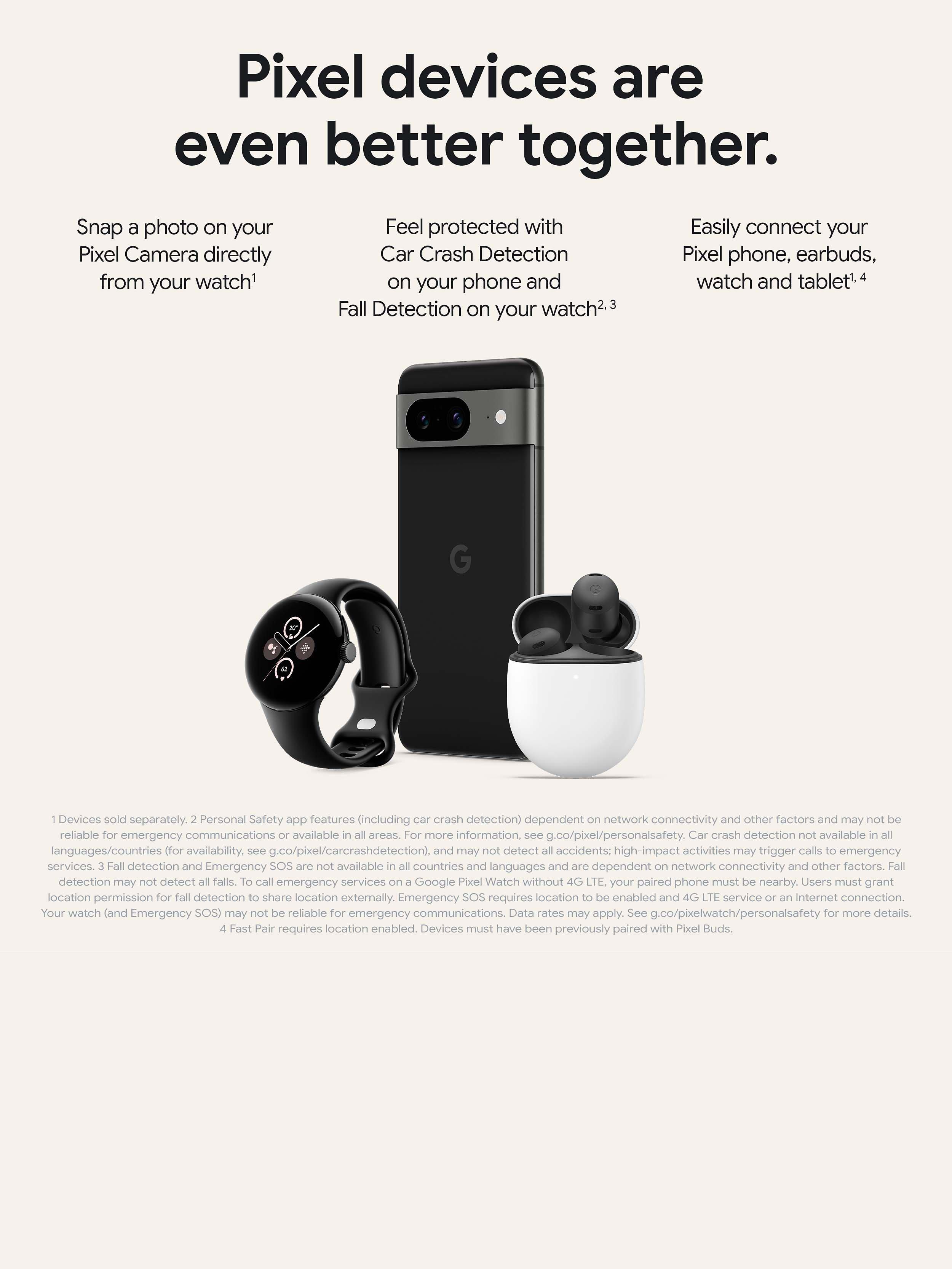 Meet Pixel 8. The helpful phone engineered by Google, with an amazing camera, powerful security and an all-day battery. With Google AI, you can do more, even faster - like fix photos, screen calls and get answers. And Pixel 8 has personal safety features for added peace of mind.