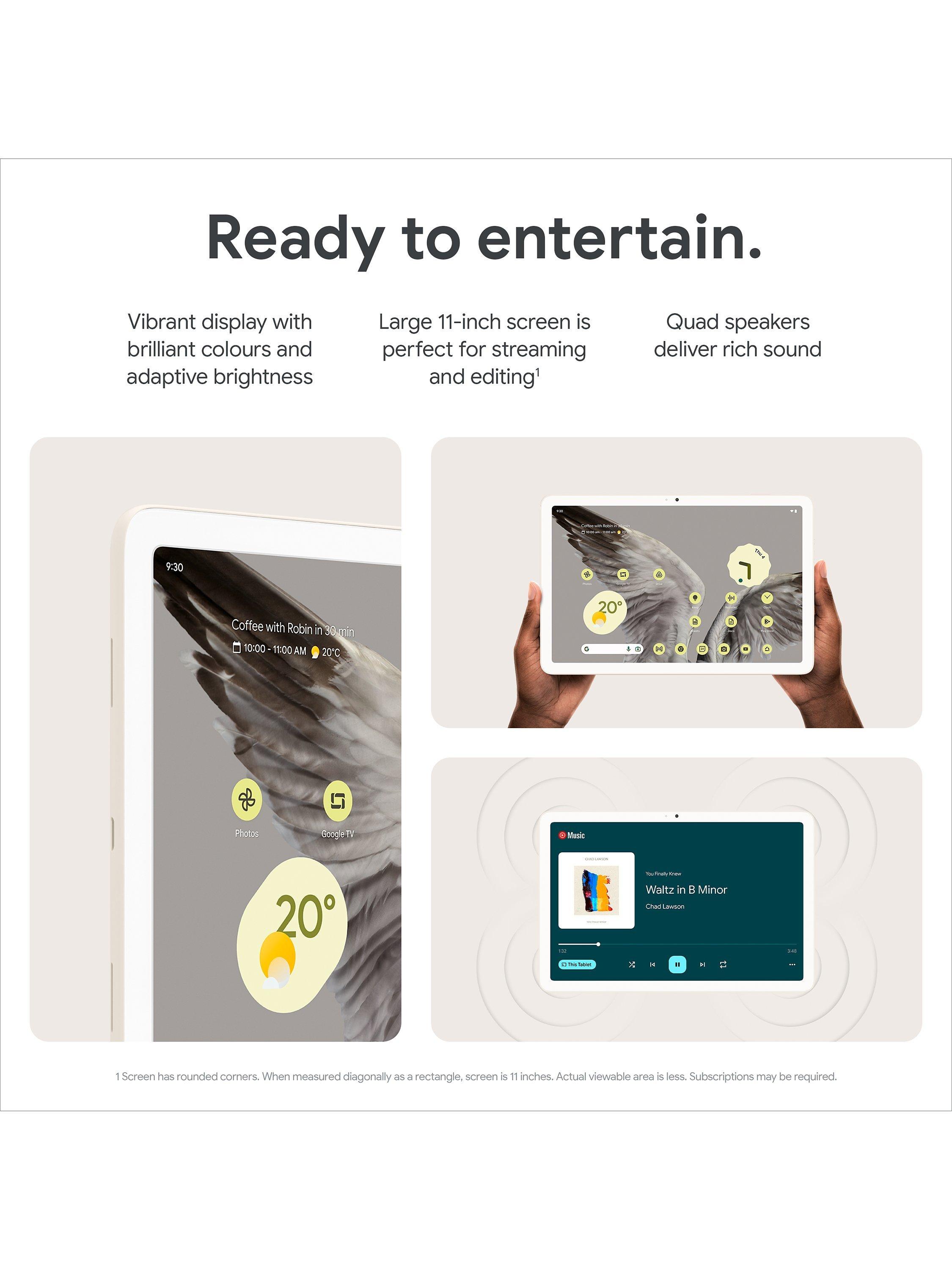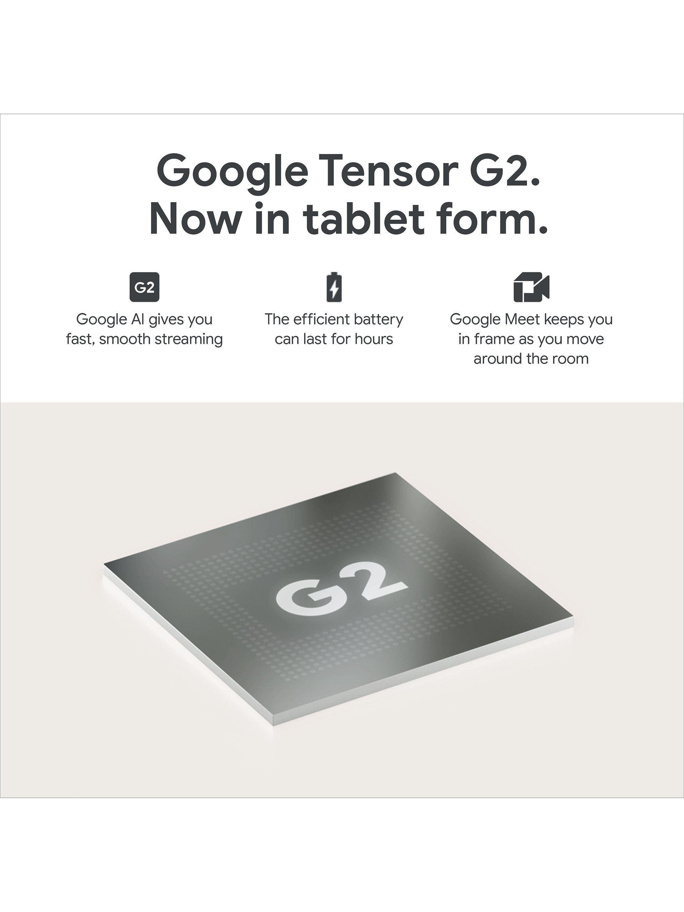 It’s the first tablet with the Google Tensor G2 chip built in. It features Google AI and enables fast and smooth streaming, high-quality video calls, accurate voice typing, efficient multitasking, and more.