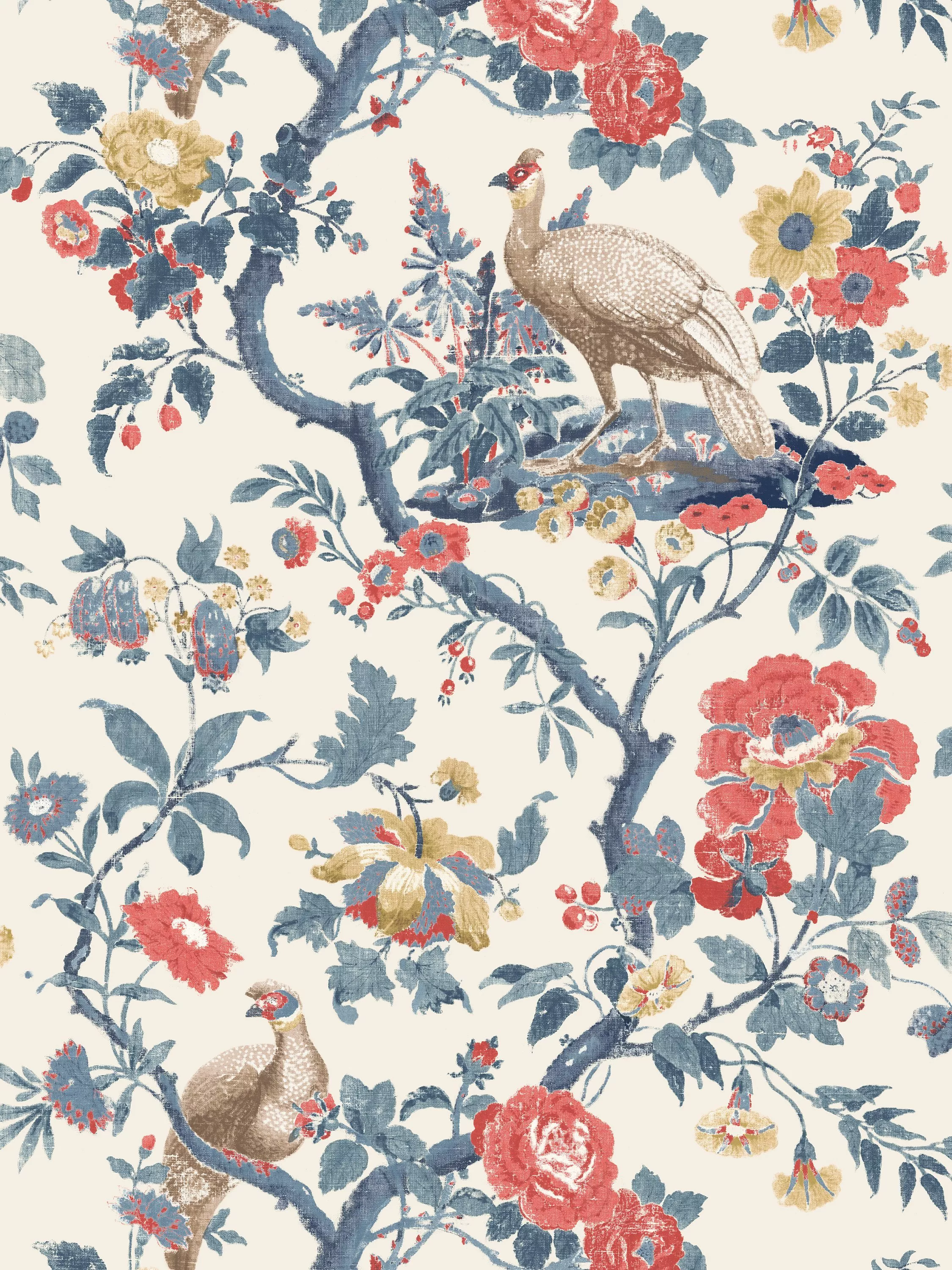 A GP & J Baker Original, Broughton Rose is based on Guinea Fowl designed by renowned textile designer William Turner in 1918 and features grand Helmeted Guinea Fowl with anemones, convolvulus and Malmaison roses.