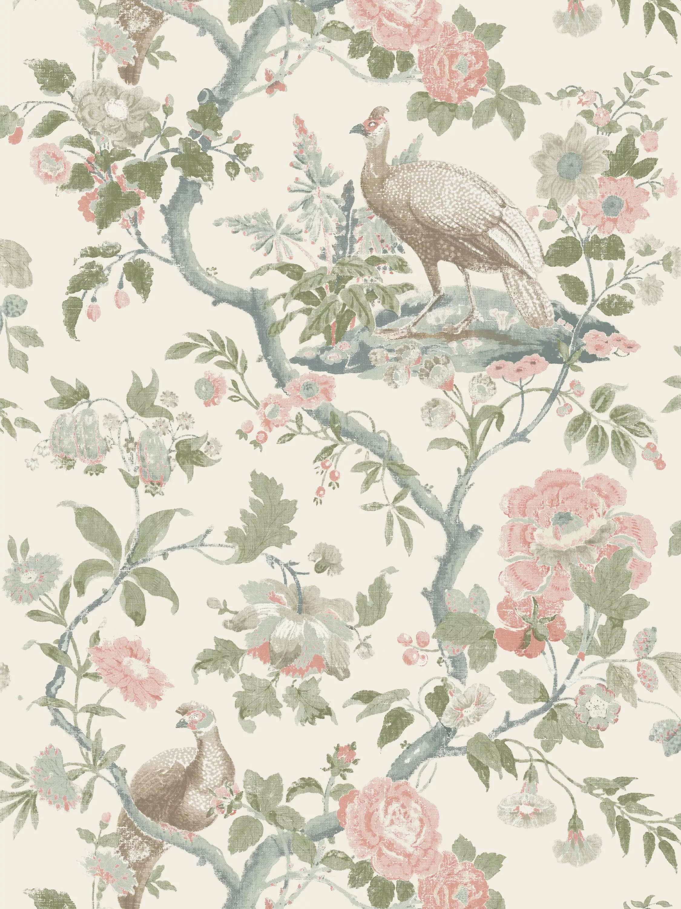 A GP & J Baker Original, Broughton Rose is based on Guinea Fowl designed by renowned textile designer William Turner in 1918 and features grand Helmeted Guinea Fowl with anemones, convolvulus and Malmaison roses.