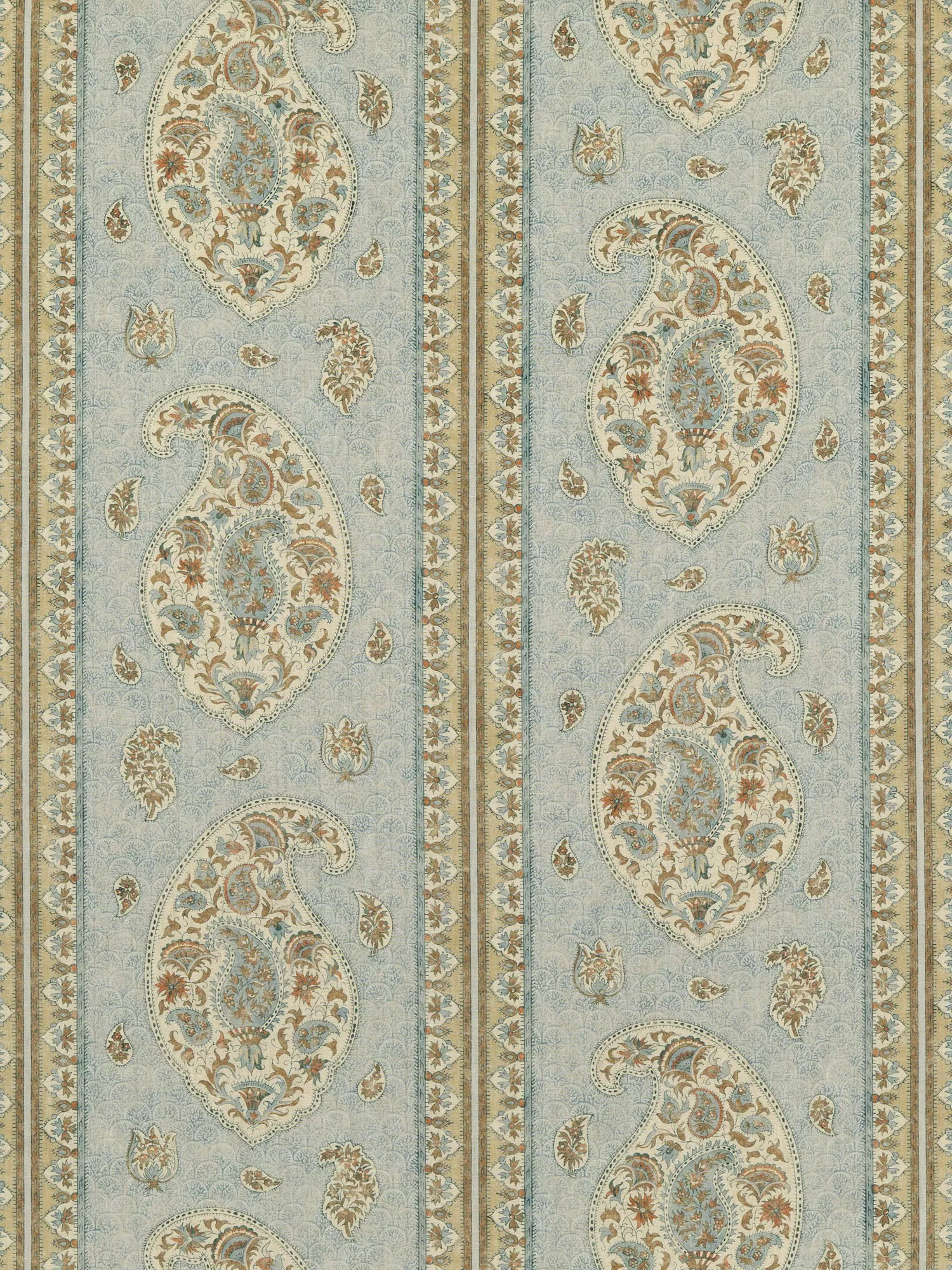 Thought to have hidden messages and enigmatic symbols the paisley design is set to have been an allegory of life. On this fabric, the paisley motif is bordered with decorative bands.