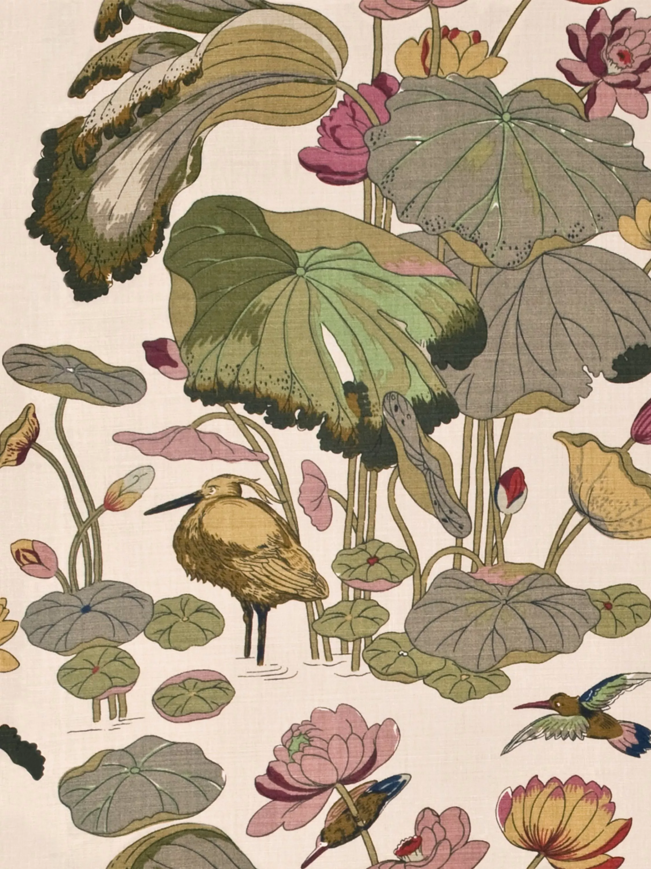 This enduring GP & J Baker classic was created by the renowned British textile designer William Turner in 1915. It features kingfishers flying over an egret who shelters beneath lotus leaves.