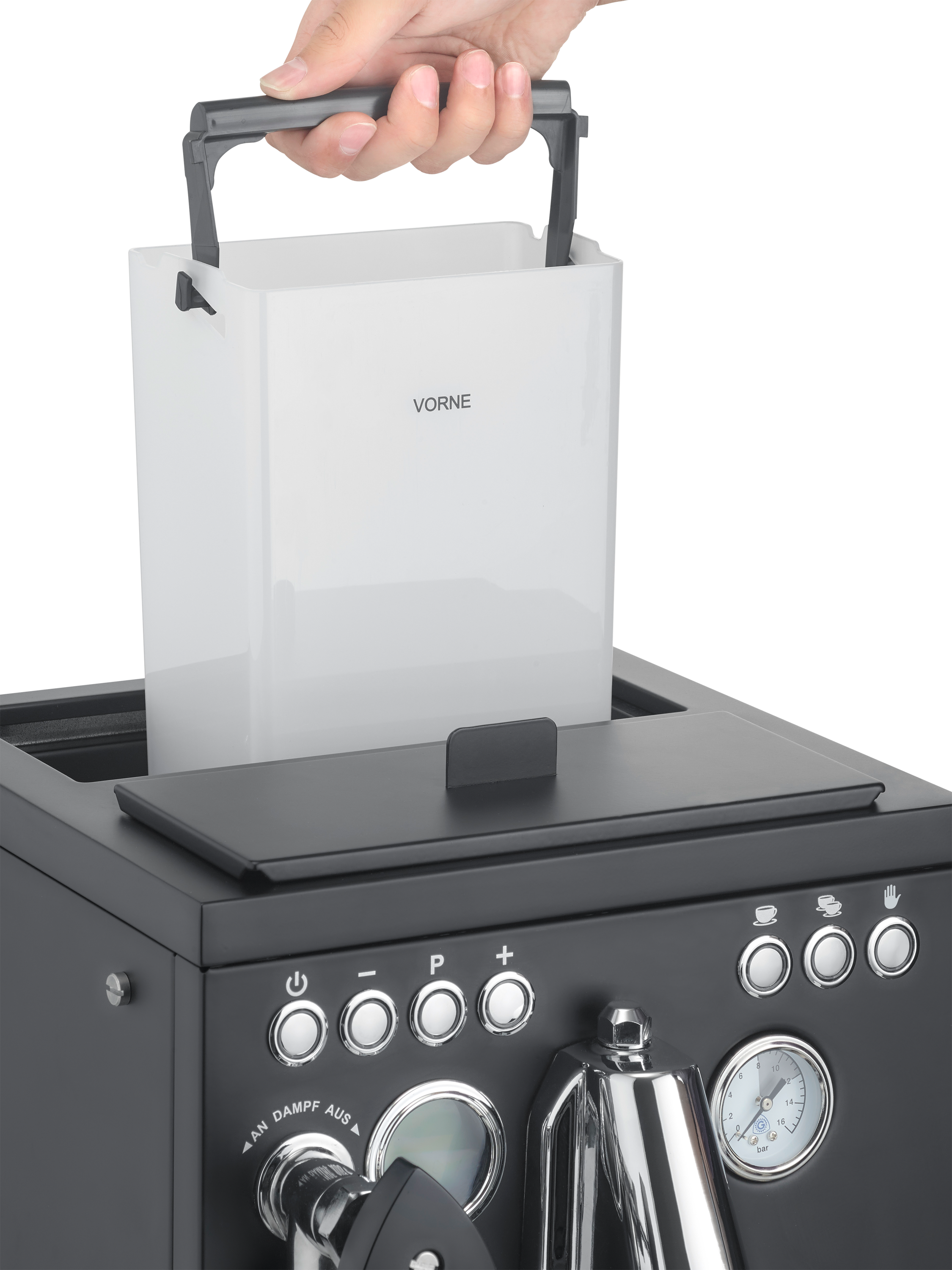 The 2.5-litre water tank can be removed from the top and is equipped with a replaceable water filter (ion exchanger). A message appears on the display as soon as the water tank is empty.