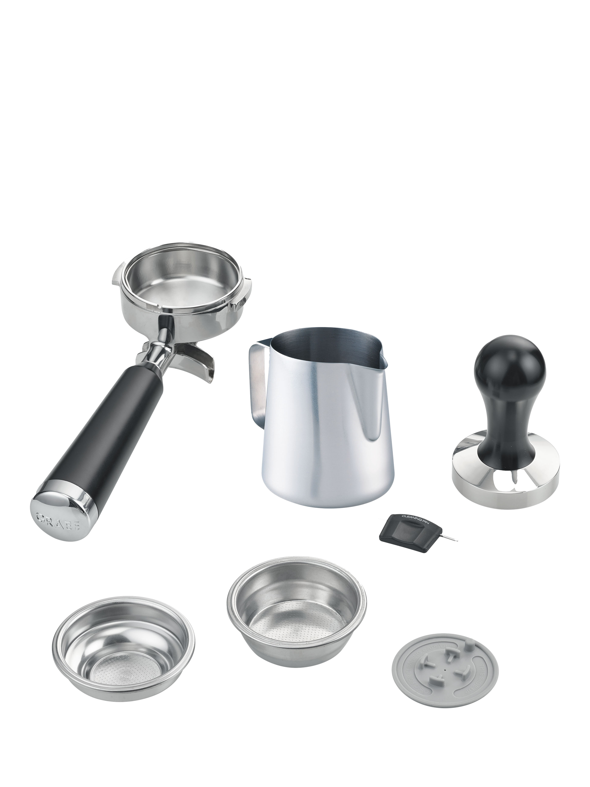 The Batessa is supplied with a group handle (double outlet), a stainless steel milk jug, a high-quality tamper, two espresso filters (1&2 cups), a blind screen and a cleaning pin for screens and nozzles.