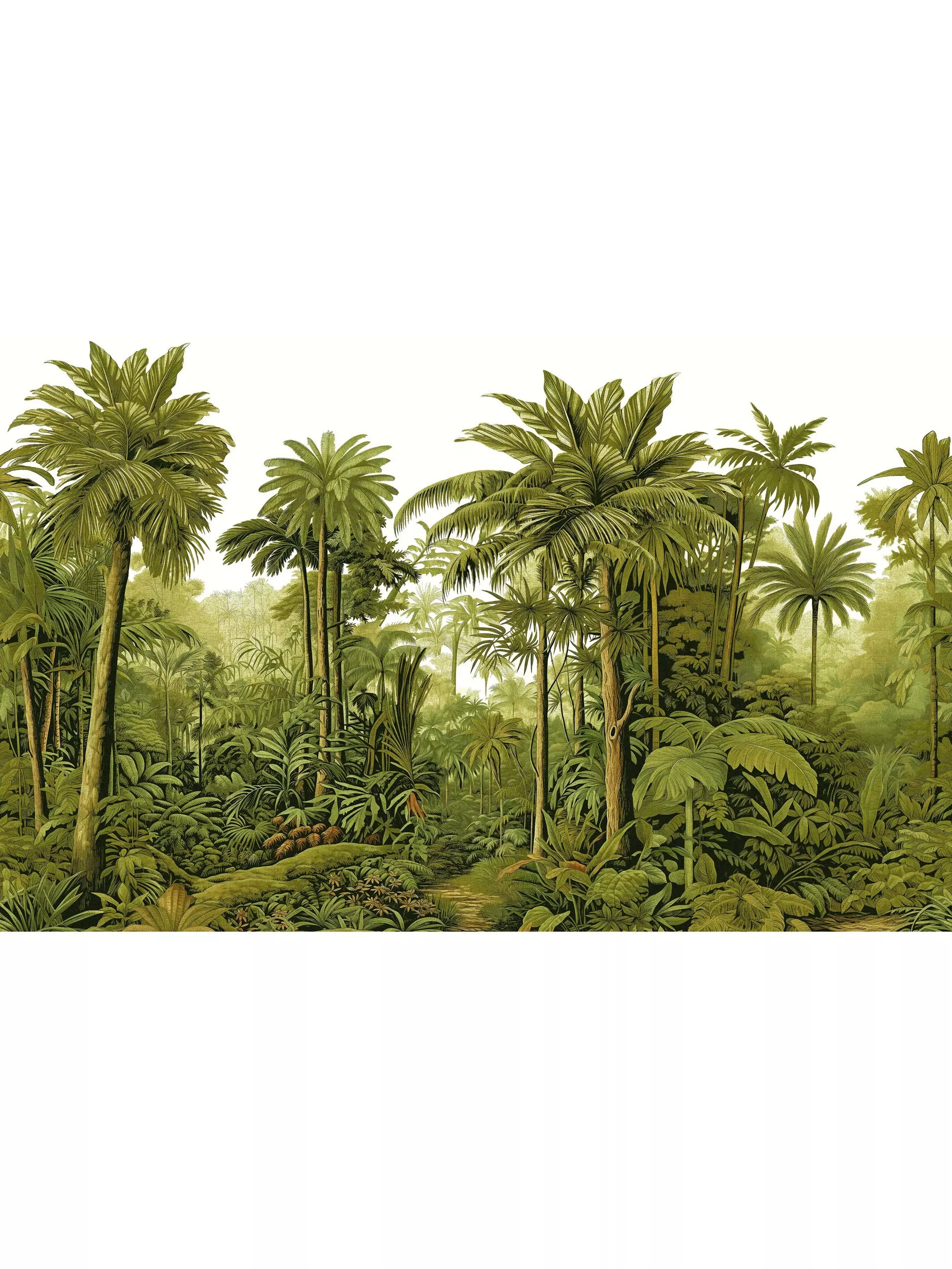 This captivating wallpaper mural depicts a scene filled with towering palm trees, exotic plants, and a sense of untamed wilderness. The intricate details and masterful shading bring the jungle to life, making it feel as though you could almost step into the scene and feel the humidity in the air.