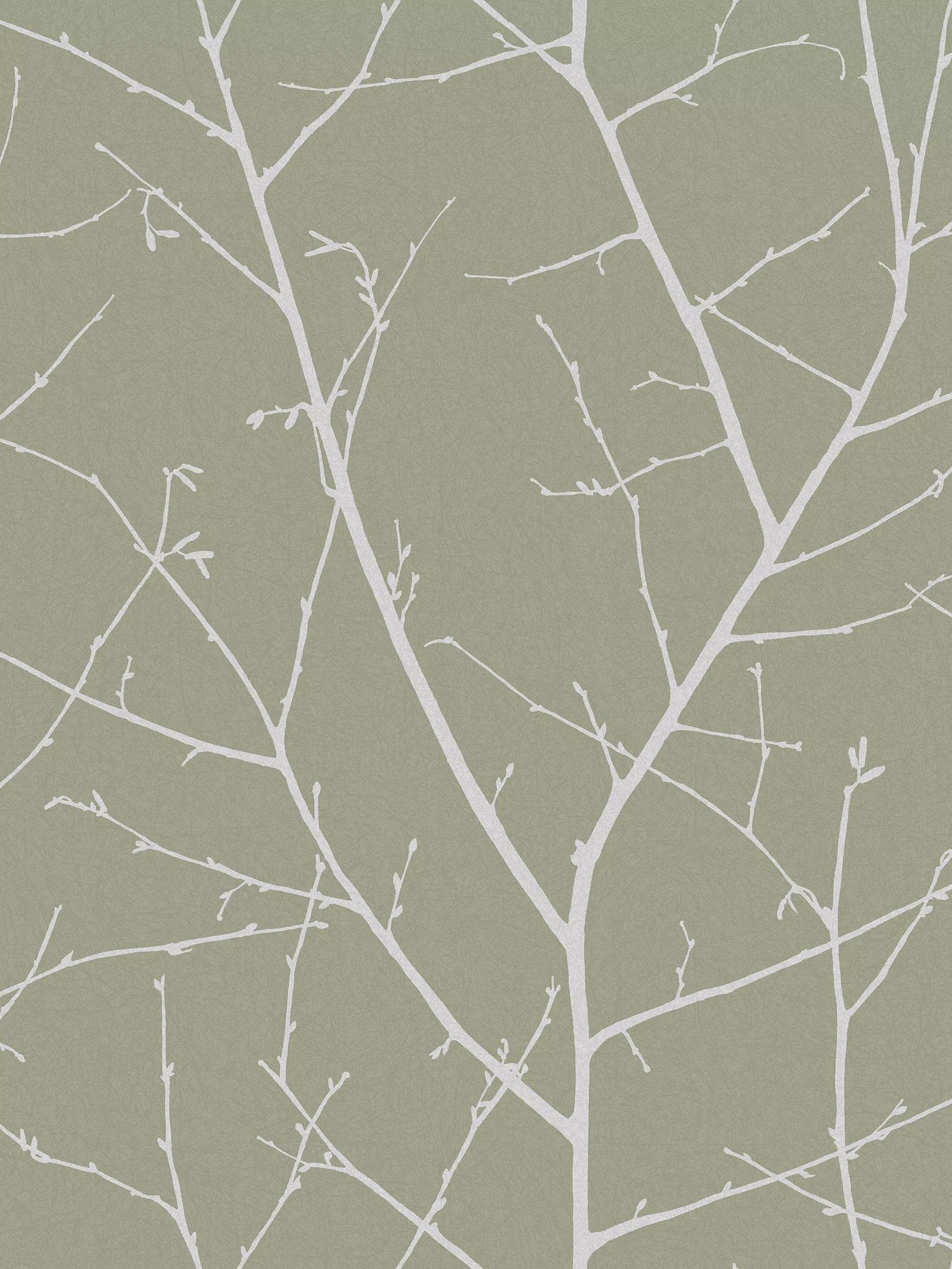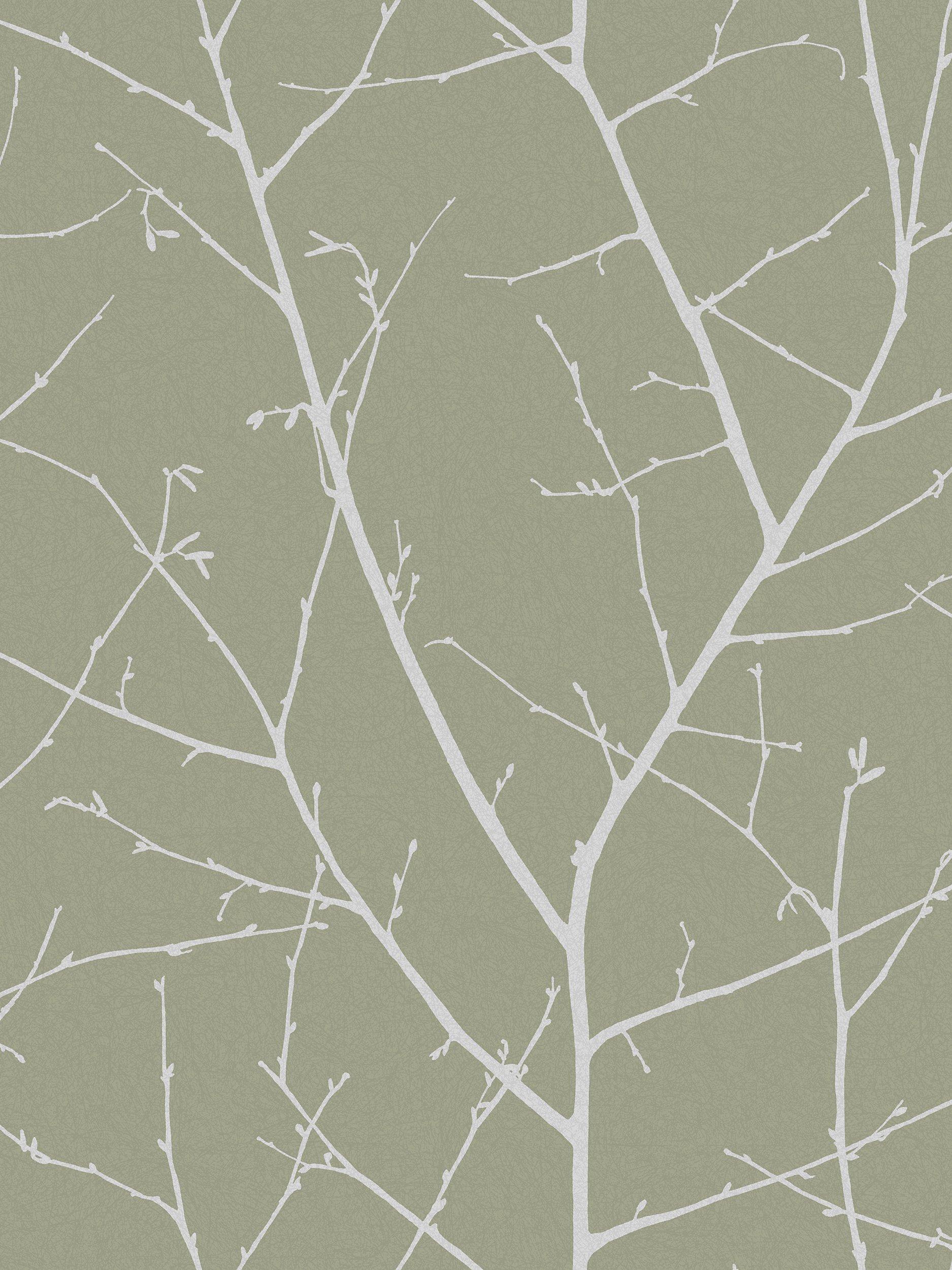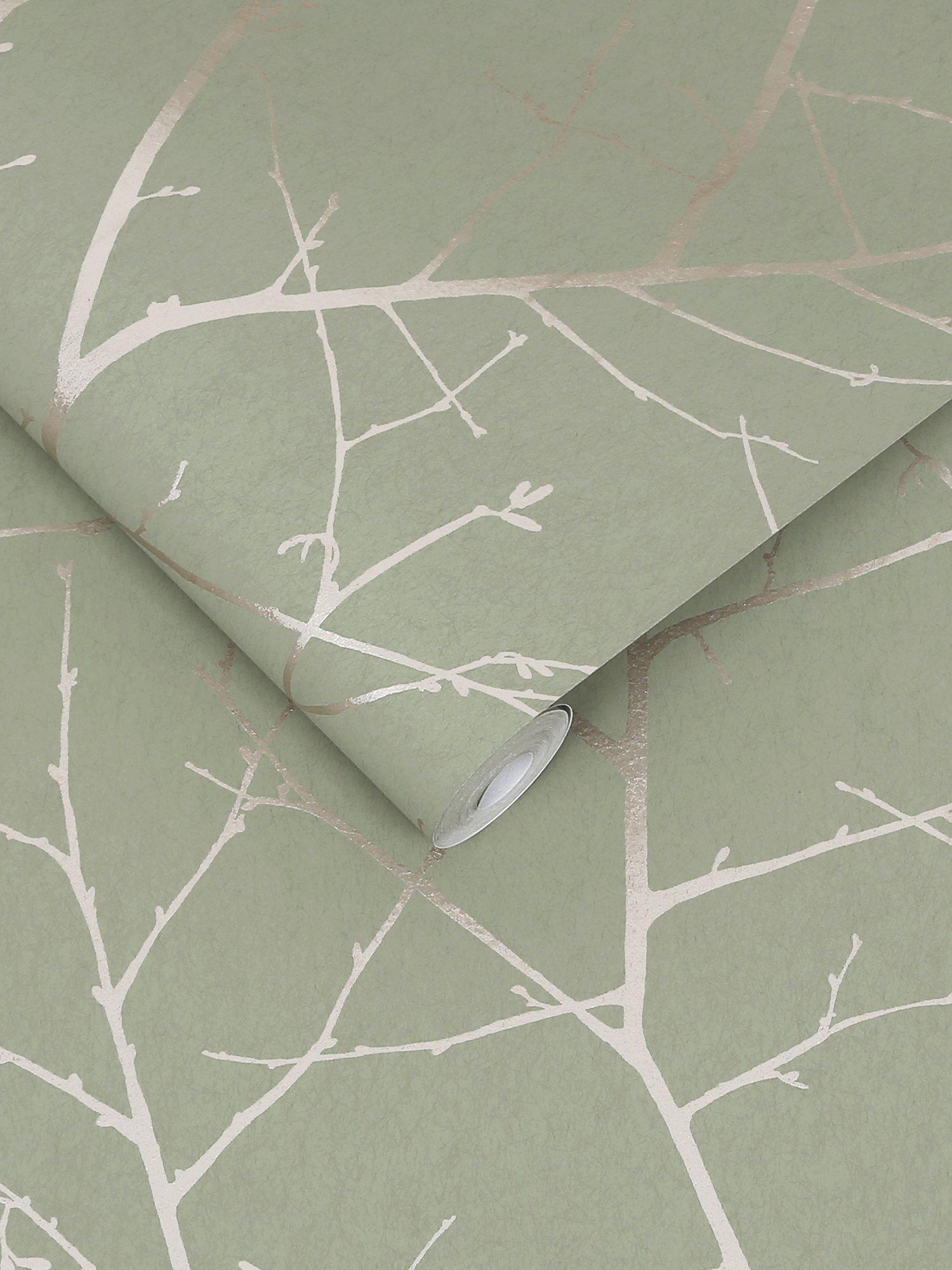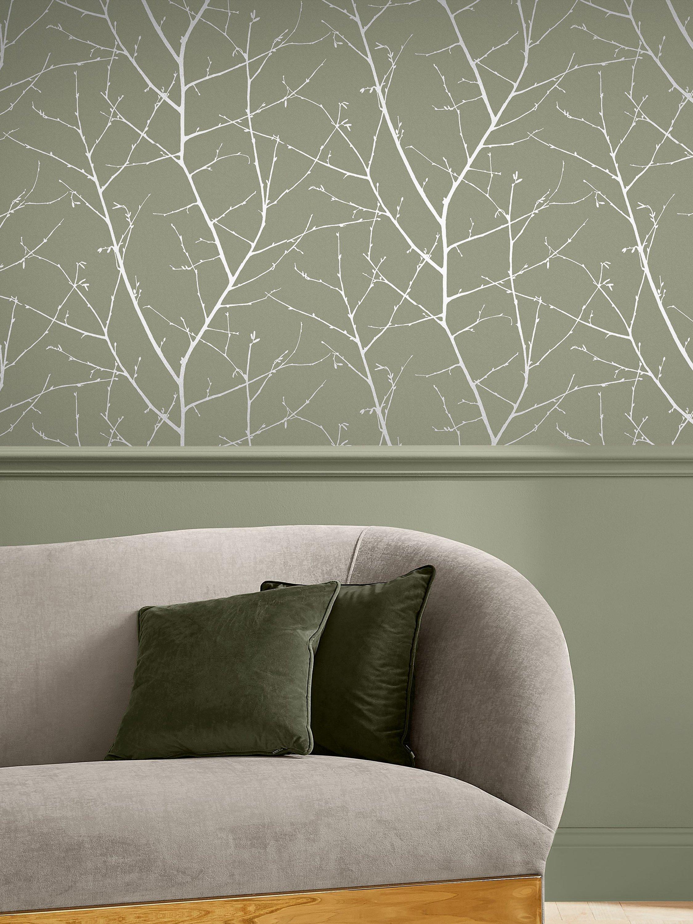 Soft platinum branches reach across the warming sage backdrop creating a bright but cosy look.