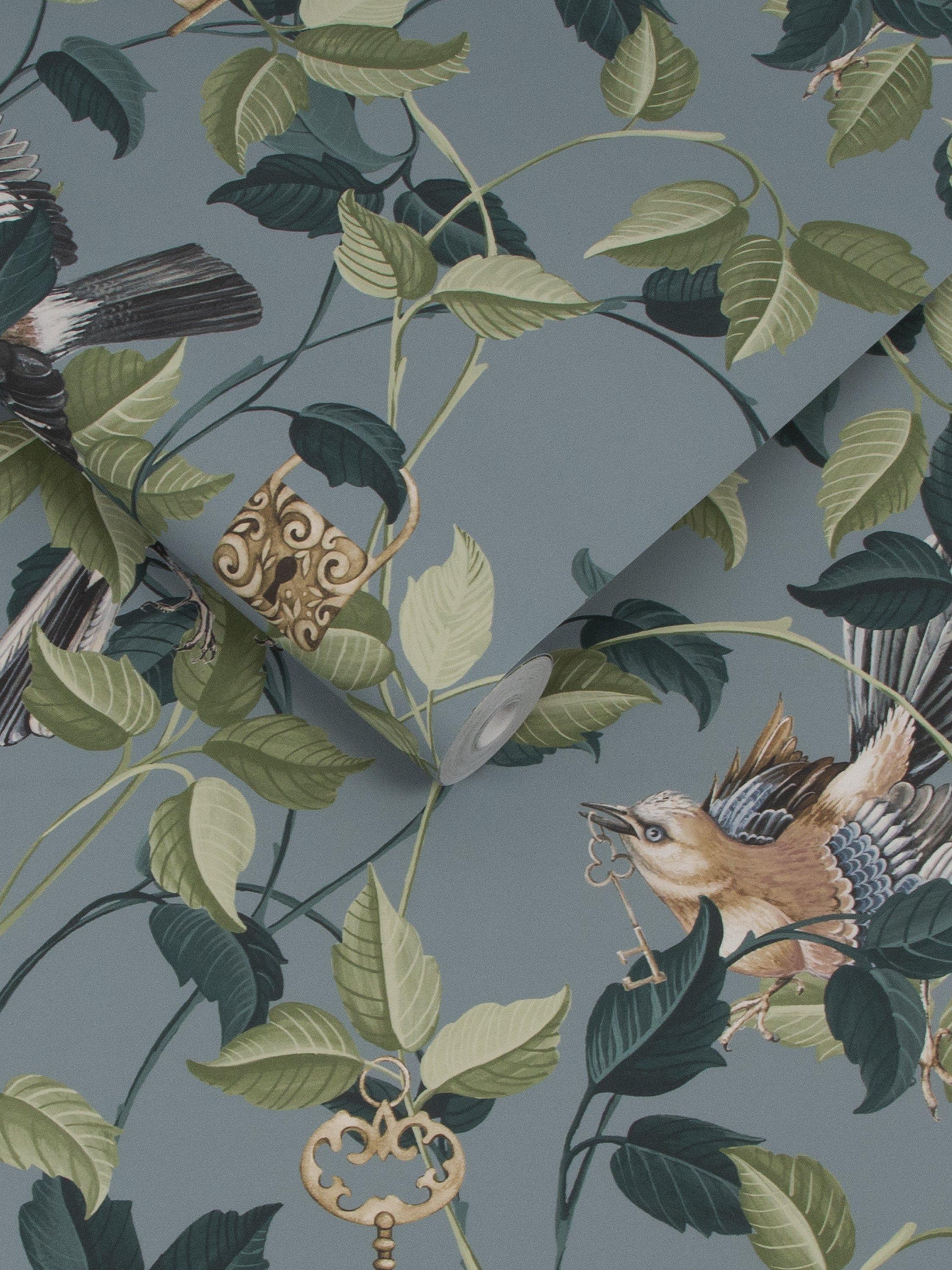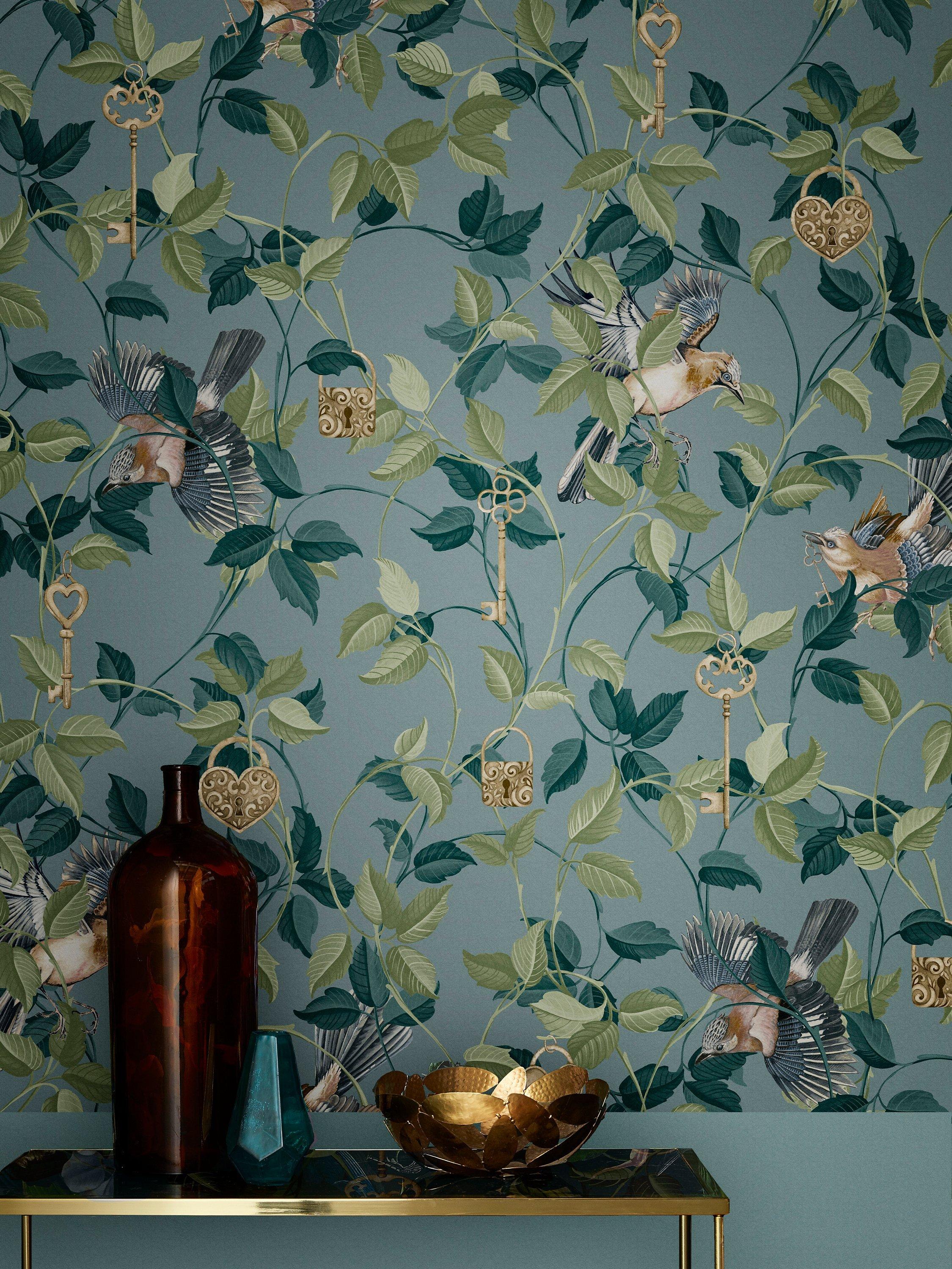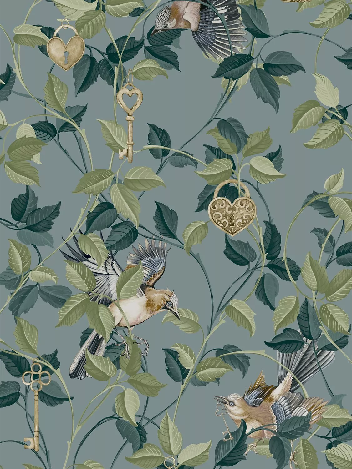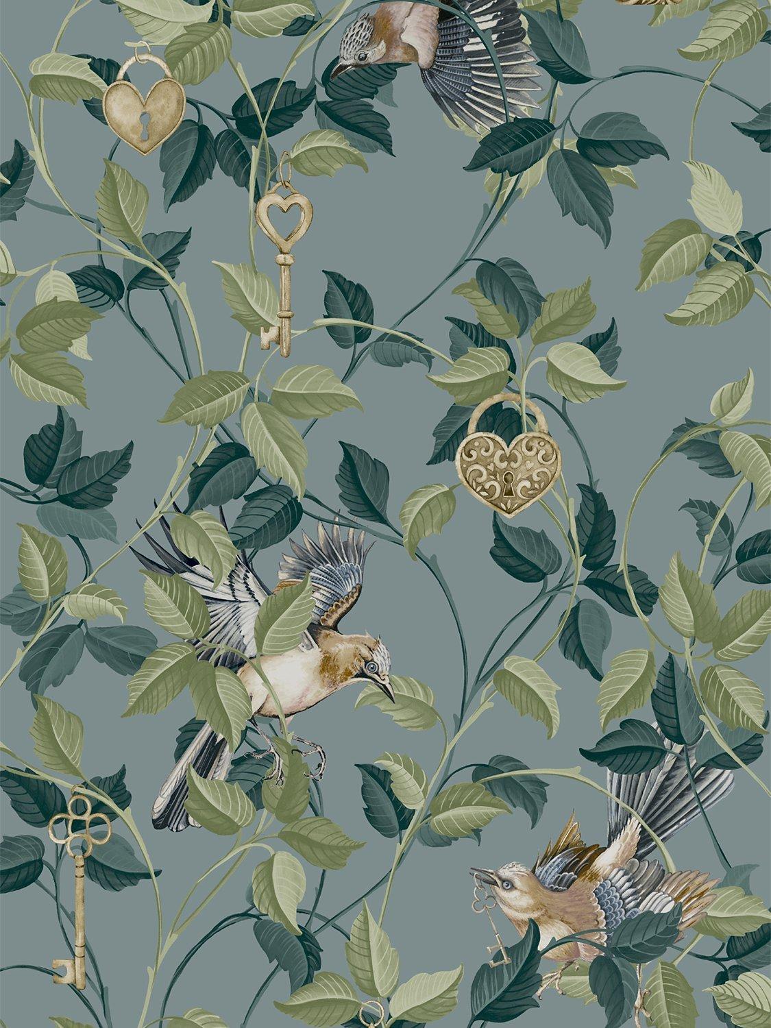 Lock & Key is a unique design bound to impress. The design features intricate padlocks and keys amongst layers of branches and leaves on warm blue backdrop. Look further and you will find elegant, hand-drawn birds spreading their wings among the branches of this charming design.