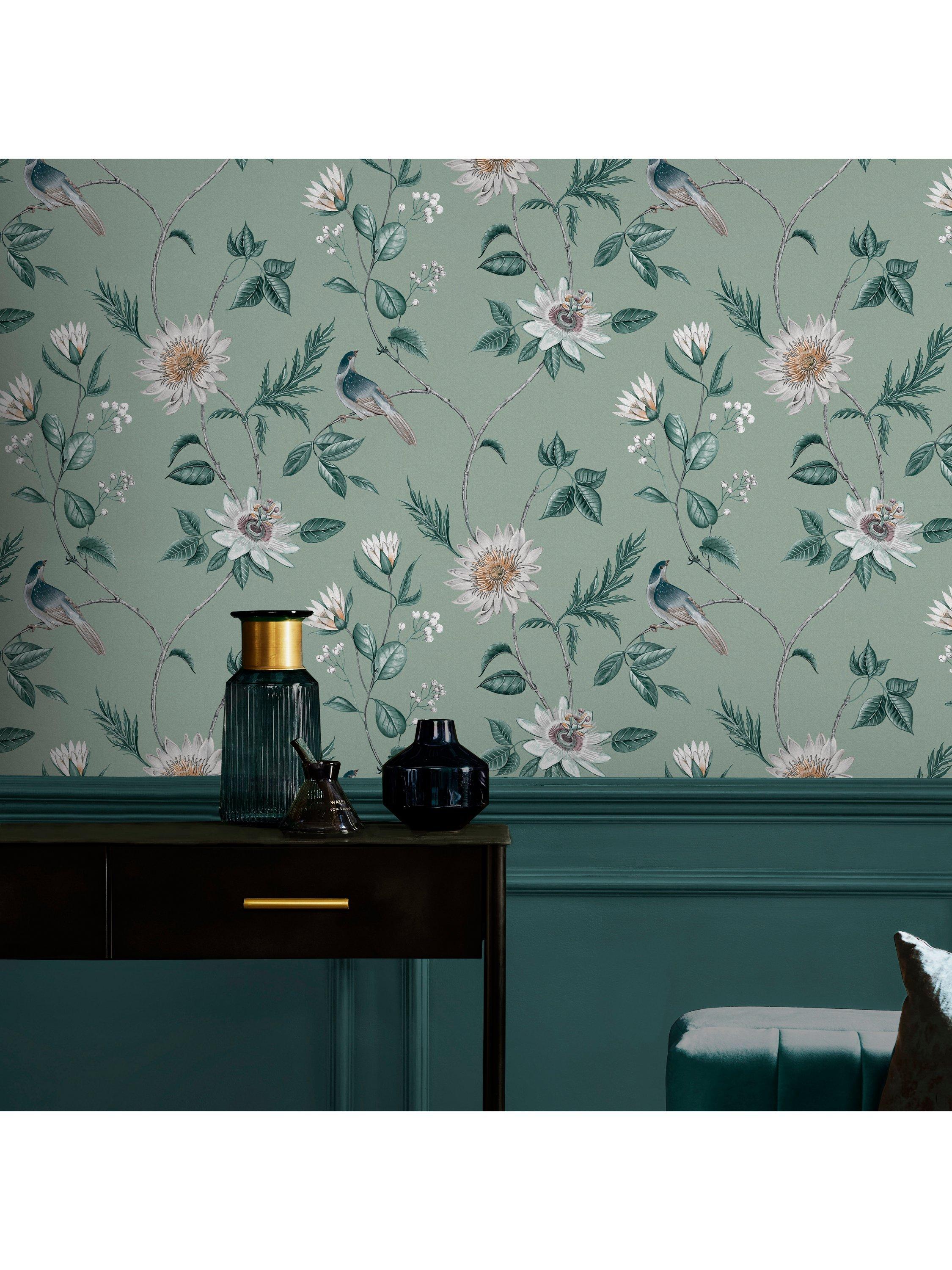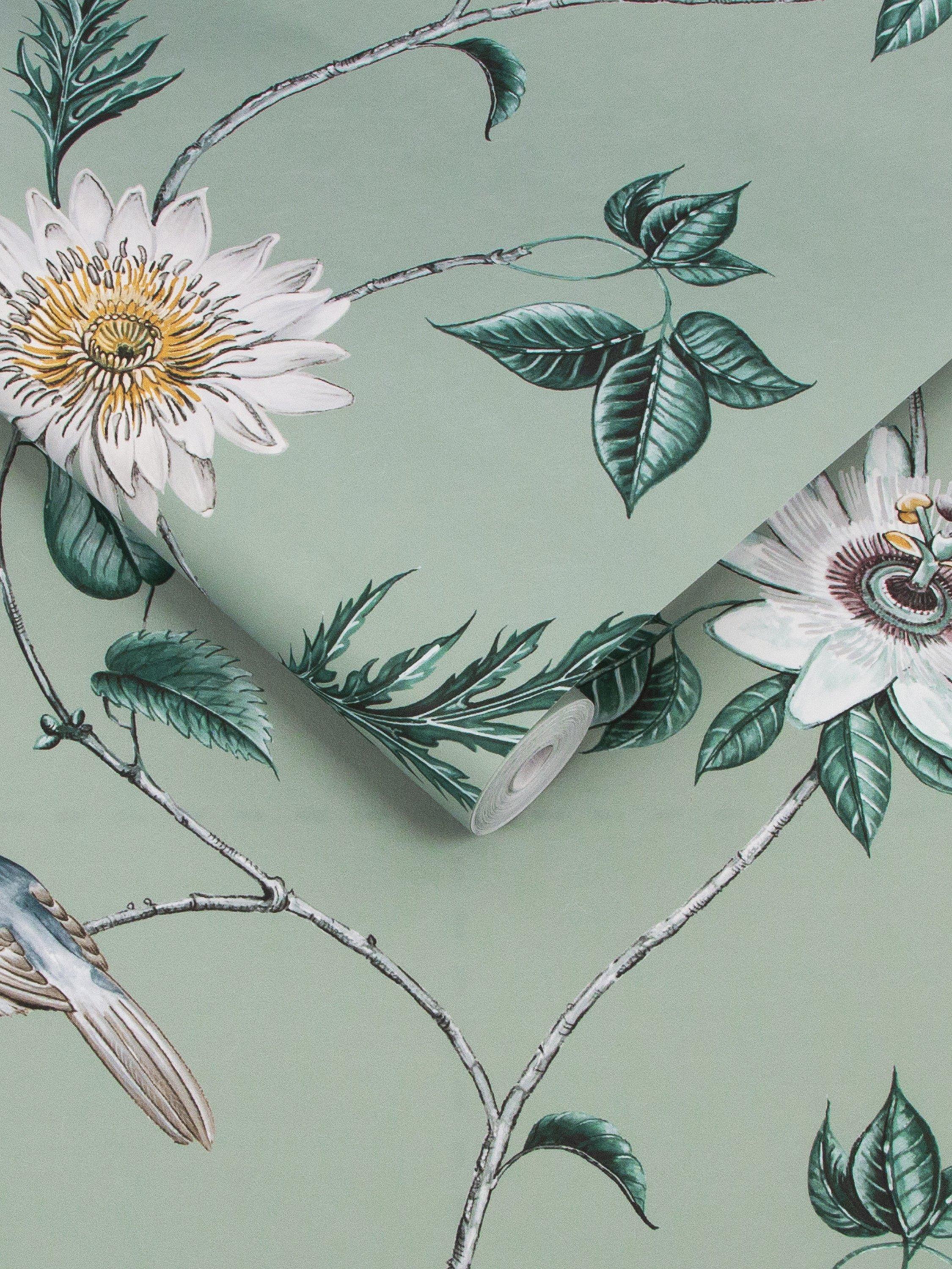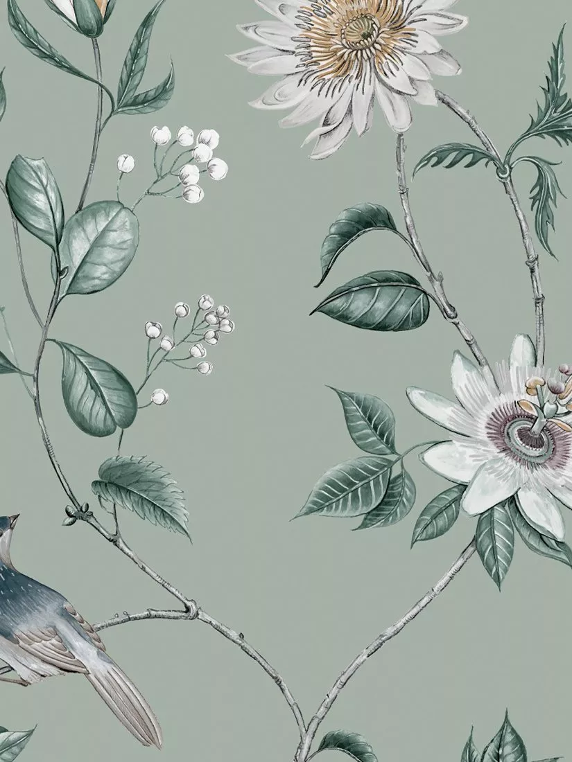 Nuit in sage is a delicate and airy design featuring hand drawn blossoming florals alongside beautiful birds hidden within the branches. The sage green backdrop sits naturally alongside the trails and leaves creating the illusion of a luscious garden within your own home.