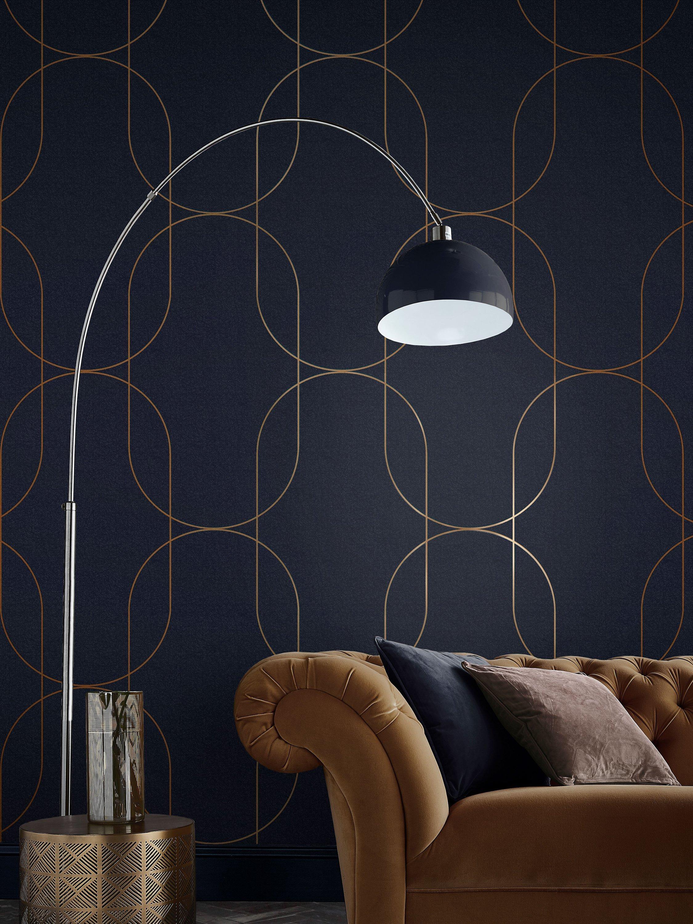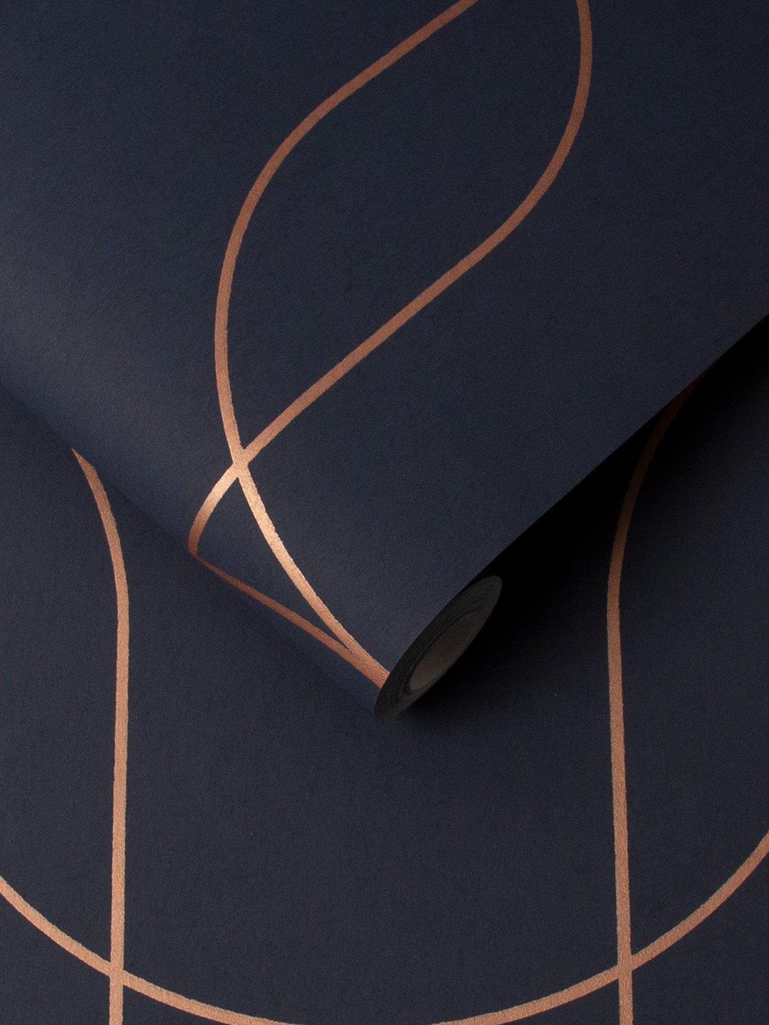 Palais features fine metallic gold curves swooping across a textured backdrop. This subtle geometric design is perfect for adding a touch of depth and dimension in any room.