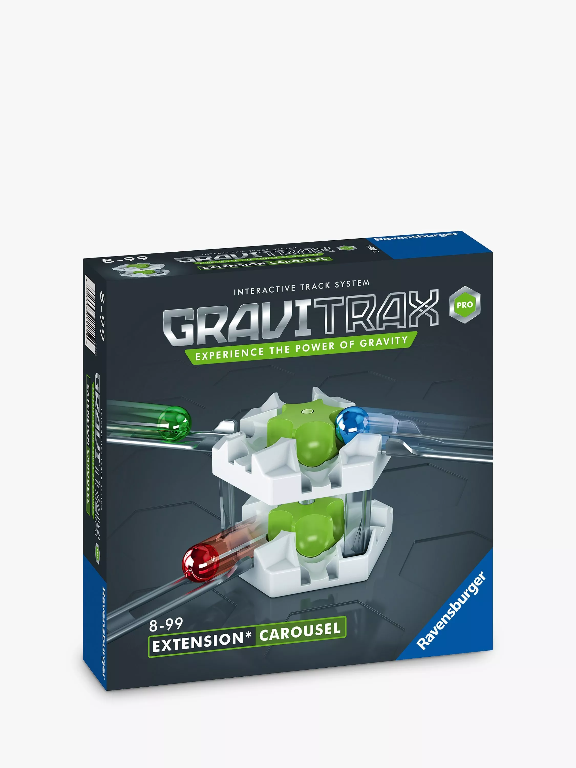 Experience diversity! The carousel is a real all-rounder: two levels are connected via several entrances and exits and the stone can be used several times during one pass. Rolling balls can either take a seat in the carousel or let it start. Once the carousel is in motion, all parked balls are sent onto the track. How often can the balls drive the carousel in one pass? Combine with the GraviTrax Pro Starter Set and take your track to a new level.