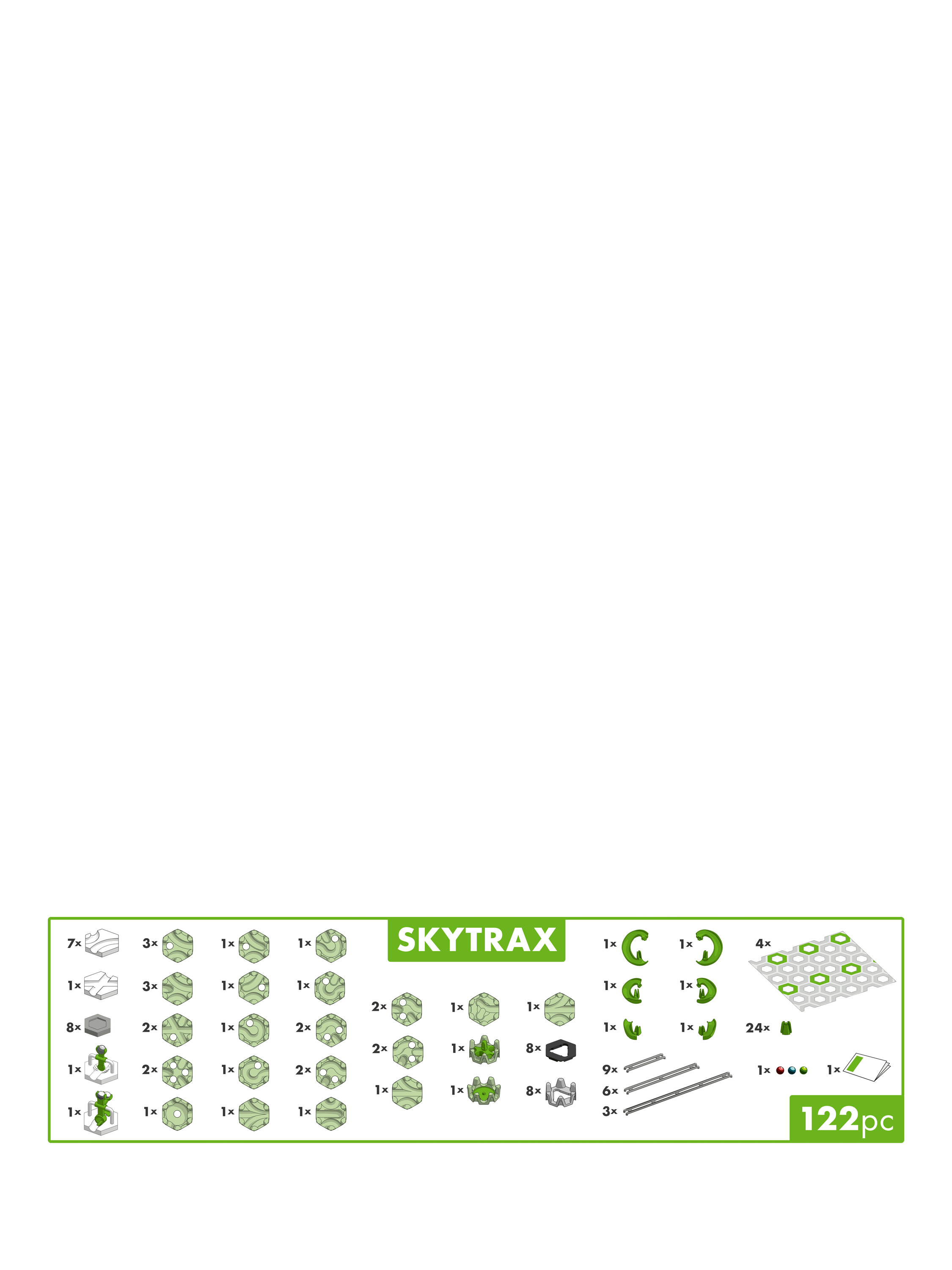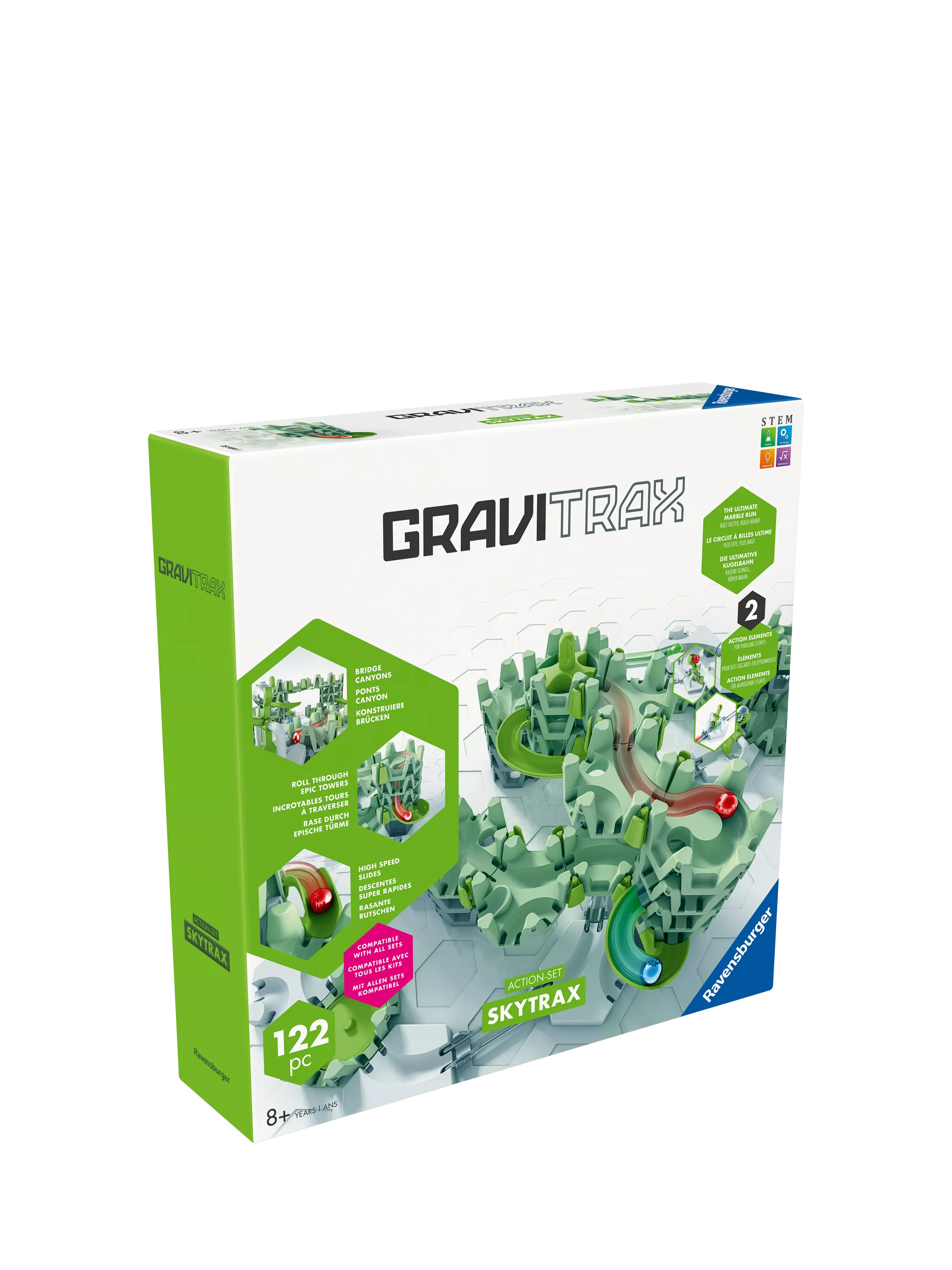 With the GraviTrax SkyTrax Action Set, you'll experience creative building fun like never before. The innovative SkyTrax stones offer thrilling new features: Let the marbles fall through the stones, catch them and connect them to form bridges. The Slides send the marbles speeding and spinning around the majestic towers.