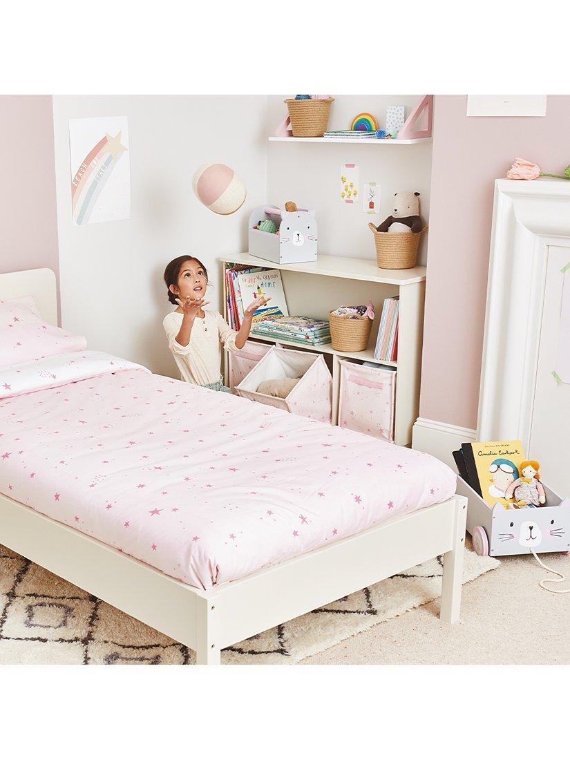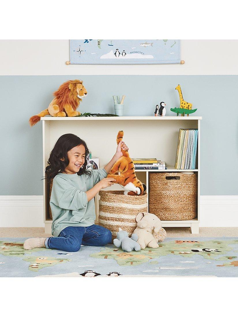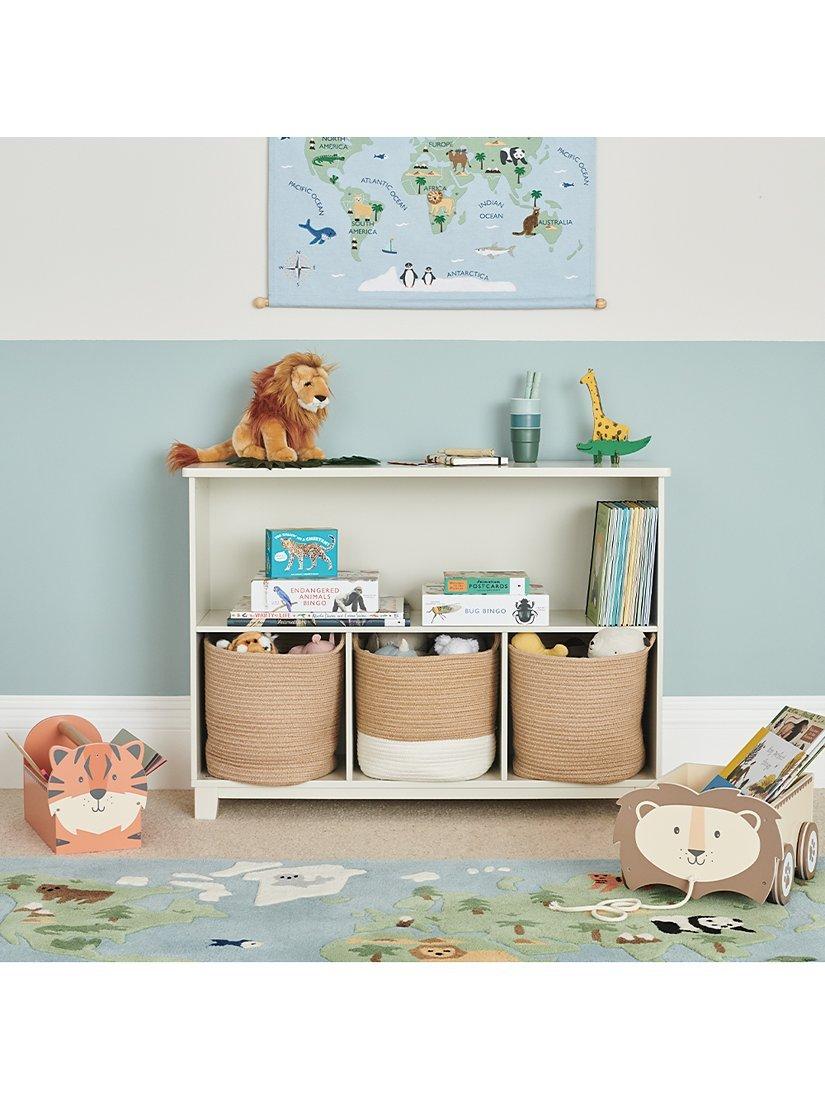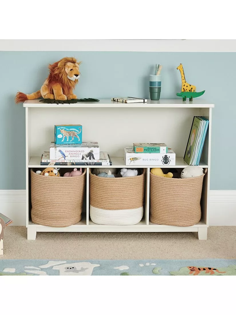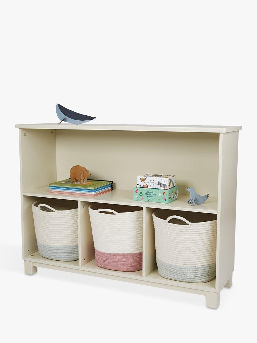 This compact, contemporary playroom essential is full of clever storage potential. Featuring stylish feet to elevate it from floor level, it holds up to 3 canvas storage cubes plus low shelving for easy access to books and toys.