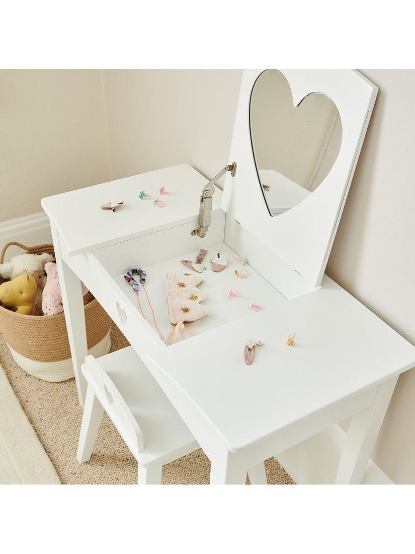 Sitting pretty is this stunning sweetheart dressing table and stool set from Great Little Trading Company. A wonderful gift for roleplay fun, this beautifully designed furniture is crafted from solid wood and features sweet cut-out heart detailing. Lift up the lid to reveal a secret storage drawer - perfect for stowing away accessories and trinkets. A true heirloom to treasure, little ones will love practicing self-care and acting out pretend play scenarios.