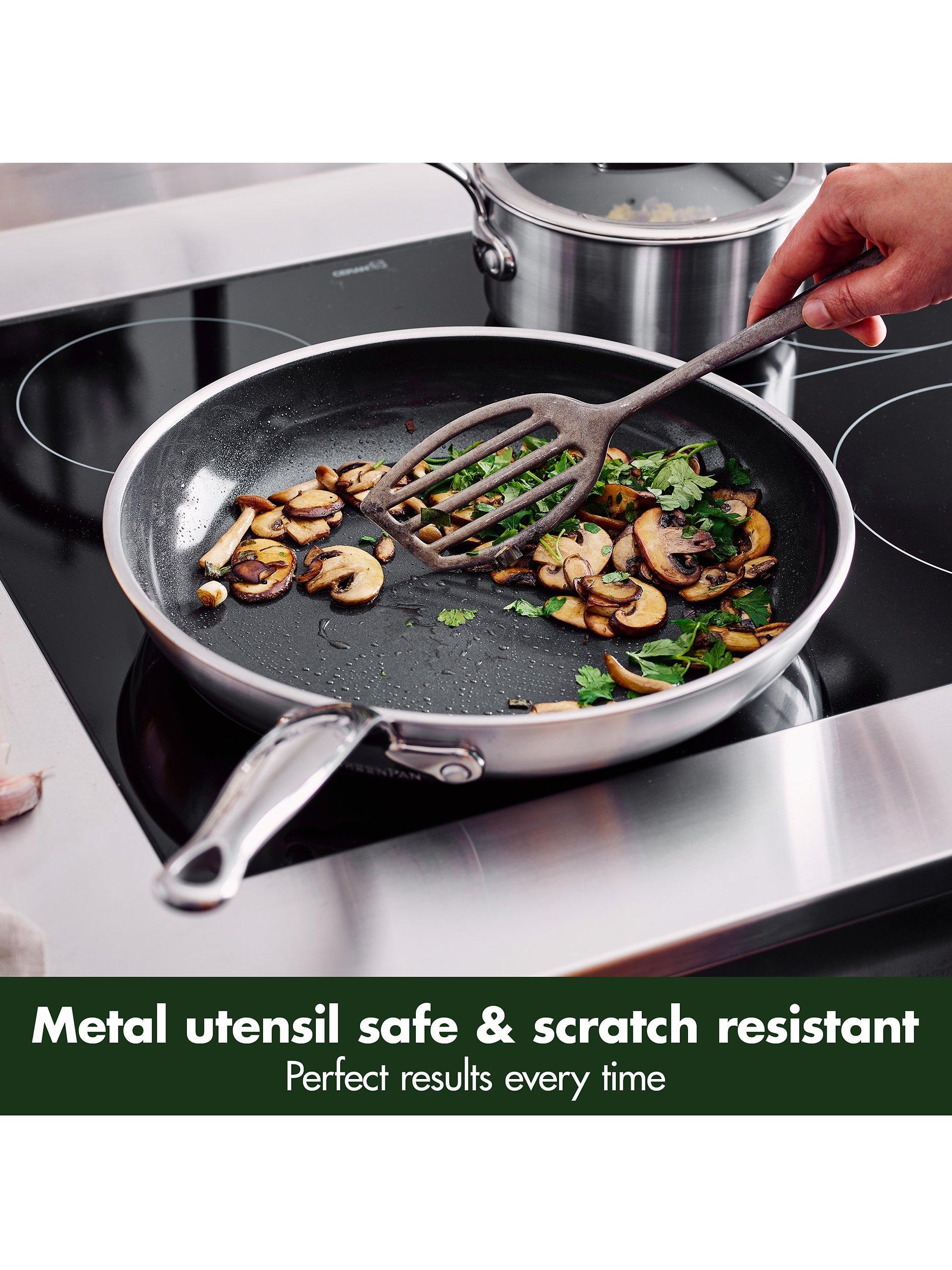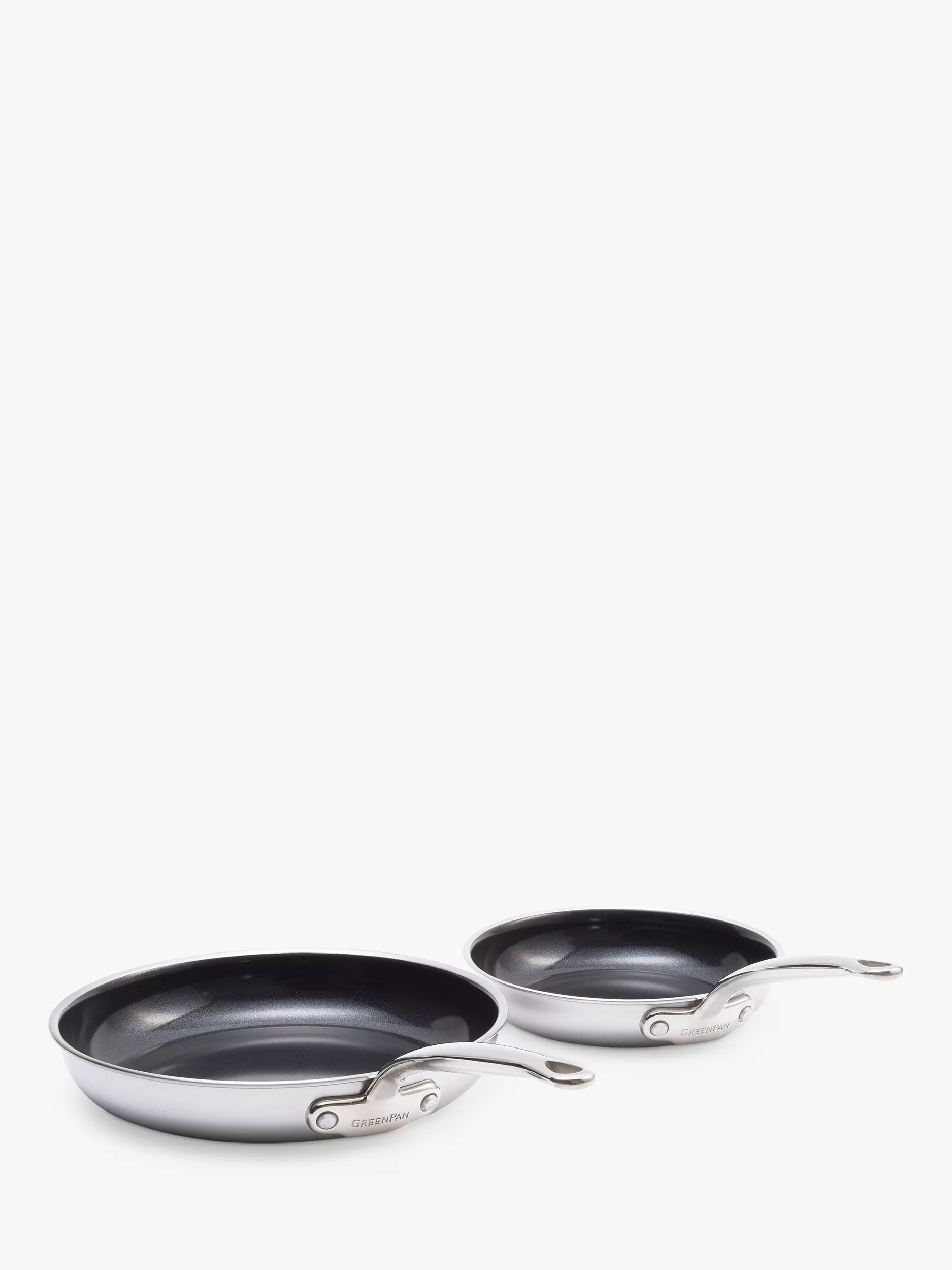 A set of two GreenPan Première 3 Ply Stainless Steel Ceramic Non-Stick Frying Pans in two essential sizes, 20cm and 28cm. The Première stainless steel collection from GreenPan is innovative and durable, with an advanced non-stick coating.