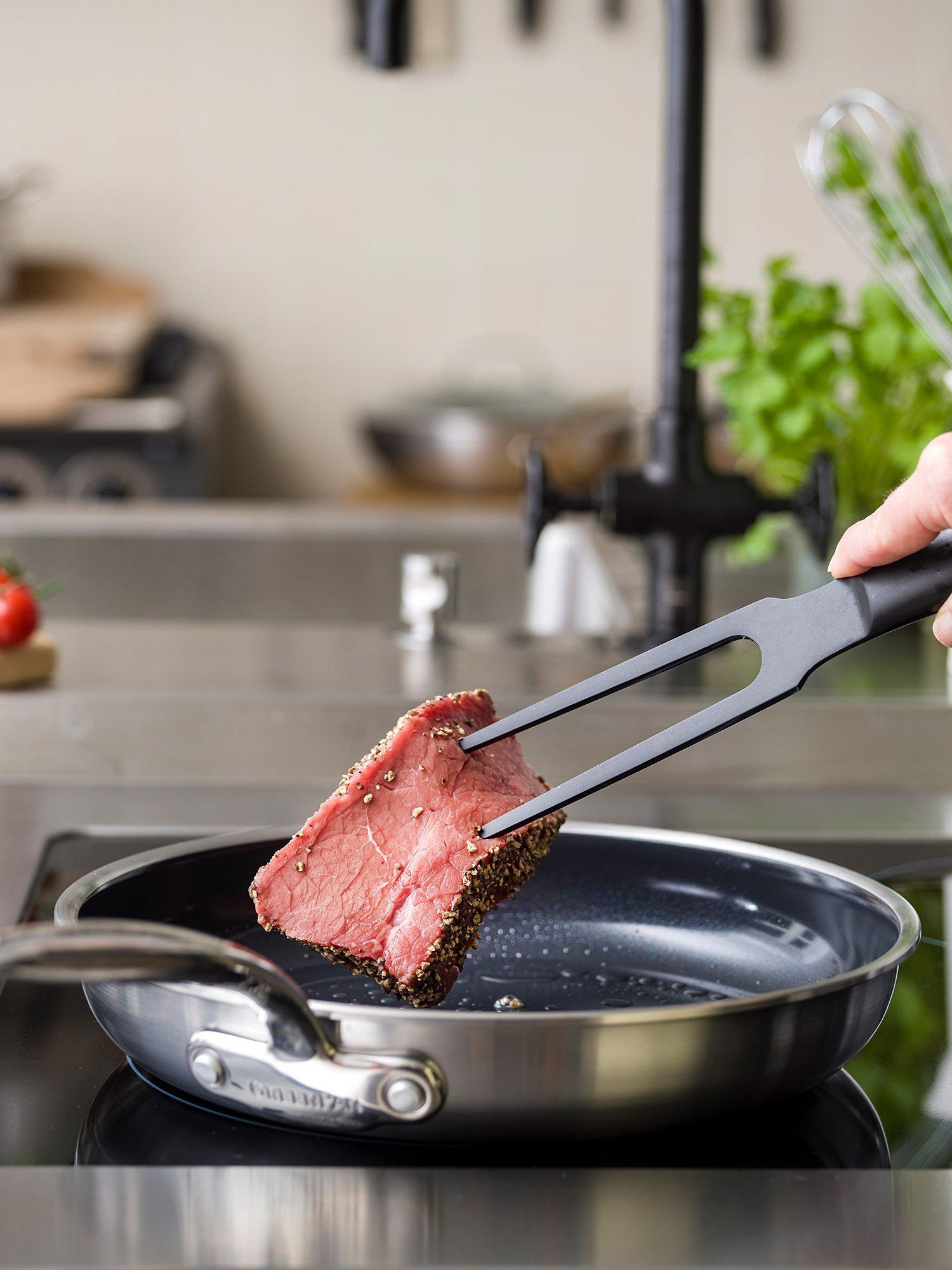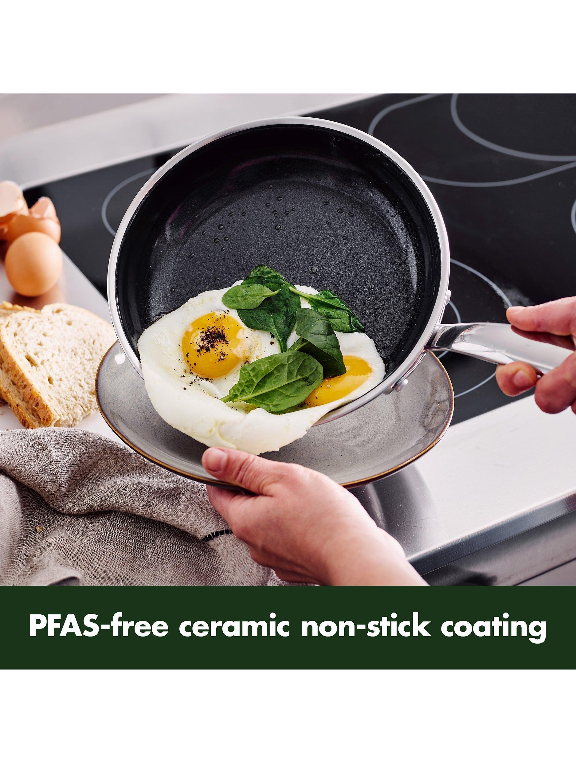 Use of oils - it's recommended to use a little bit of oil or butter when using ceramic non-stick. It's good to note that Extra Virgin Olive Oil and oil sprays carbonise (creating the brown, sticky stains that won't come off the pan) very quickly when the pan is heated and should be avoided when cooking with ceramic non-stick.