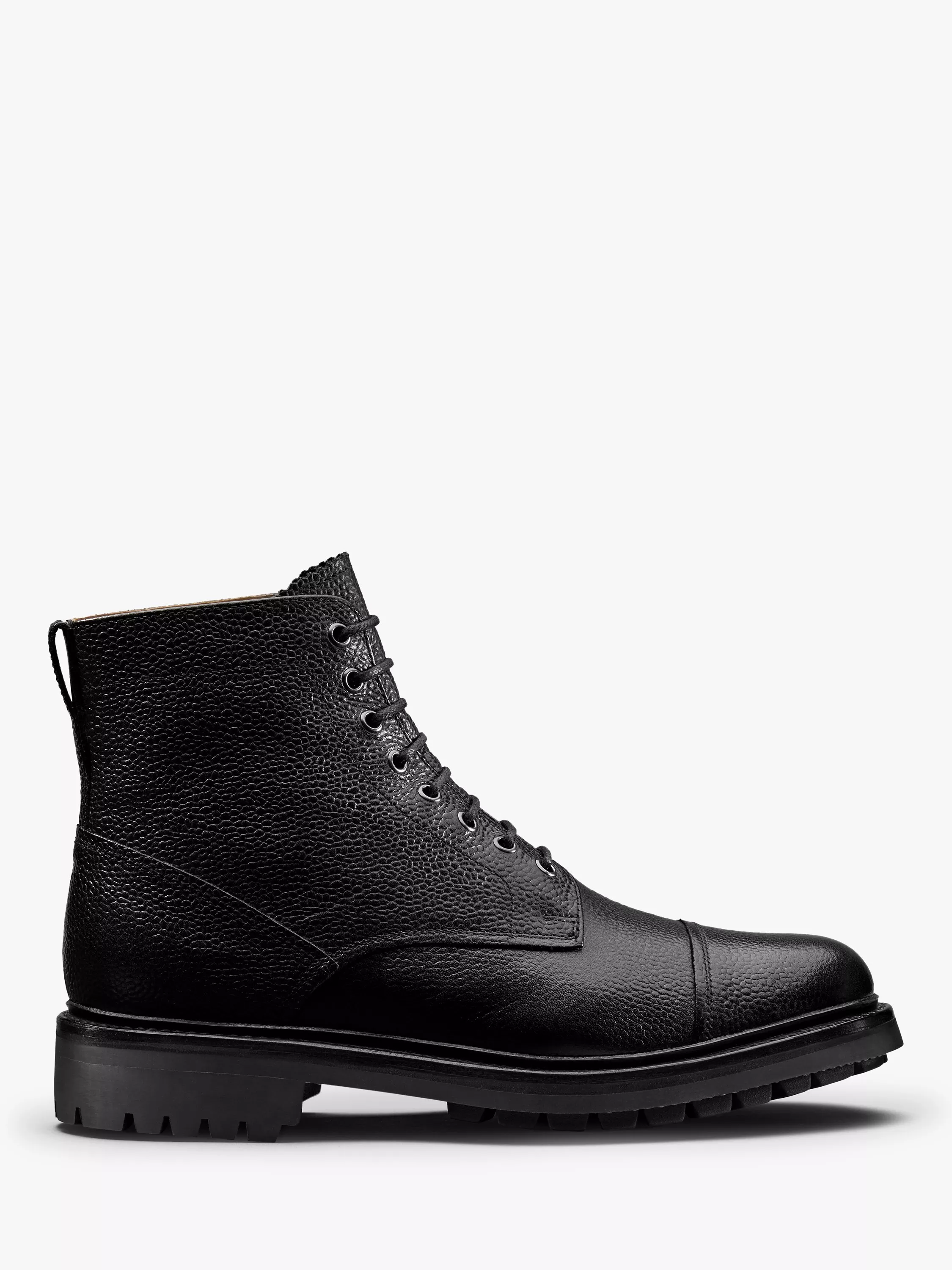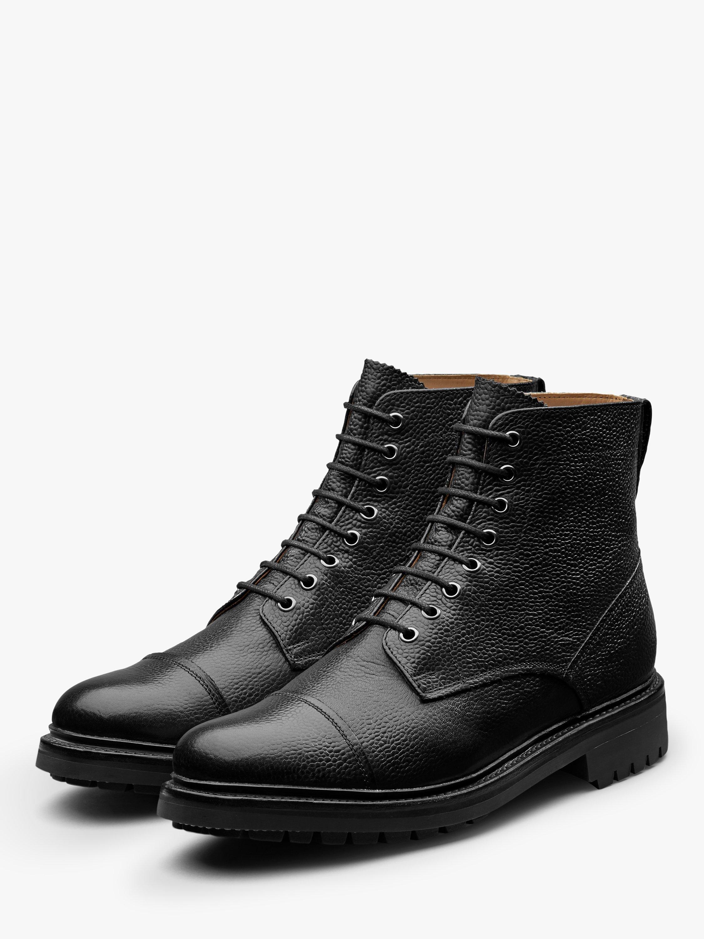 Joseph is a classic military style toe cap derby boot. Simply styled in black country grain, he has a natural split welt and a black solid rubber commando sole.