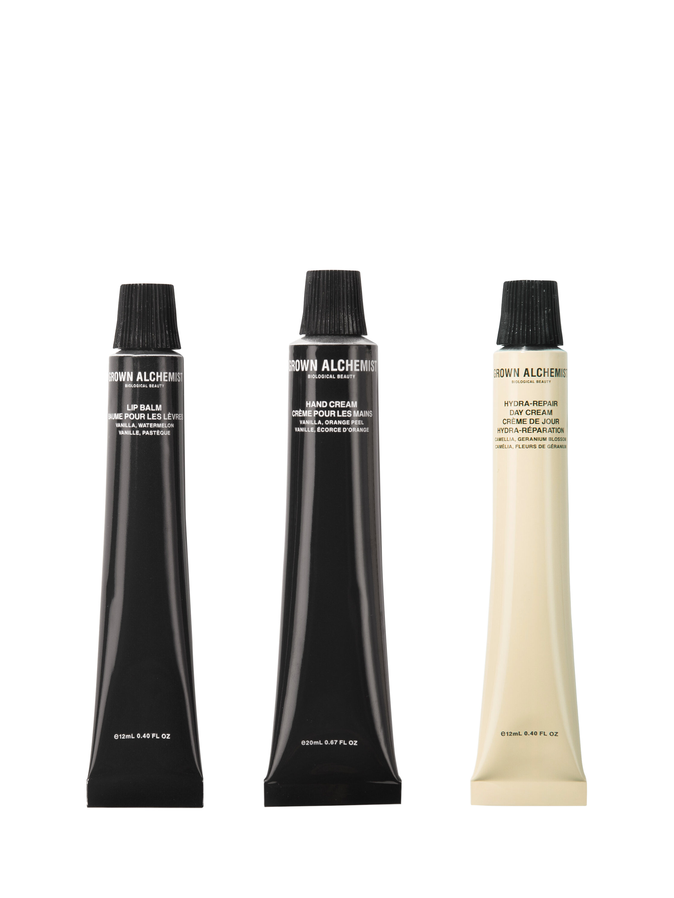 Three Grown Alchemist hero products for everything you need to keep lips, hands and face healthy and hydrated on the go.