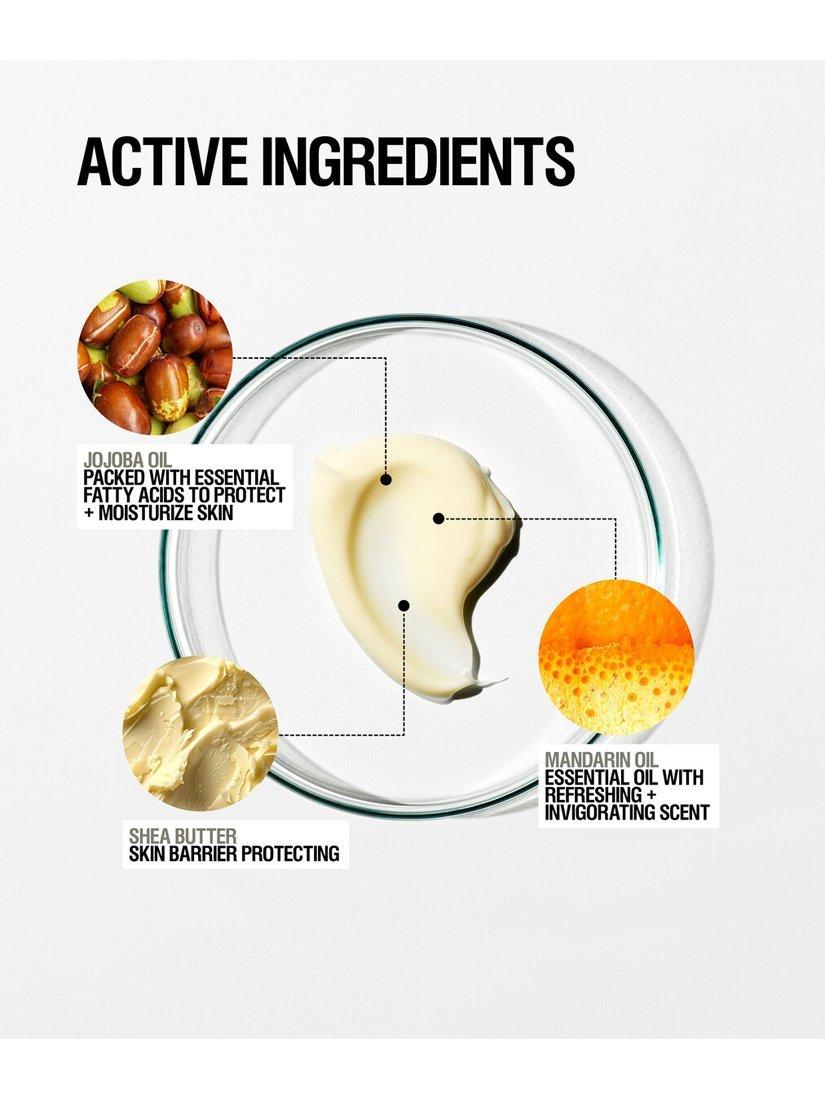 Formulated with Shea Butter, Jojoba, Rosehip and a blend of Mandarin, Rosemary Leaf and Orange Peel oil to leave skin subtly scented.
