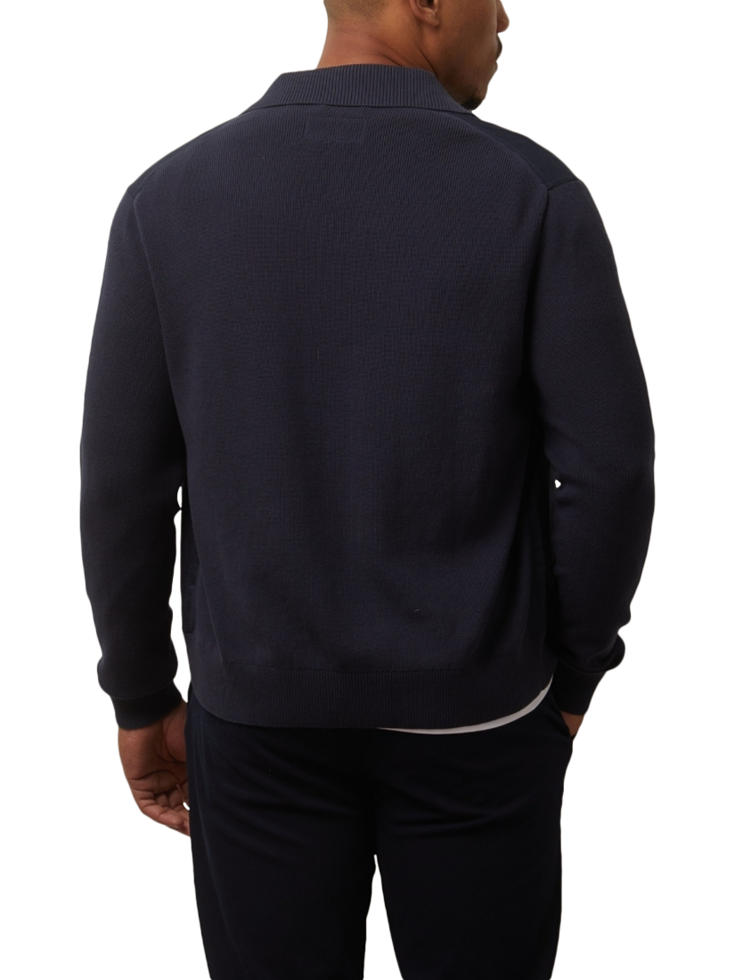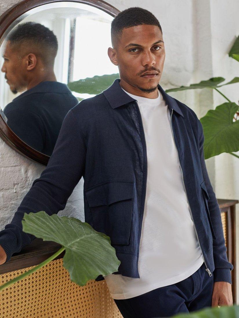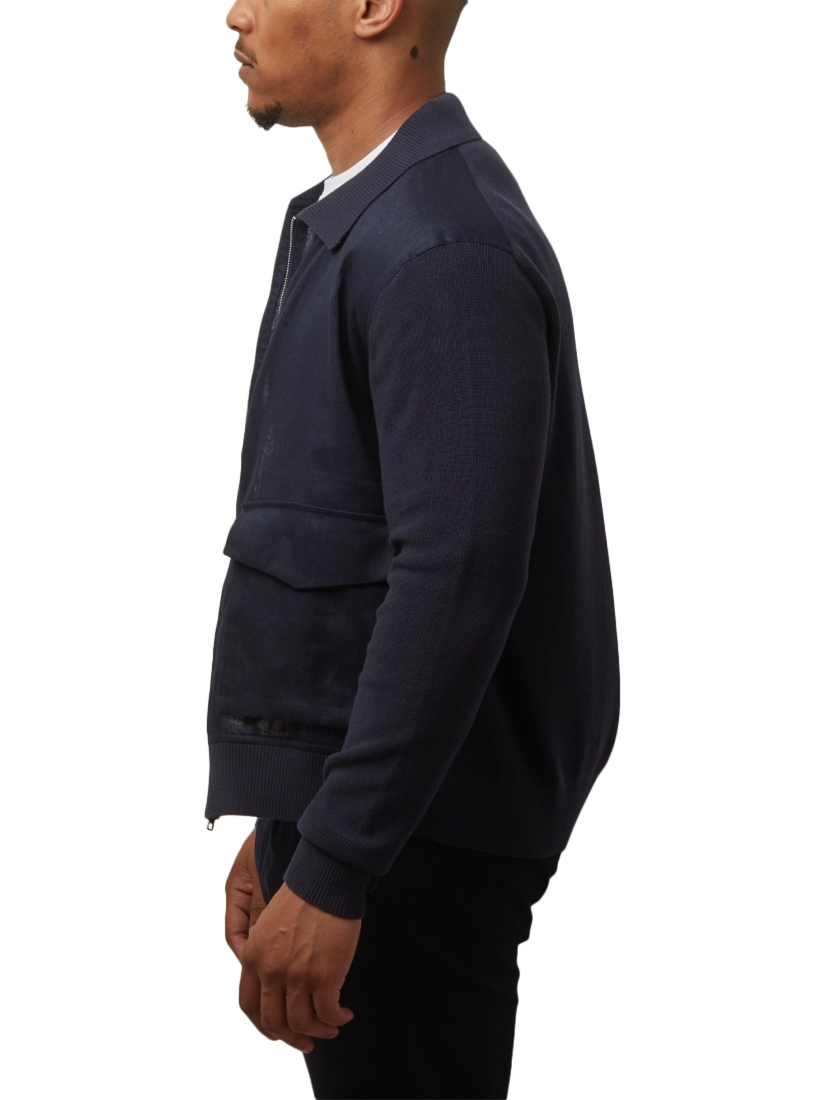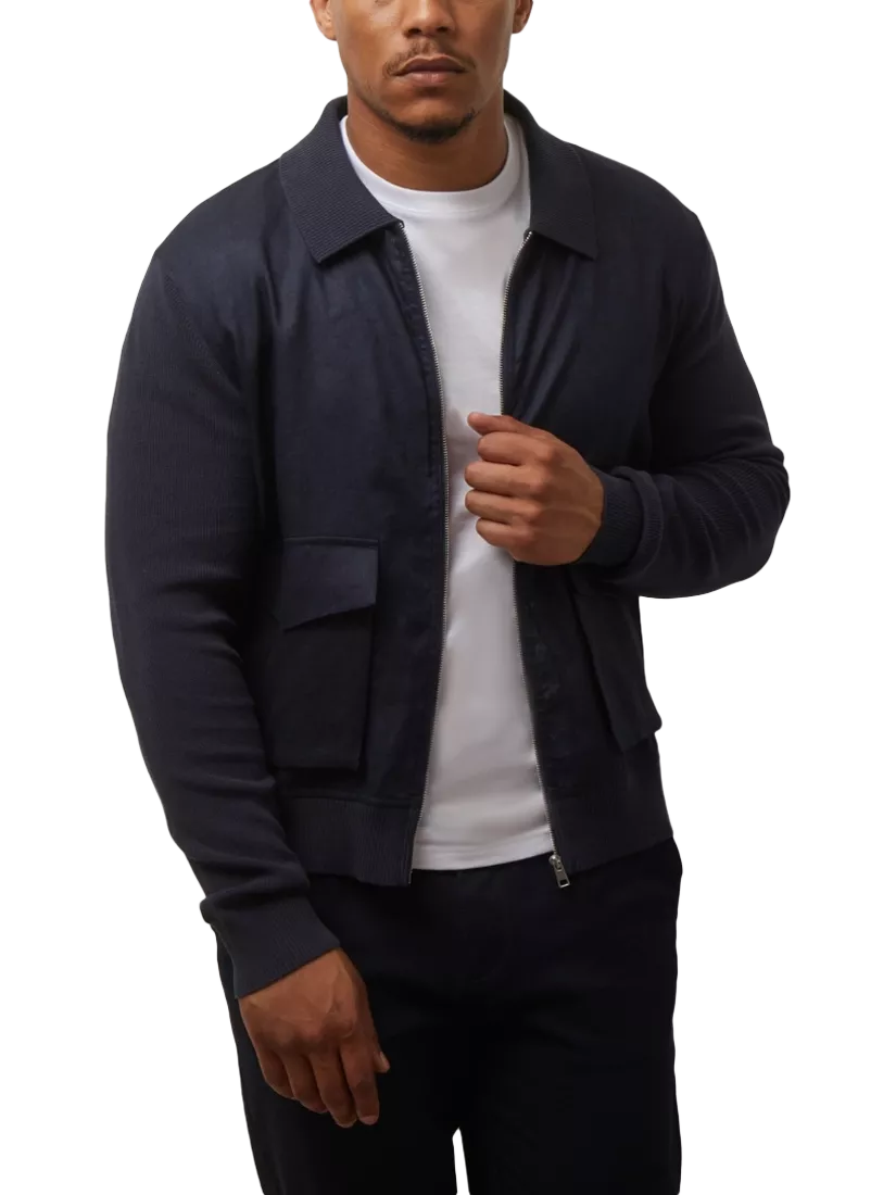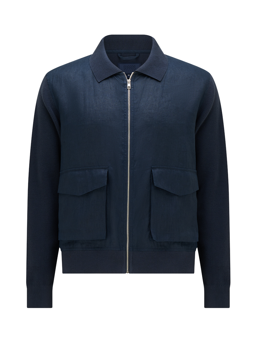 The Carter hybrid jacket by Guards London blends casual refinement with seasonal versatility. Featuring a zip-up front and patch pockets, it’s crafted with soft knitted and linen panels, offering a modern contrast in texture with a tailored silhouette. It is the perfect lightweight layer for transitional weather.