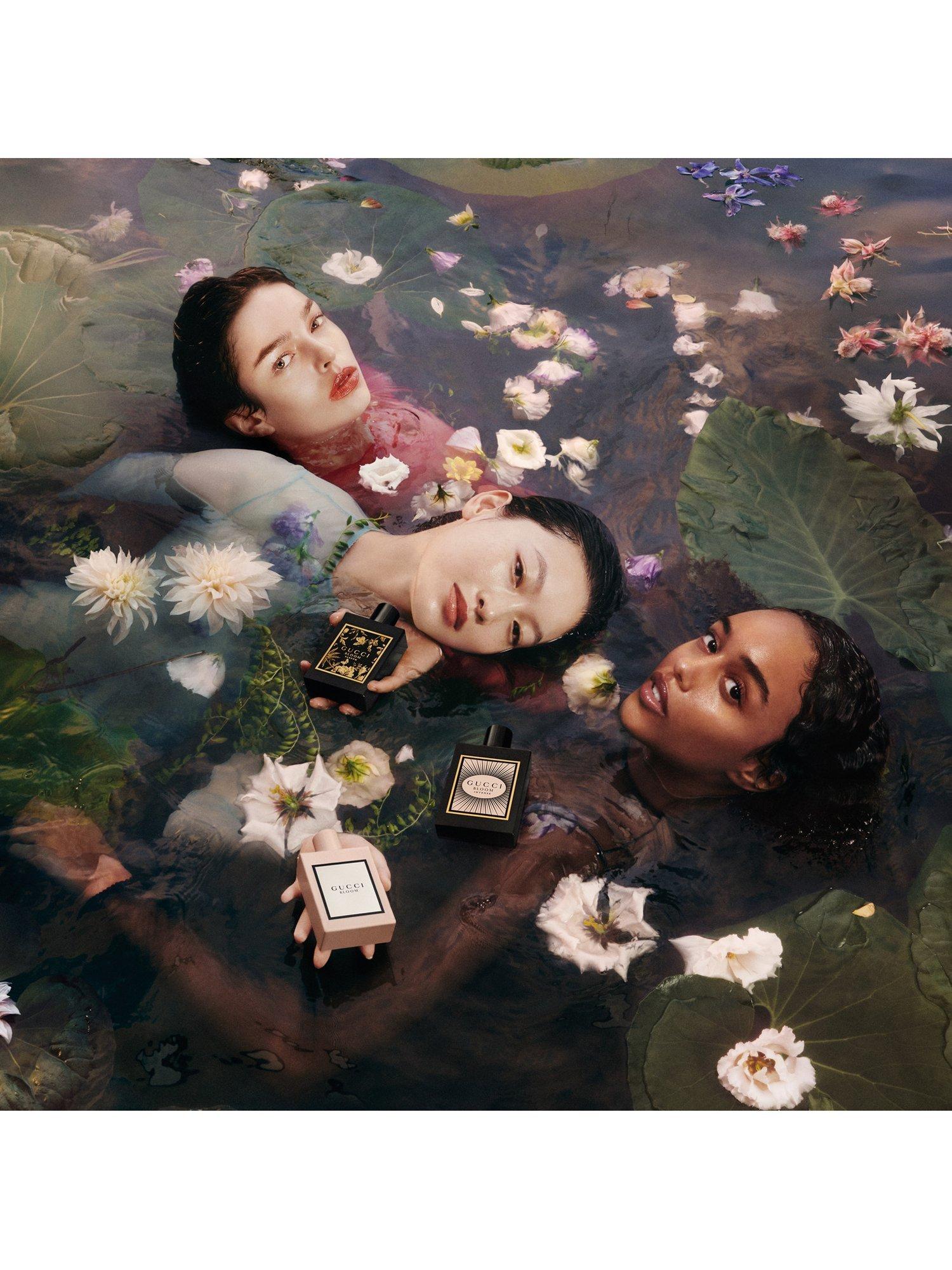 The bottle: The bottle is presented in a striking midnight black that echoes the concentrated depth and power of the juice within. The House’s iconic print of leaves, cherry branches, flowers, and butterflies is finished in gold to evoke its warm, elegant lightness. A modern portrayal of blooming femininity, Gucci Bloom is a place of self-discovery, where beauty blossoms and women celebrate each other as they evolve.
