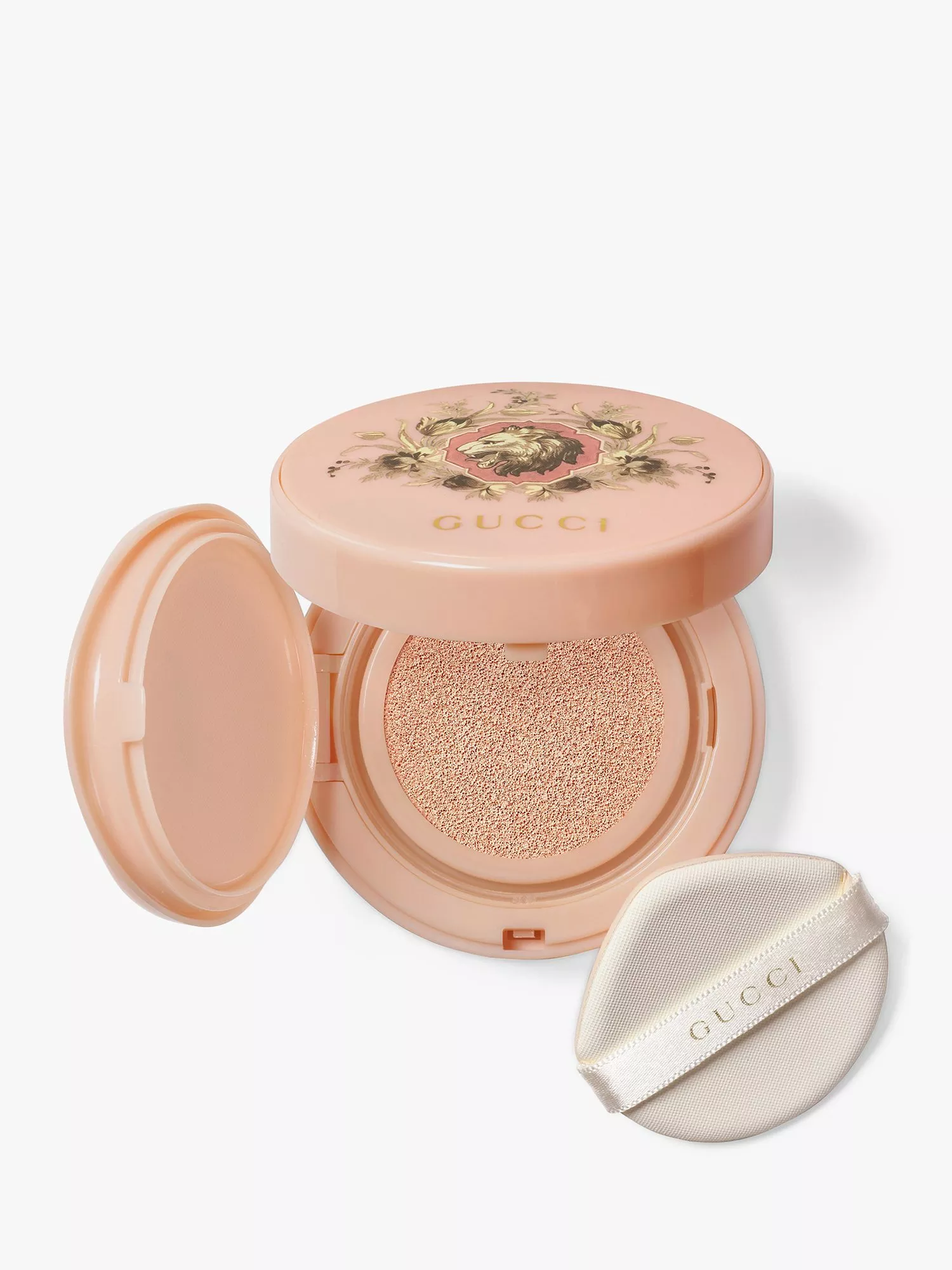 What else you need to know: This Gucci luminous foundation blends seamlessly into the skin, delivering flawless, adjustable light to medium coverage for a very natural finish. Available in twelve foundation shades that provide intense hydration that lasts all day, Cushion De Beauté skin-caring foundation by Gucci Beauty is housed within a refillable pastel pink compact, complete with a mirror and a soft cushion applicator and embellished with a lion motif encircled by a wreath of flowers. The external packaging echoes this delightful design, adding an extra touch of allure and playfulness.