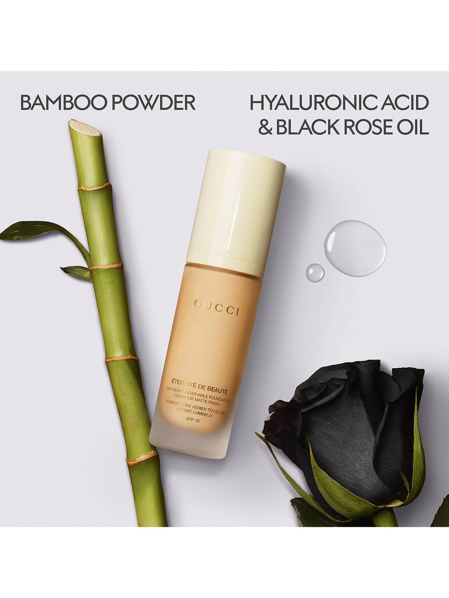 The Formula: A combination of high-skin affinity powders and coated pigments with an ultra-performant polymer technology allows 24-hour wear with zero transfer, while letting the skin breathe. Infused with Hyaluronic Acid and Black Rose Oil, the formula helps to boost and maintain skin hydration. Its very thin, flexible texture feels comfortable, and breathable, like a second skin. Bamboo Powder helps control shine all day. Blending the best of natural luminosity with a perfecting mattifying effect, Gucci foundation instantly blurs pores, evens the complexion, and blends away imperfections. The matte effect is never dull and stays fresh all day long without looking cakey. Formulated with SPF filters for skin protection.