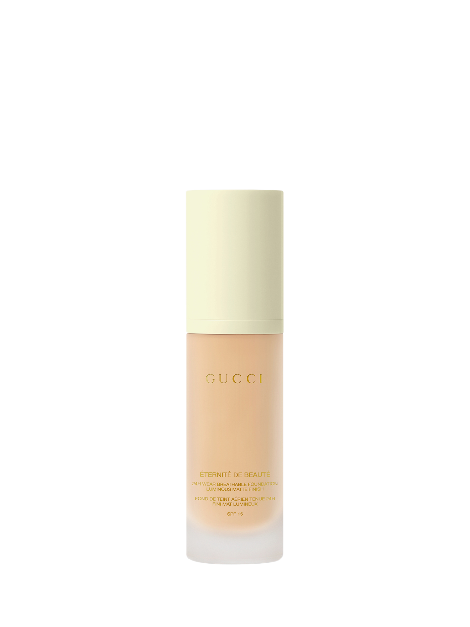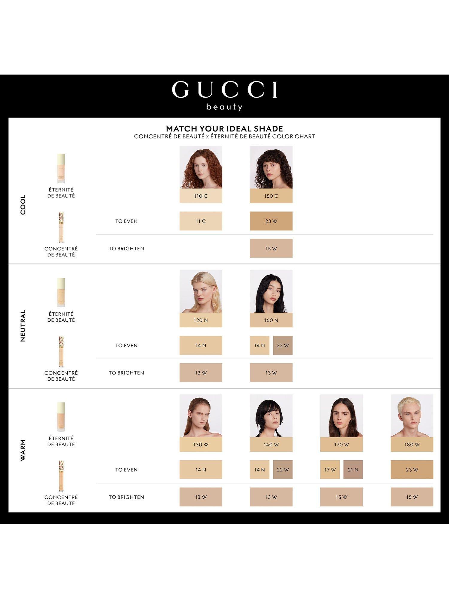 Gucci Éternité De Beauté foundation stays on the whole day, no matter how you play. This 24H, long-lasting Gucci foundation delivers a luminous-matte finish and full coverage in one drop, while feeling breathable, weightless, and comfortable. Available in 40 shades.