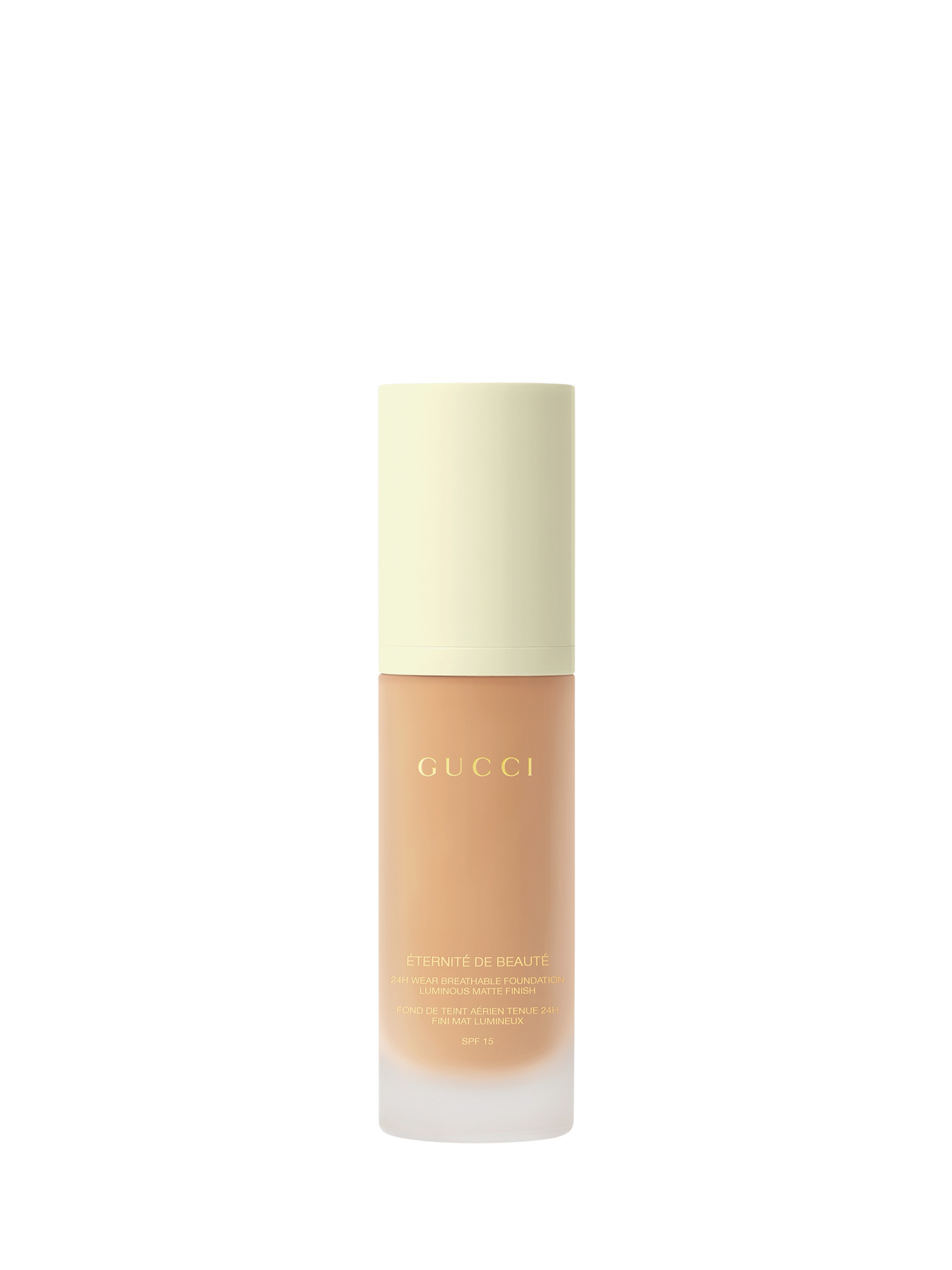 Gucci Éternité De Beauté foundation stays on the whole day, no matter how you play. This 24H, long-lasting Gucci foundation delivers a luminous-matte finish and full coverage in one drop, while feeling breathable, weightless, and comfortable. Available in 40 shades.