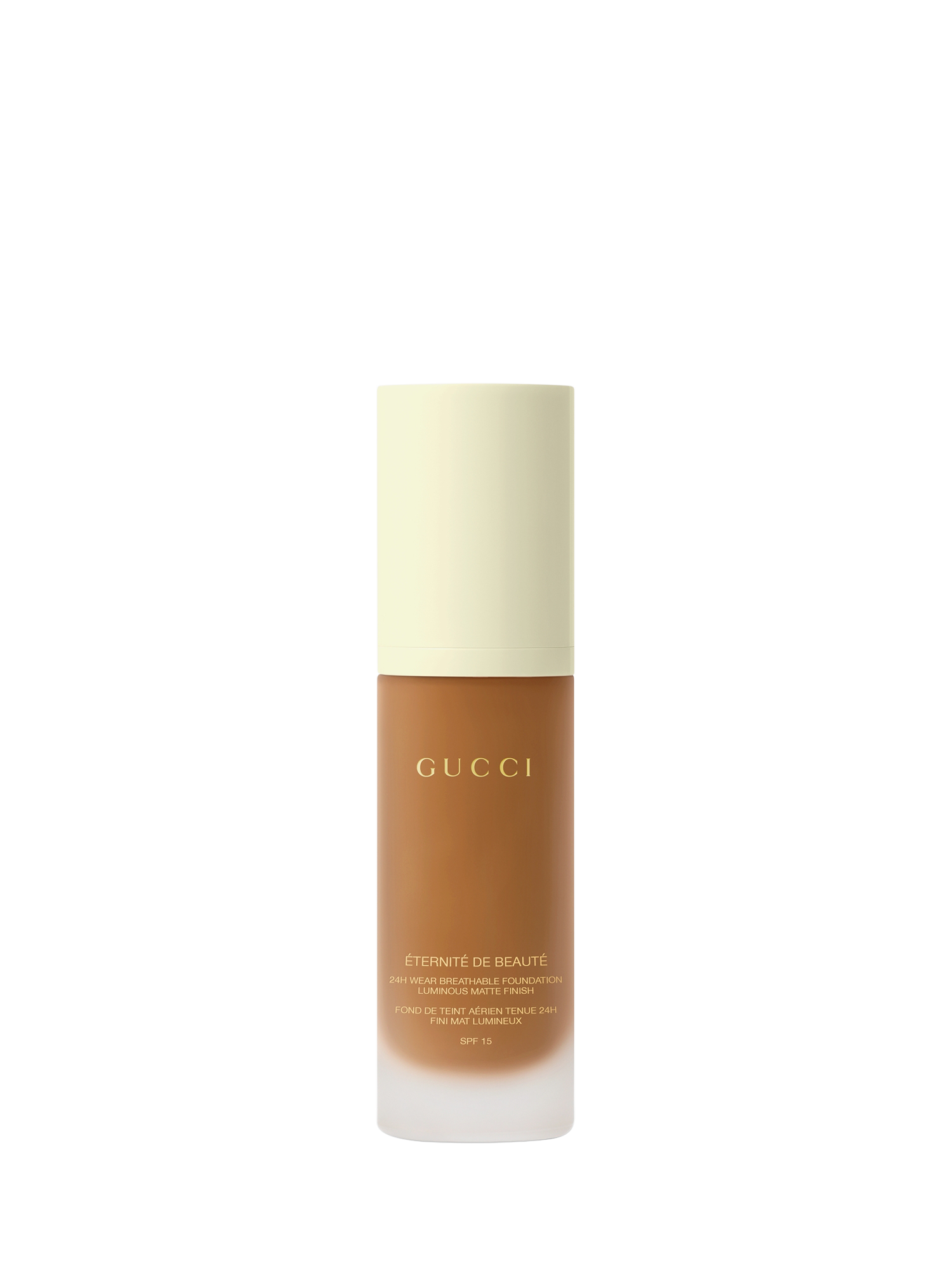Gucci Éternité De Beauté foundation stays on the whole day, no matter how you play. This 24H, long-lasting Gucci foundation delivers a luminous-matte finish and full coverage in one drop, while feeling breathable, weightless, and comfortable. Available in 40 shades.