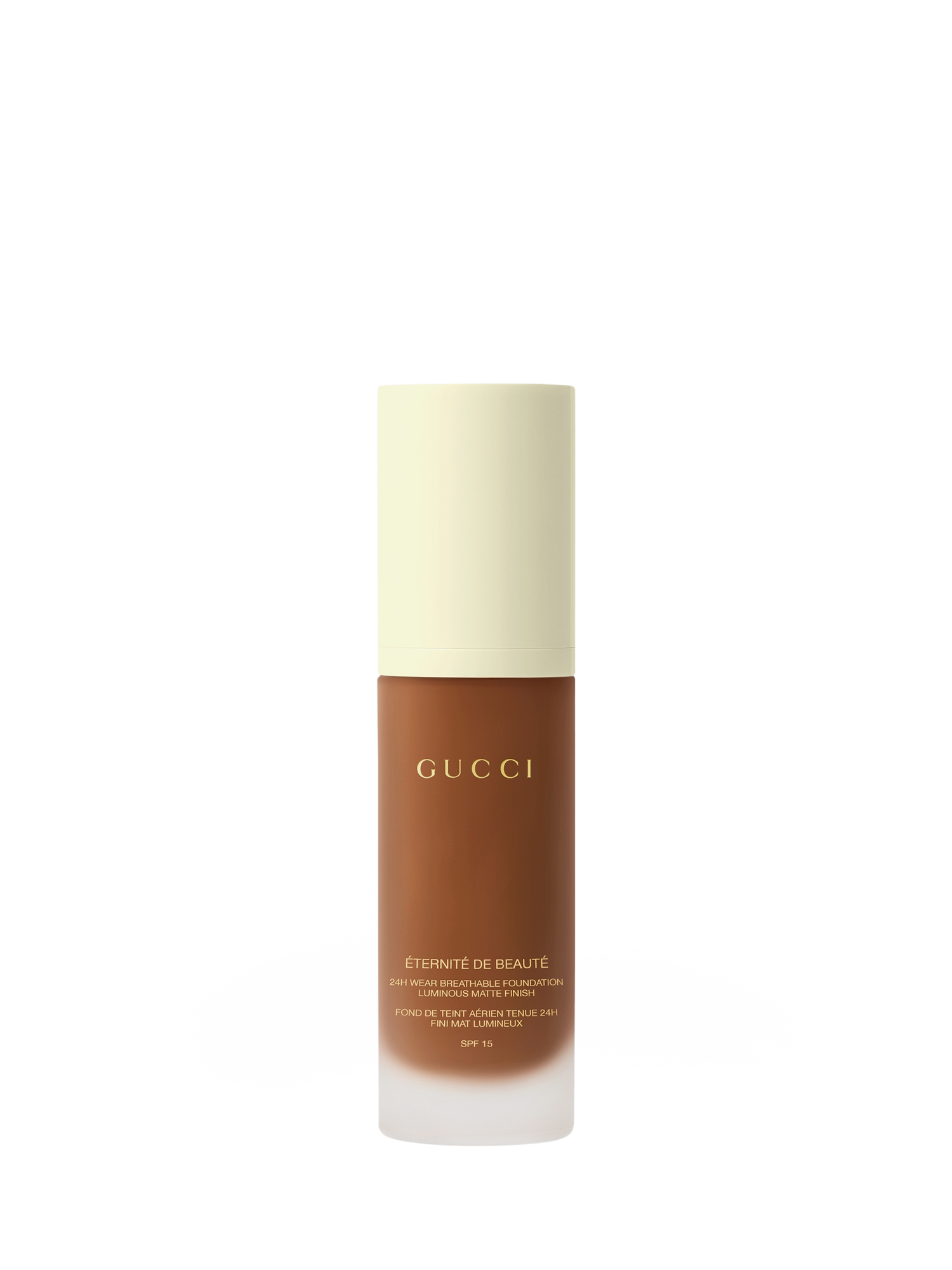 Gucci Éternité De Beauté foundation stays on the whole day, no matter how you play. This 24H, long-lasting Gucci foundation delivers a luminous-matte finish and full coverage in one drop, while feeling breathable, weightless, and comfortable. Available in 40 shades.
