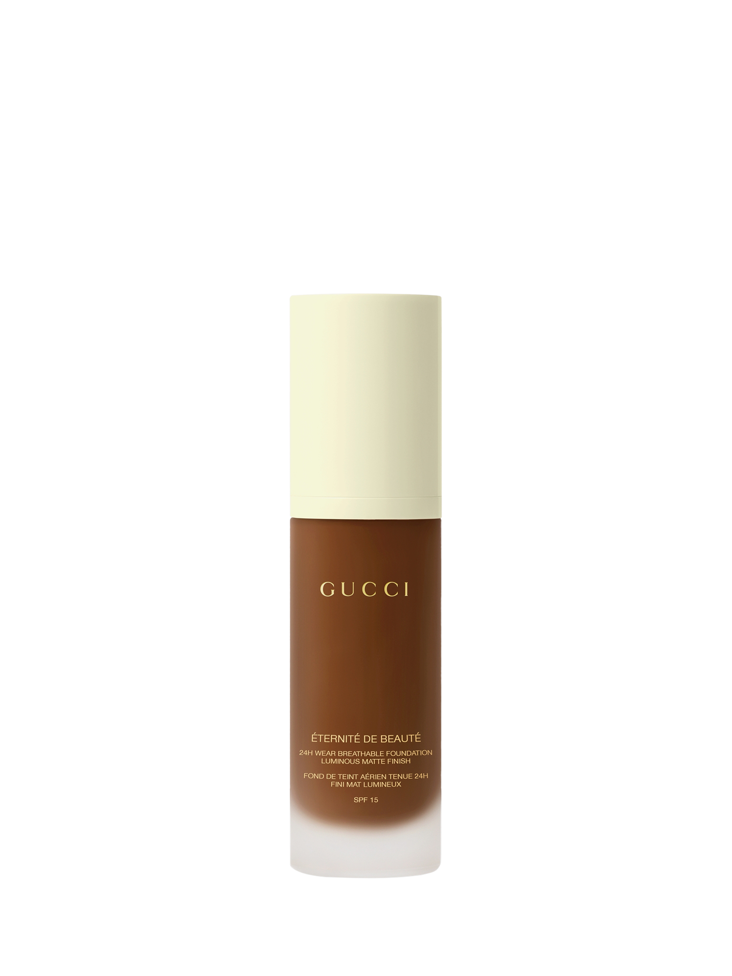 Gucci Éternité De Beauté foundation stays on the whole day, no matter how you play. This 24H, long-lasting Gucci foundation delivers a luminous-matte finish and full coverage in one drop, while feeling breathable, weightless, and comfortable. Available in 40 shades.