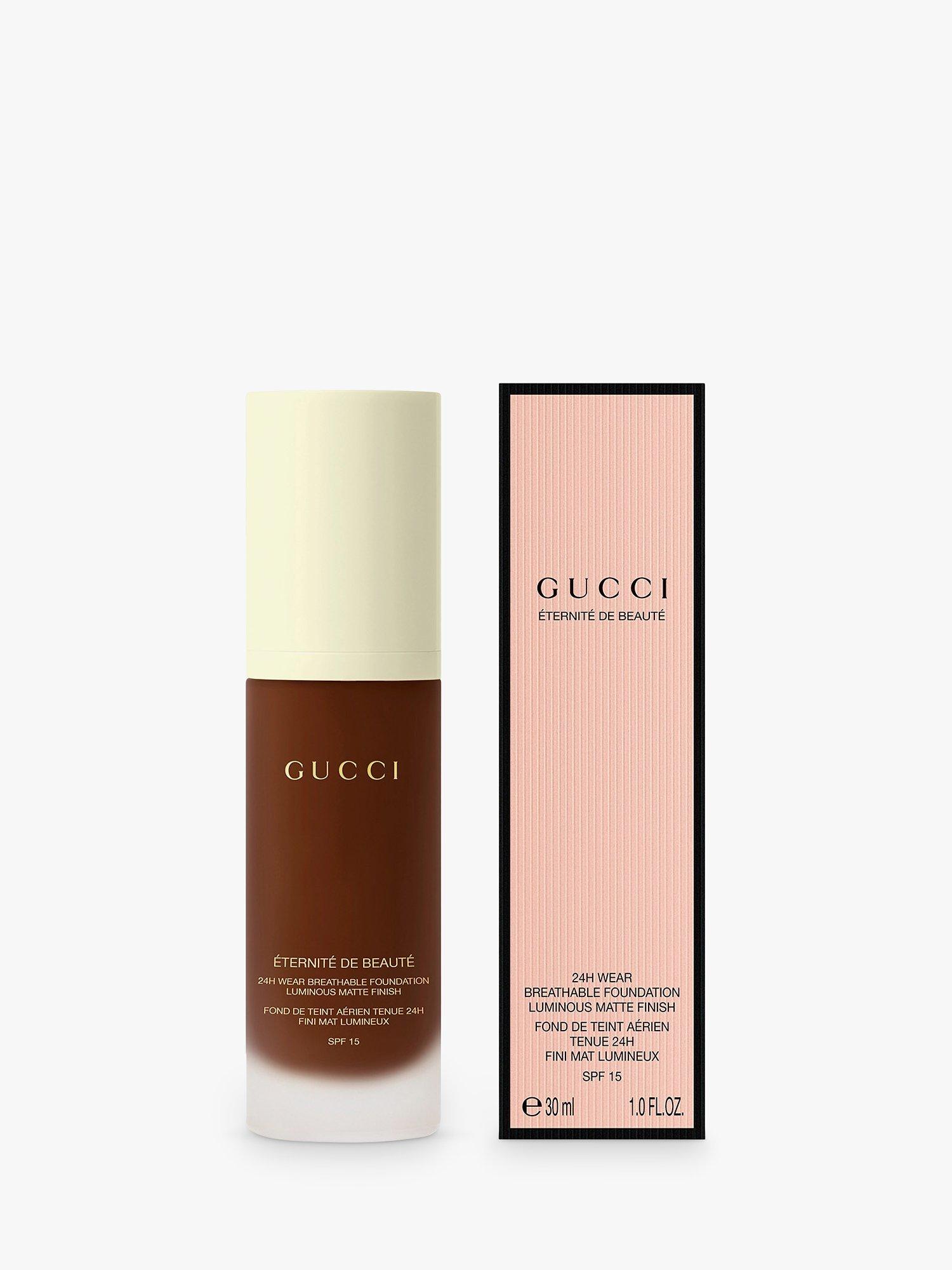 Gucci Éternité De Beauté foundation stays on the whole day, no matter how you play. This 24H, long-lasting Gucci foundation delivers a luminous-matte finish and full coverage in one drop, while feeling breathable, weightless, and comfortable. Available in 40 shades.