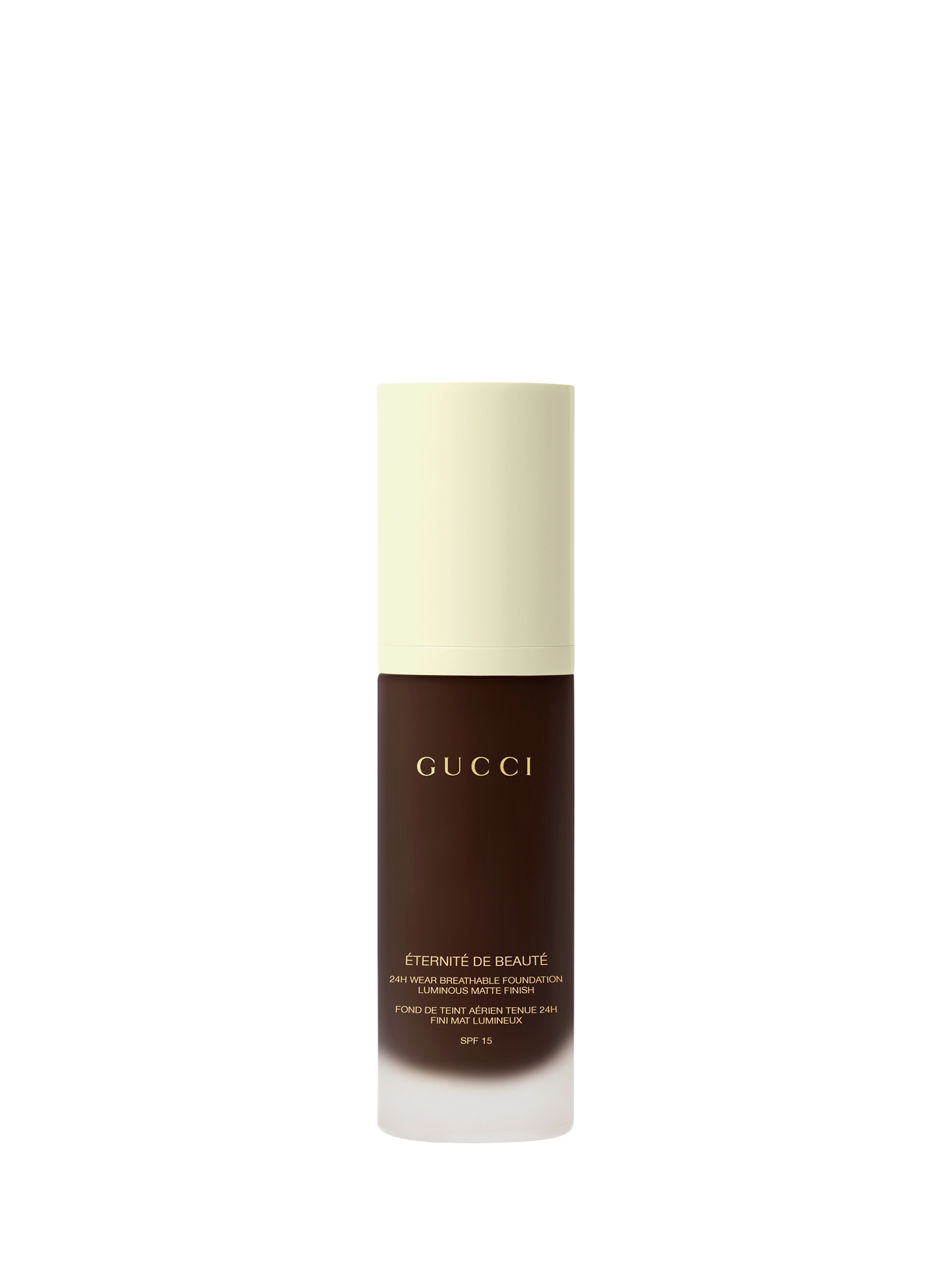Gucci Éternité De Beauté foundation stays on the whole day, no matter how you play. This 24H, long-lasting Gucci foundation delivers a luminous-matte finish and full coverage in one drop, while feeling breathable, weightless, and comfortable. Available in 40 shades.