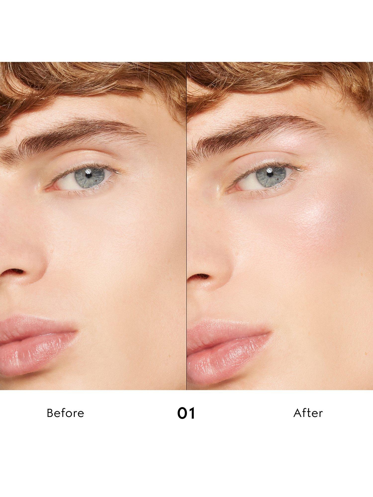 - Face: Using a brush or fingers, sweep the product on the high points of the face (upper cheekbones, brow bones, bridge of the nose and Cupid’s bow) to highlight. Build and blend to intensify the glow as desired