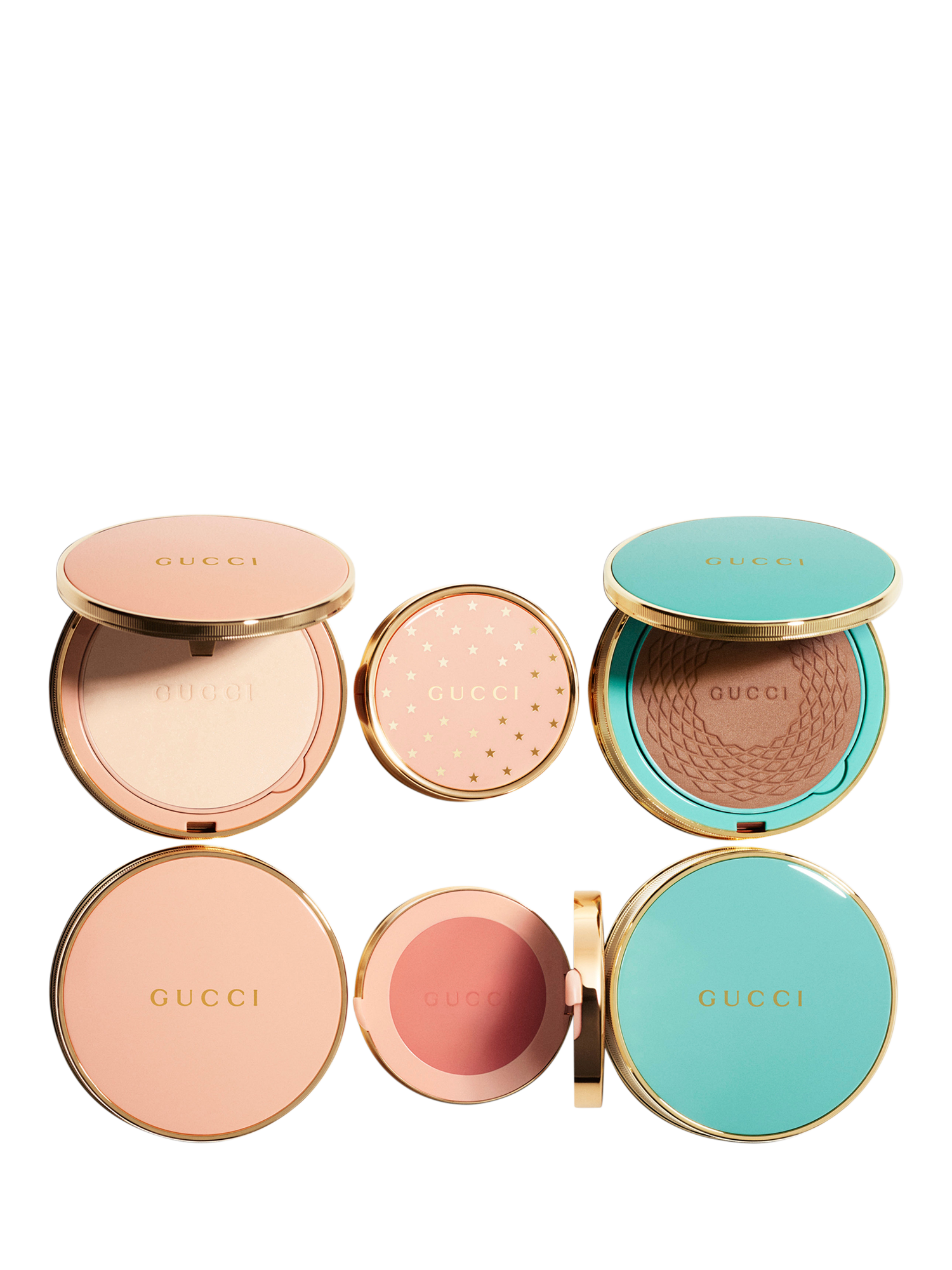 An object of desire that inspires. Embellished with pastel pink enamel and a playful star pattern, Gucci Blush De Beauté’s covetable compact is dressed in a vintage-inspired gold-toned design. Transforming on-the-go touch-ups into a special ritual, the compact reveals a tenderly embossed makeup powder with the emblematic Gucci logo within.