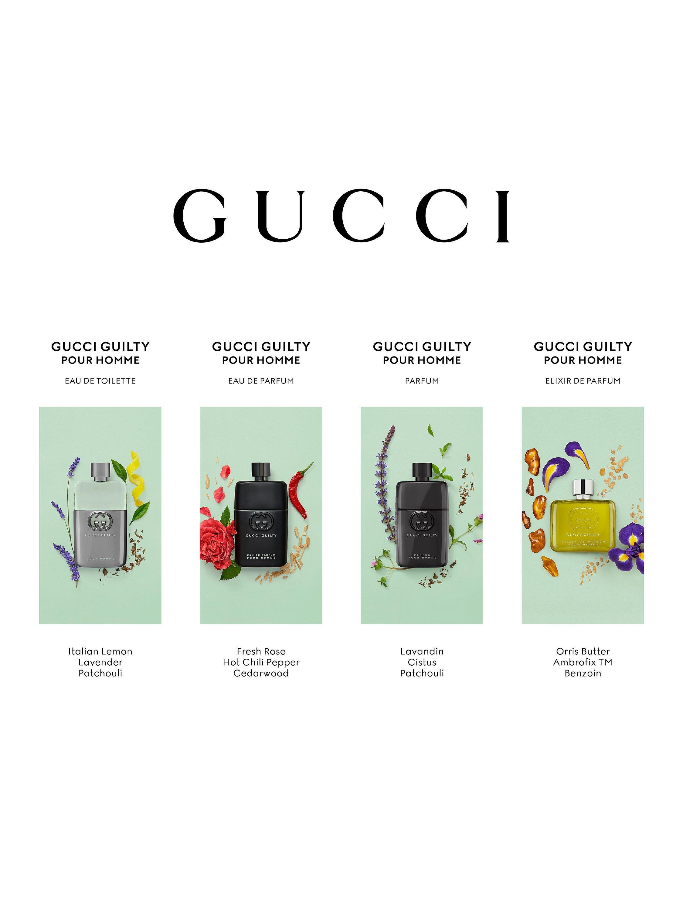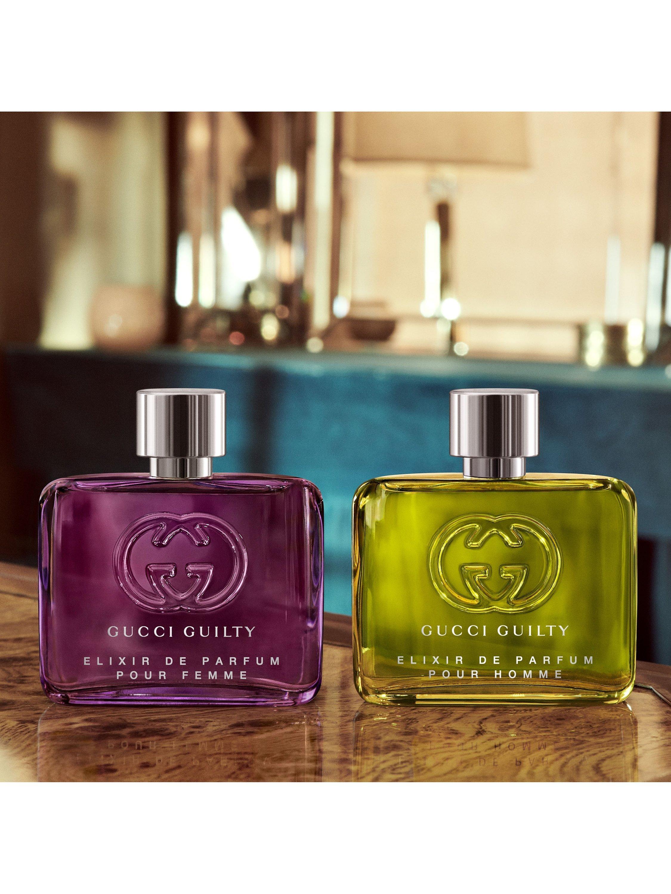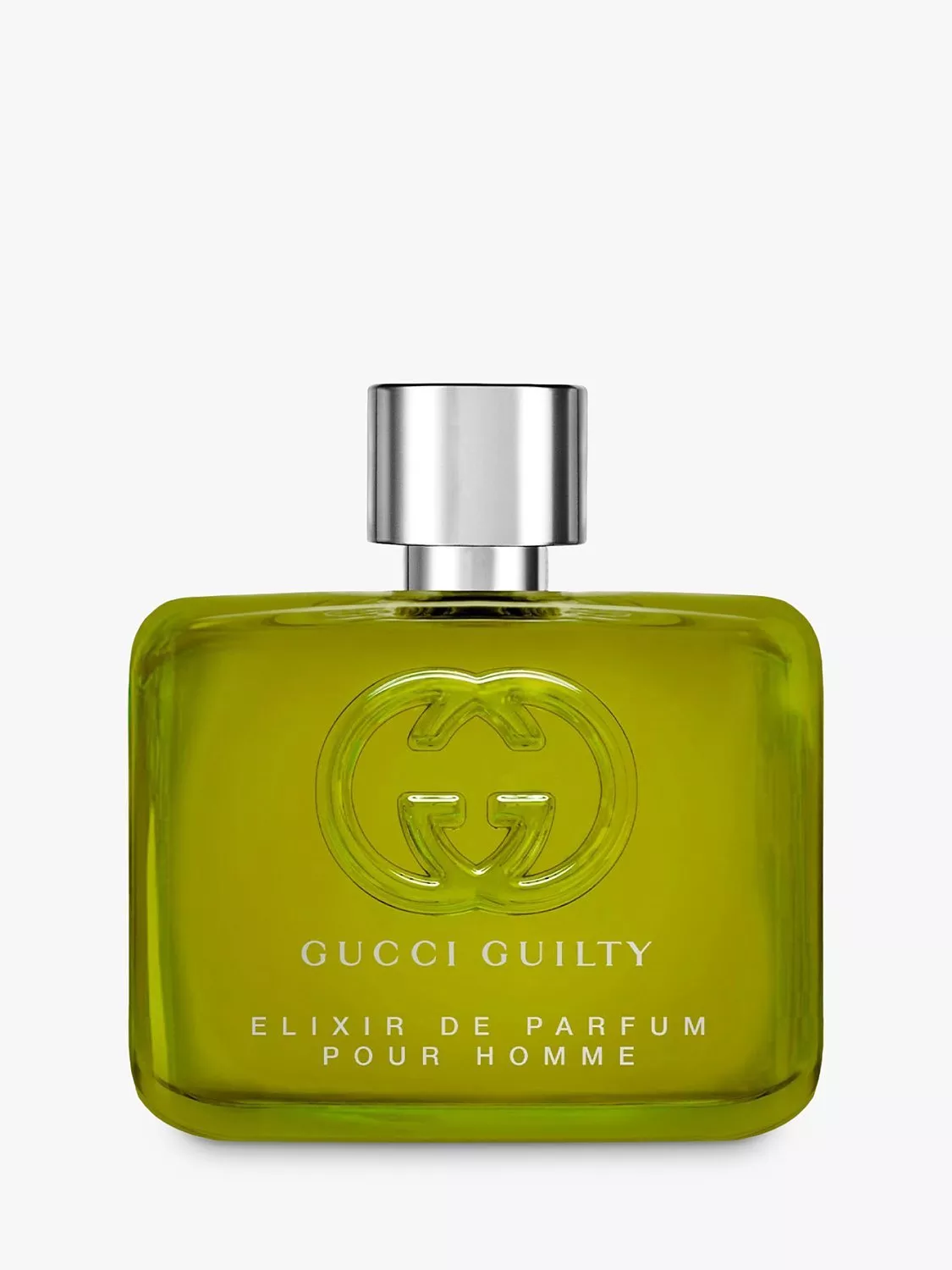Guilty Elixirs de Parfum are a daring assertion, a colourful extraversion. Gucci Guilty Elixir de Parfum for men is an ambery leather fragrance. This irresistible scent features a sensual vanillin and Ambrofix base, a flamboyant orris butter heart, and a smoky nutmeg top note.